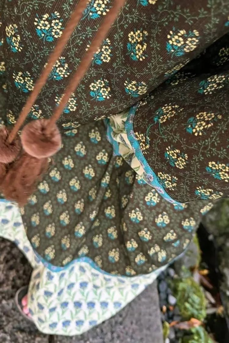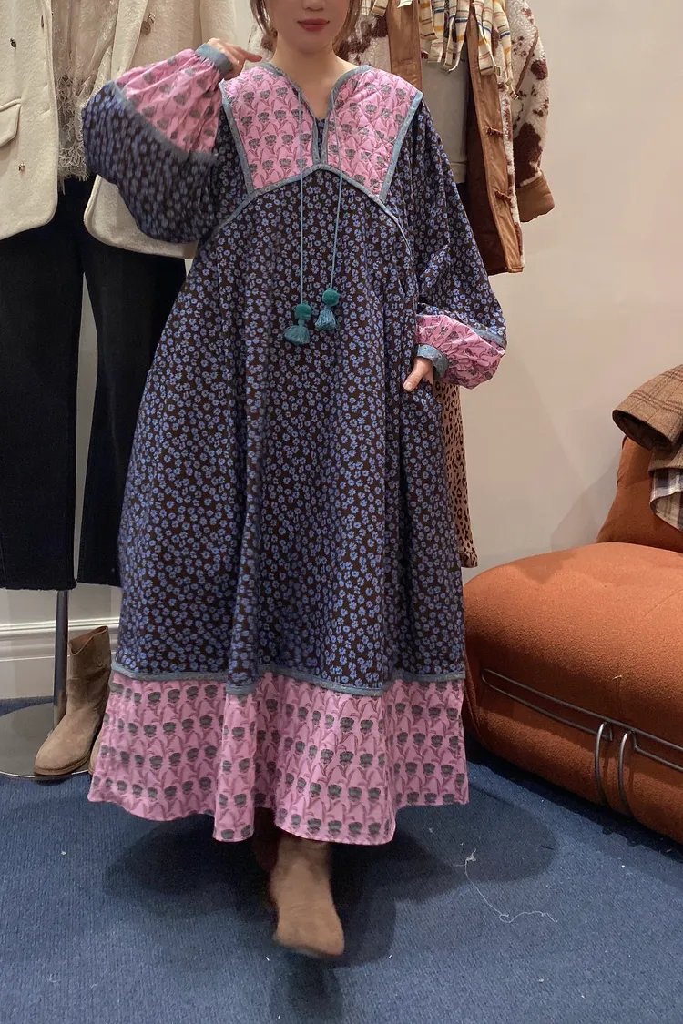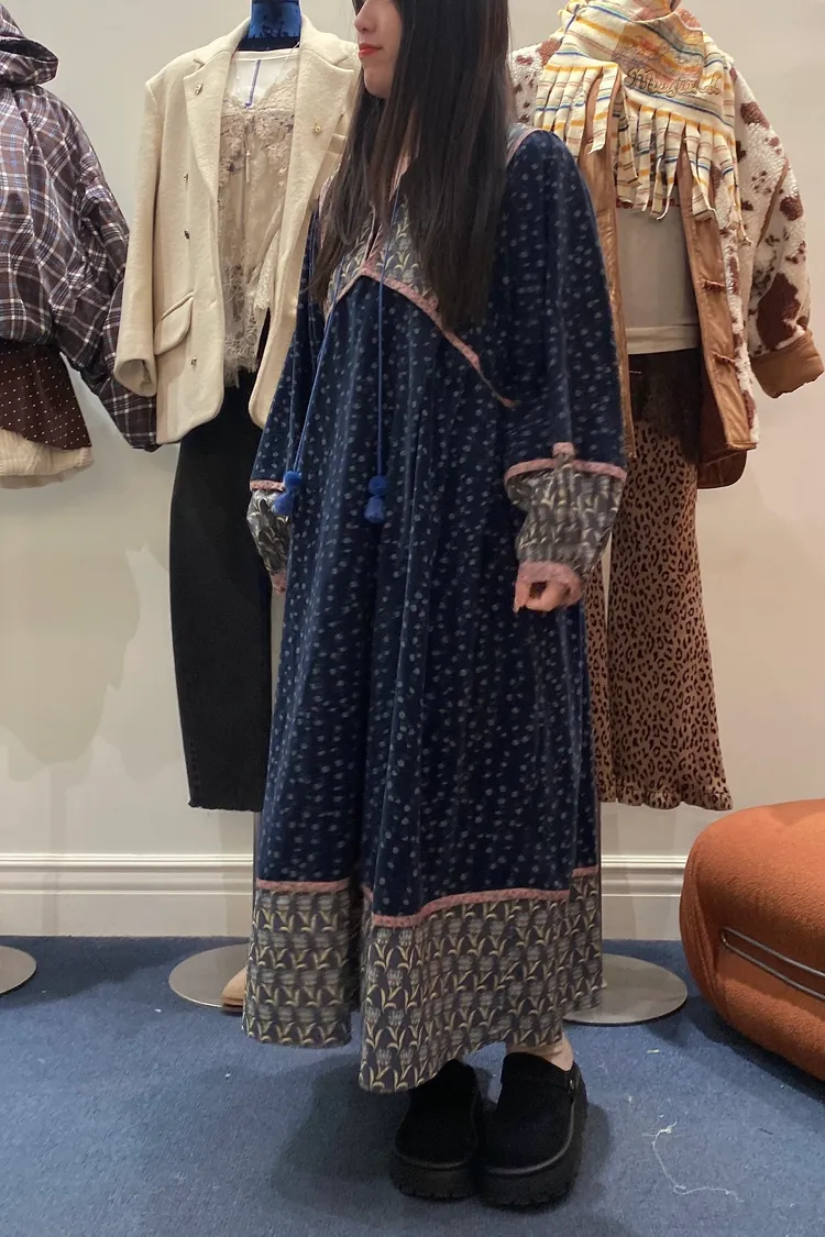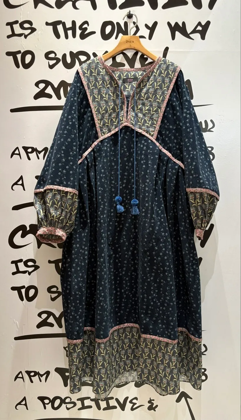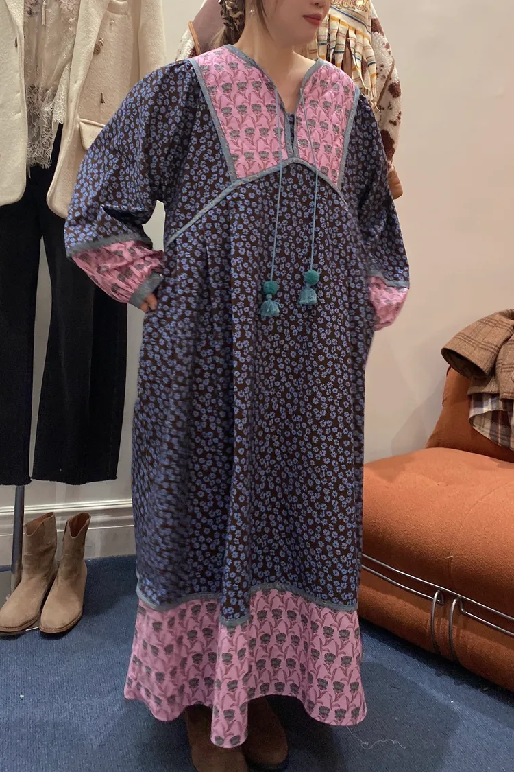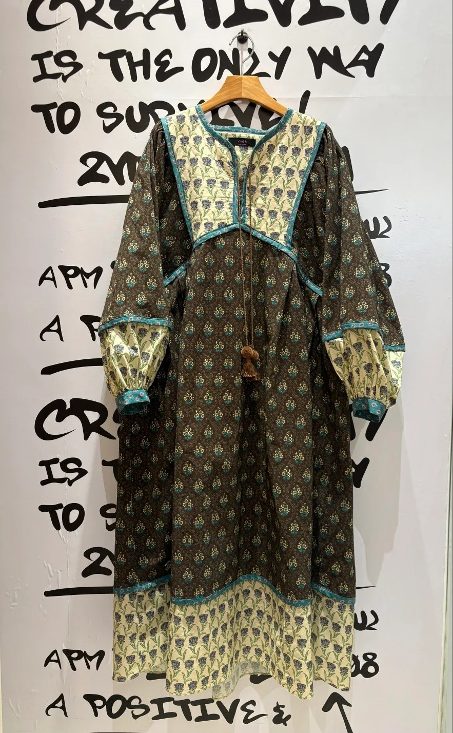 不同碎花布料拼接成獨特藝術氛圍 領口、手袖、裙擺都做了撞色滾邊點綴,細節超級加分 棉料材質、胸前拼接部分有鋪棉,暖度UP 背殺家拿手的撞色拼接設計款 寬鬆傘狀裙襬,S-XL妞都可以穿 領口繫帶除了流蘇還有蓬蓬的小毛球~ 有口袋、有內襯 走在街上像走進一幅小畫作,溫柔又充滿故事感