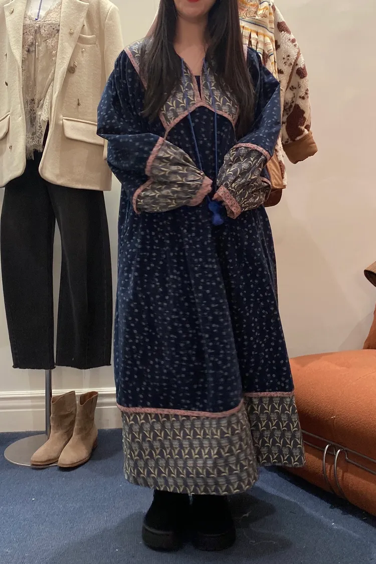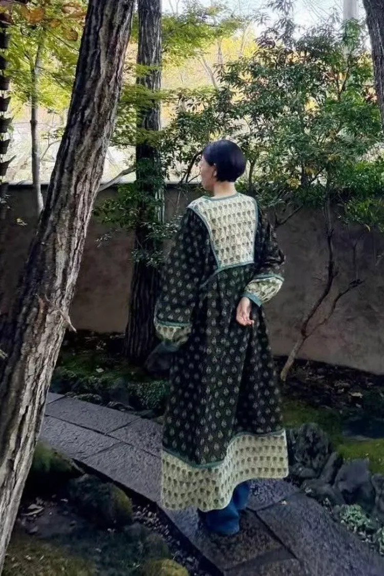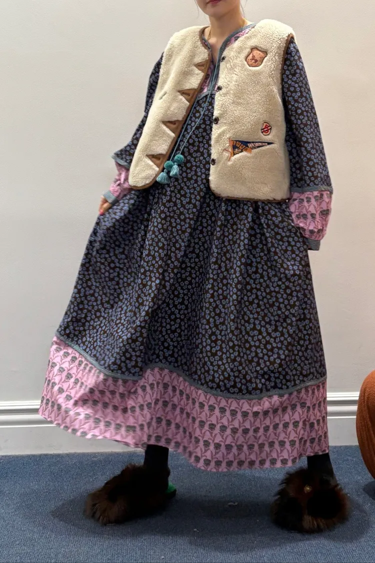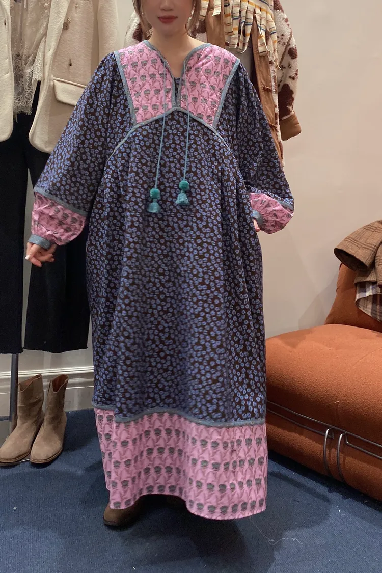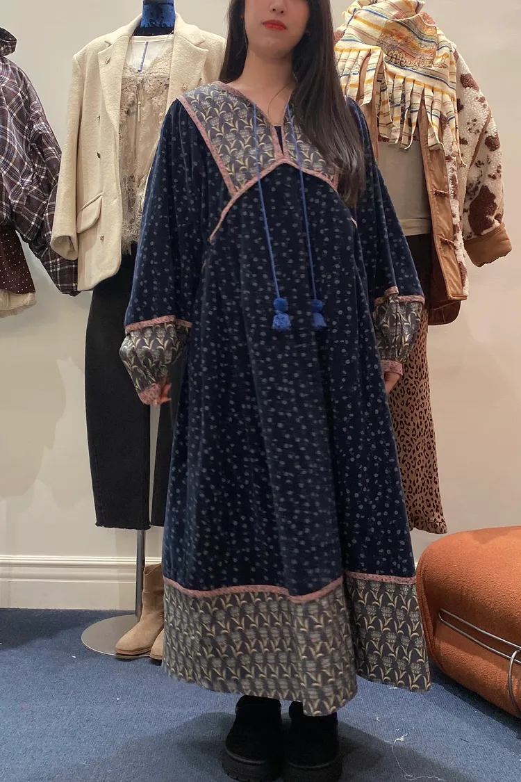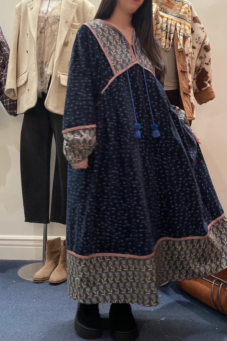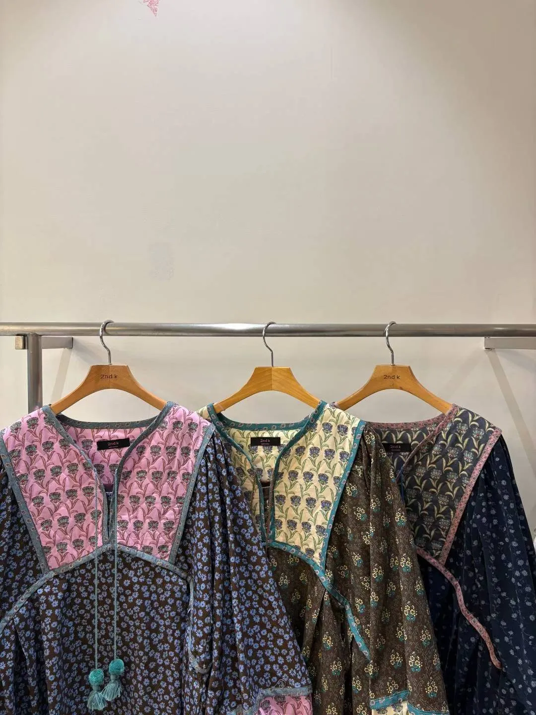 不同碎花布料拼接成獨特藝術氛圍 領口、手袖、裙擺都做了撞色滾邊點綴,細節超級加分 棉料材質、胸前拼接部分有鋪棉,暖度UP 背殺家拿手的撞色拼接設計款 寬鬆傘狀裙襬,S-XL妞都可以穿 領口繫帶除了流蘇還有蓬蓬的小毛球~ 有口袋、有內襯 走在街上像走進一幅小畫作,溫柔又充滿故事感