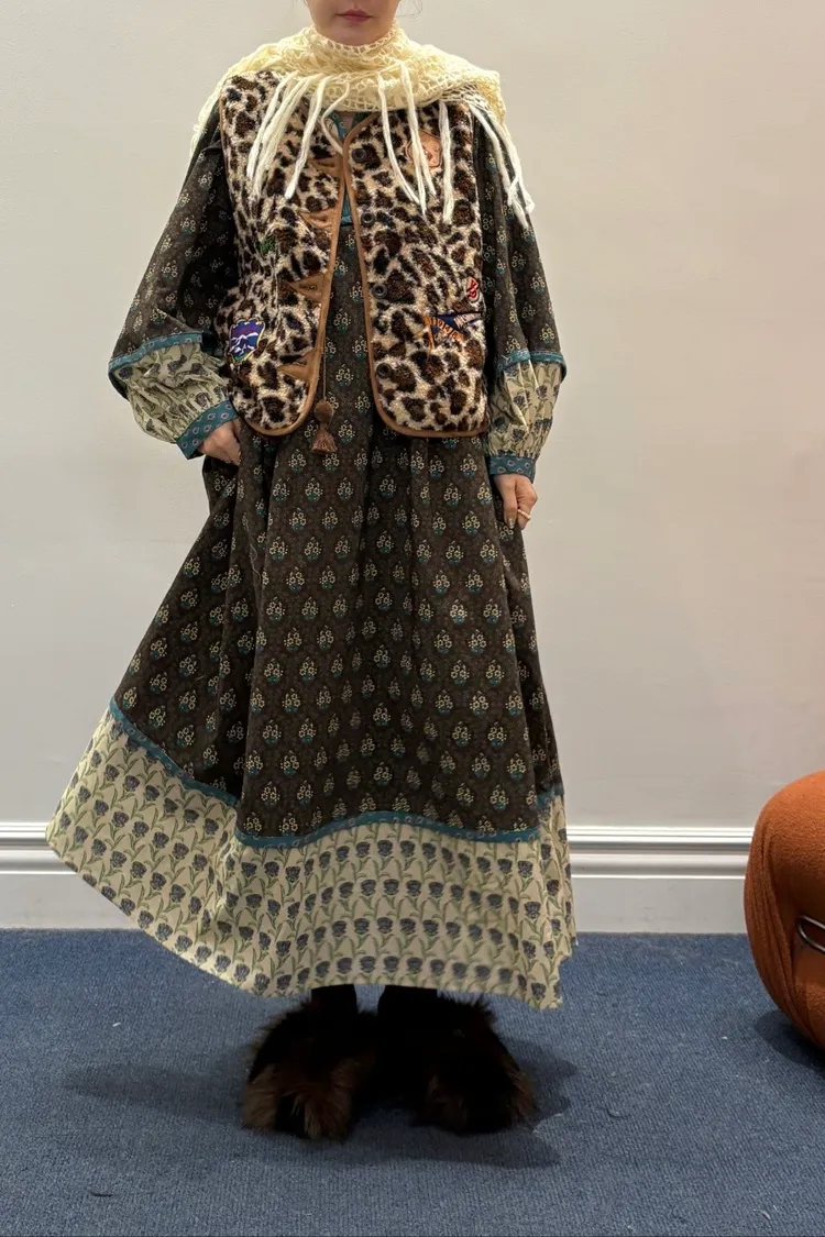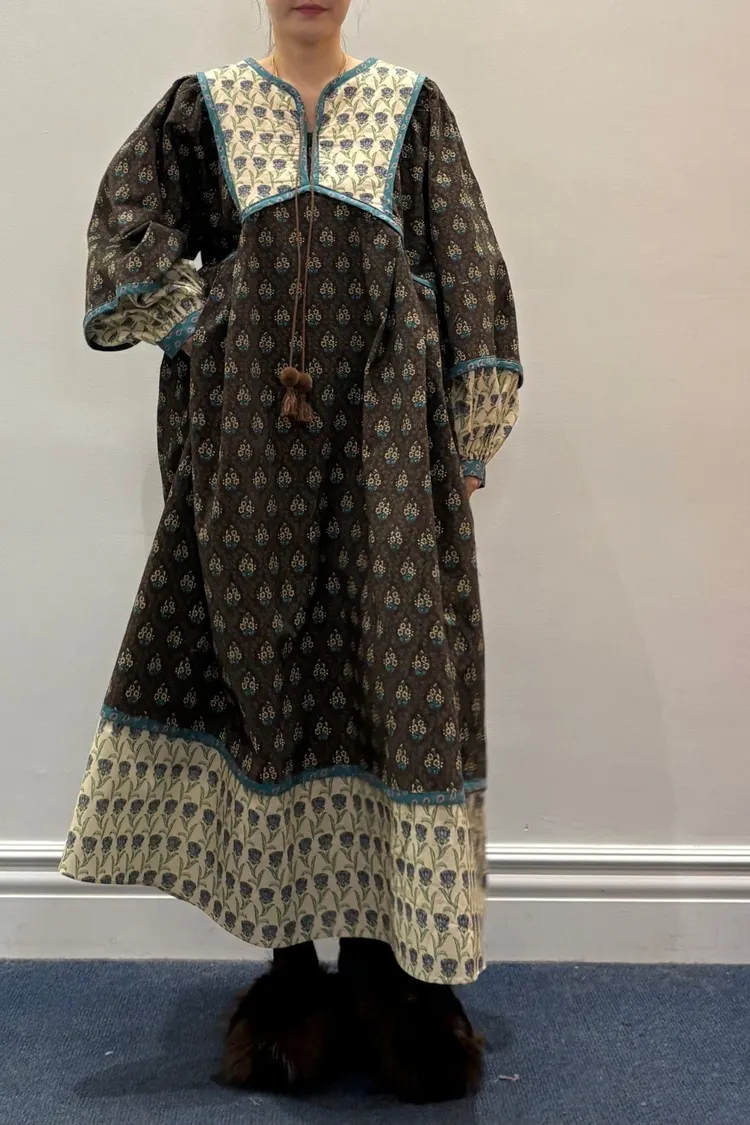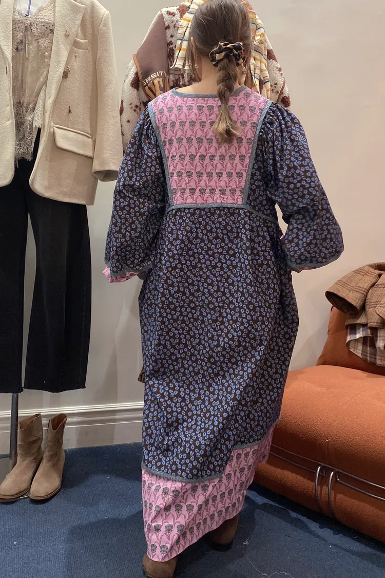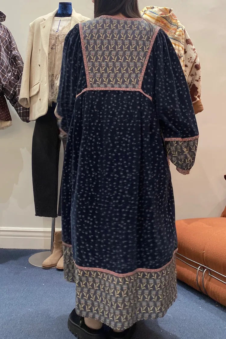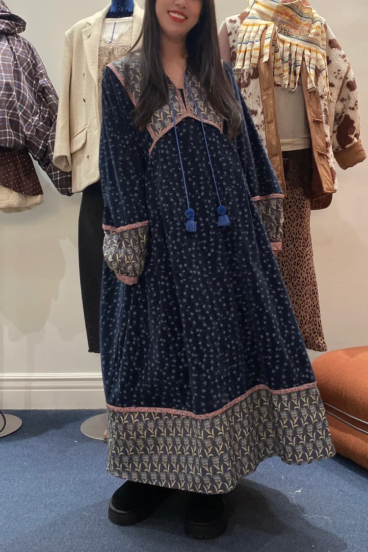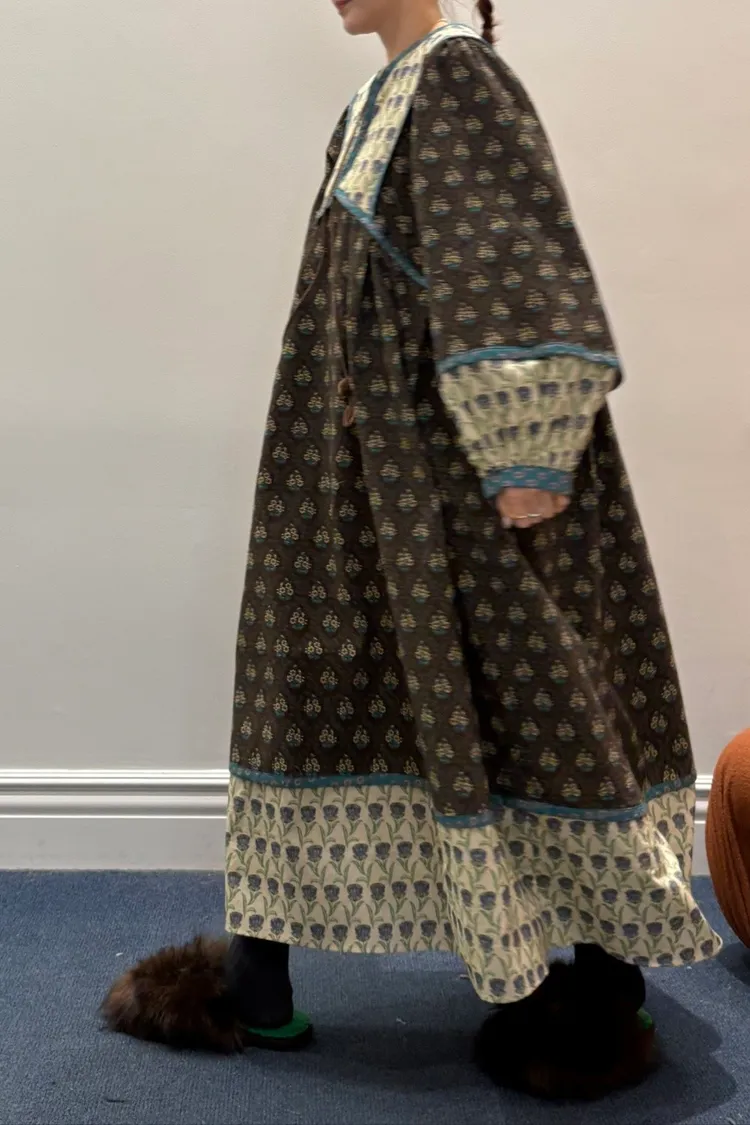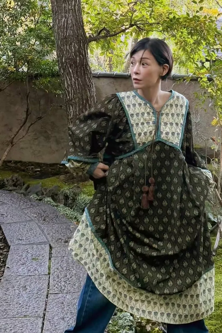 不同碎花布料拼接成獨特藝術氛圍 領口、手袖、裙擺都做了撞色滾邊點綴,細節超級加分 棉料材質、胸前拼接部分有鋪棉,暖度UP 背殺家拿手的撞色拼接設計款 寬鬆傘狀裙襬,S-XL妞都可以穿 領口繫帶除了流蘇還有蓬蓬的小毛球~ 有口袋、有內襯 走在街上像走進一幅小畫作,溫柔又充滿故事感