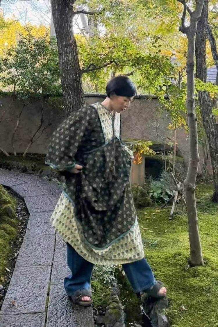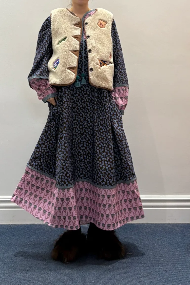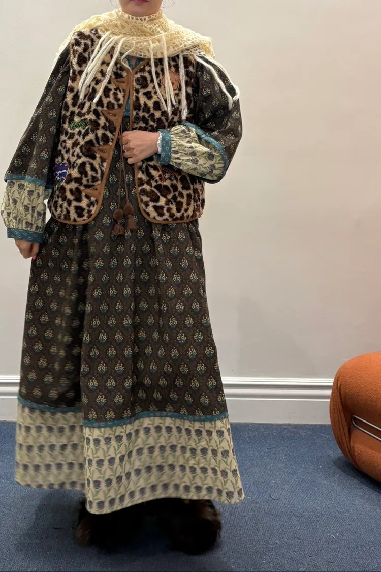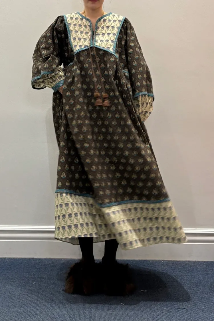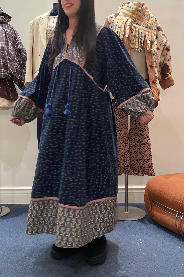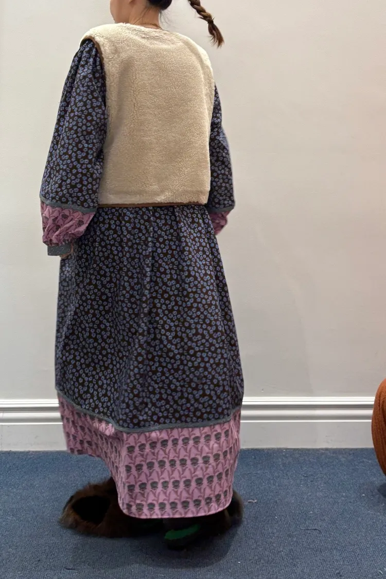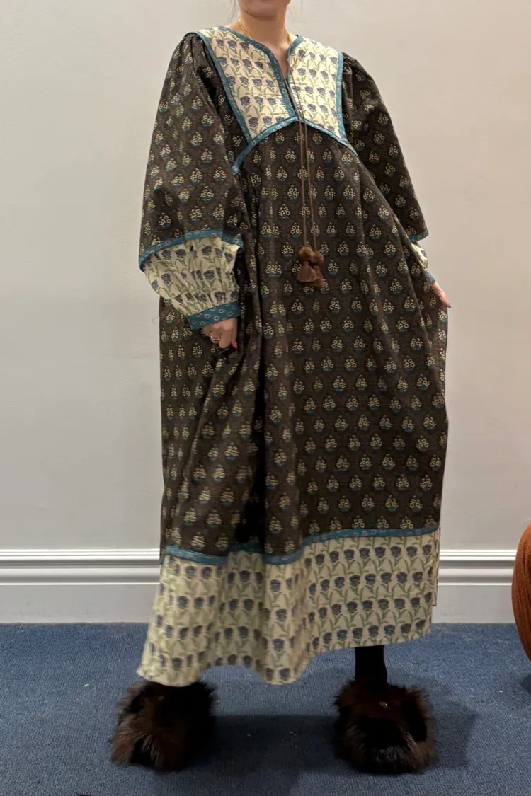 不同碎花布料拼接成獨特藝術氛圍 領口、手袖、裙擺都做了撞色滾邊點綴,細節超級加分 棉料材質、胸前拼接部分有鋪棉,暖度UP 背殺家拿手的撞色拼接設計款 寬鬆傘狀裙襬,S-XL妞都可以穿 領口繫帶除了流蘇還有蓬蓬的小毛球~ 有口袋、有內襯 走在街上像走進一幅小畫作,溫柔又充滿故事感