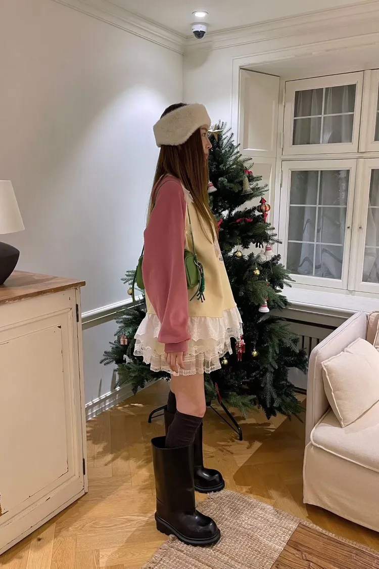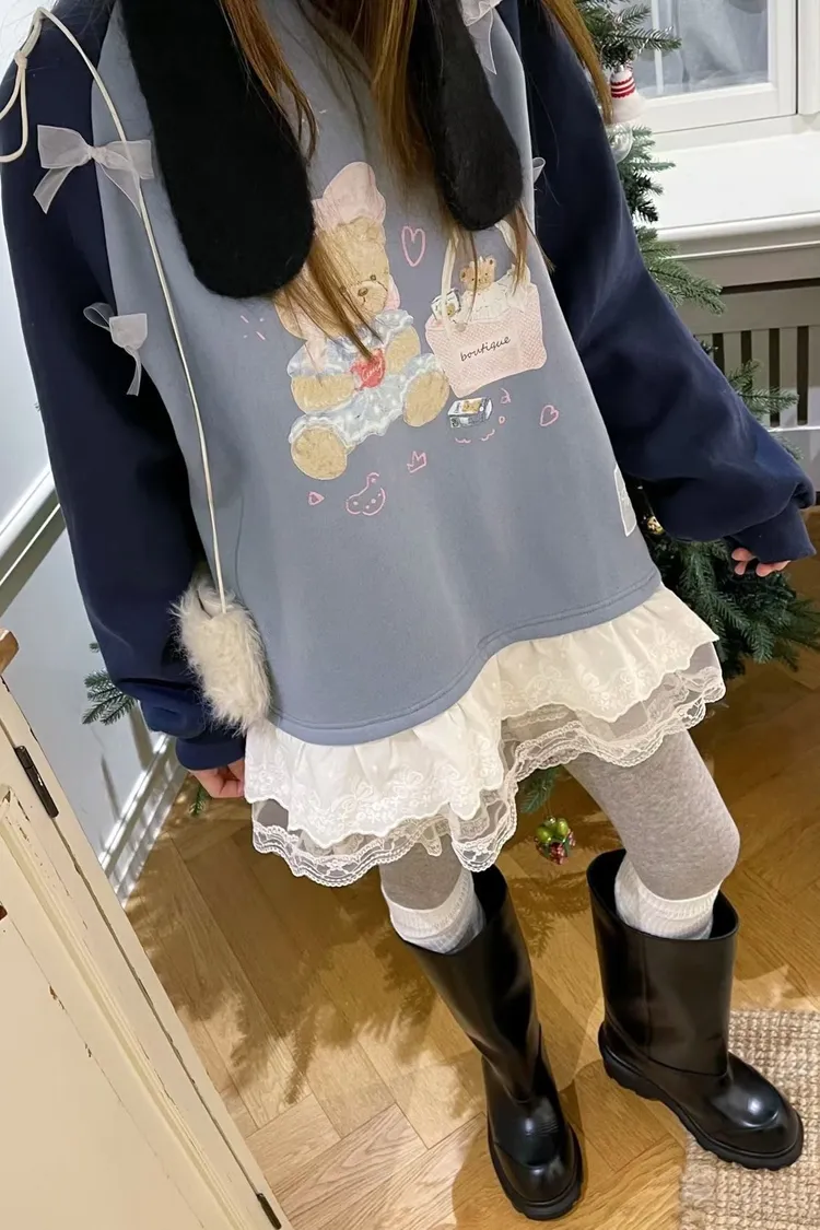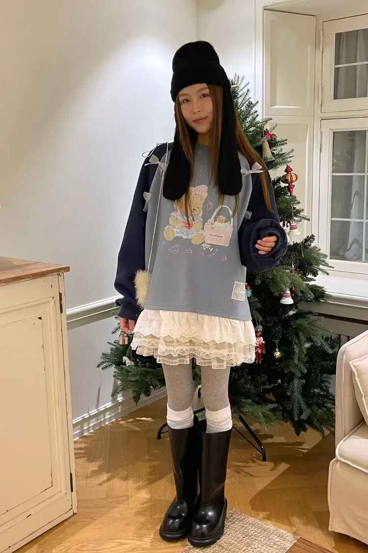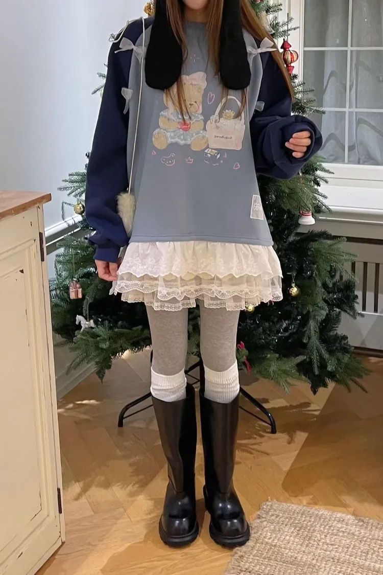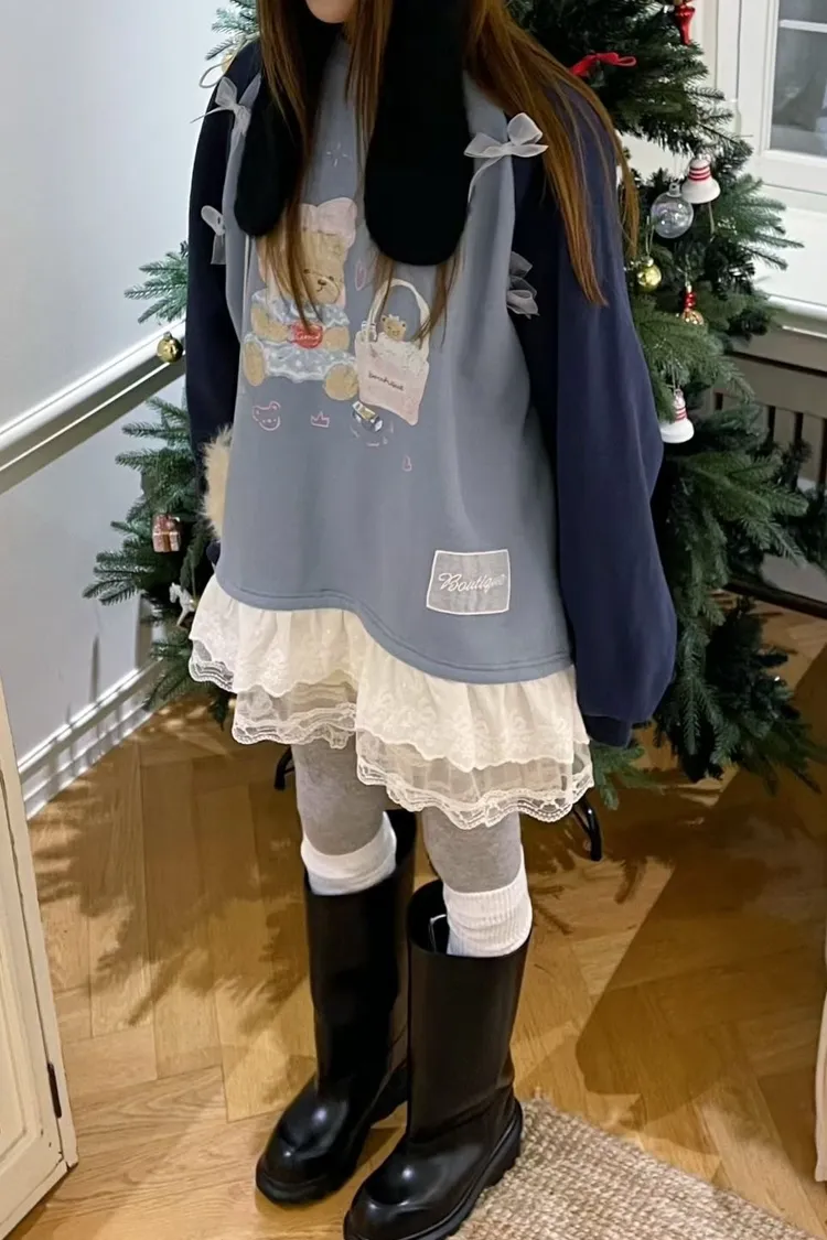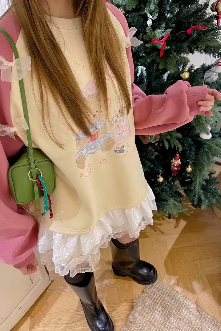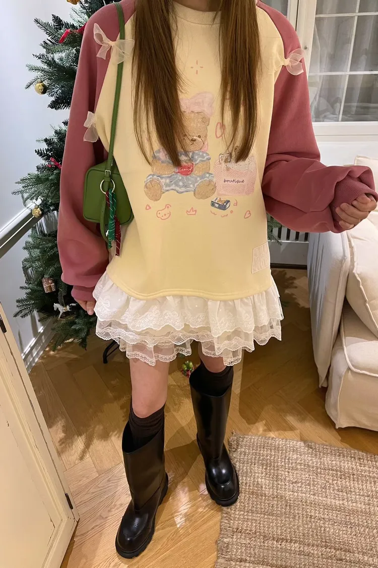 棉料材質、內裡柔軟細絨觸感很溫柔,落肩寬鬆蓋臀版型自在不拘束 撞色手袖拼接增加可愛亮點胸前小熊在辦家家酒喝下午茶的畫面超療癒 四個蕾絲蝴蝶結點綴得剛剛好 下擺有雙層拼接,一層是刺繡布蕾絲、一層是網紗蕾絲每一步都像在撒糖