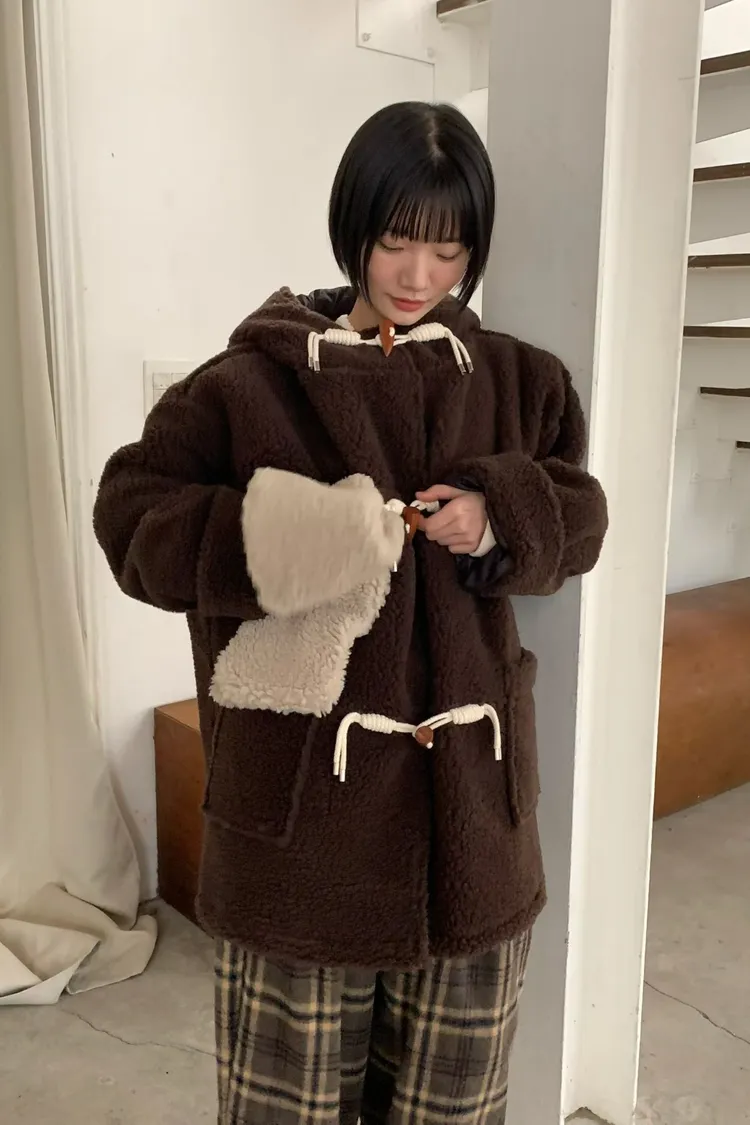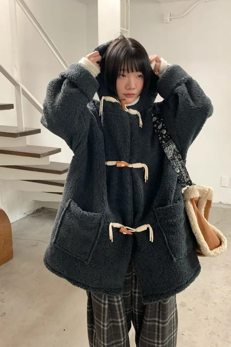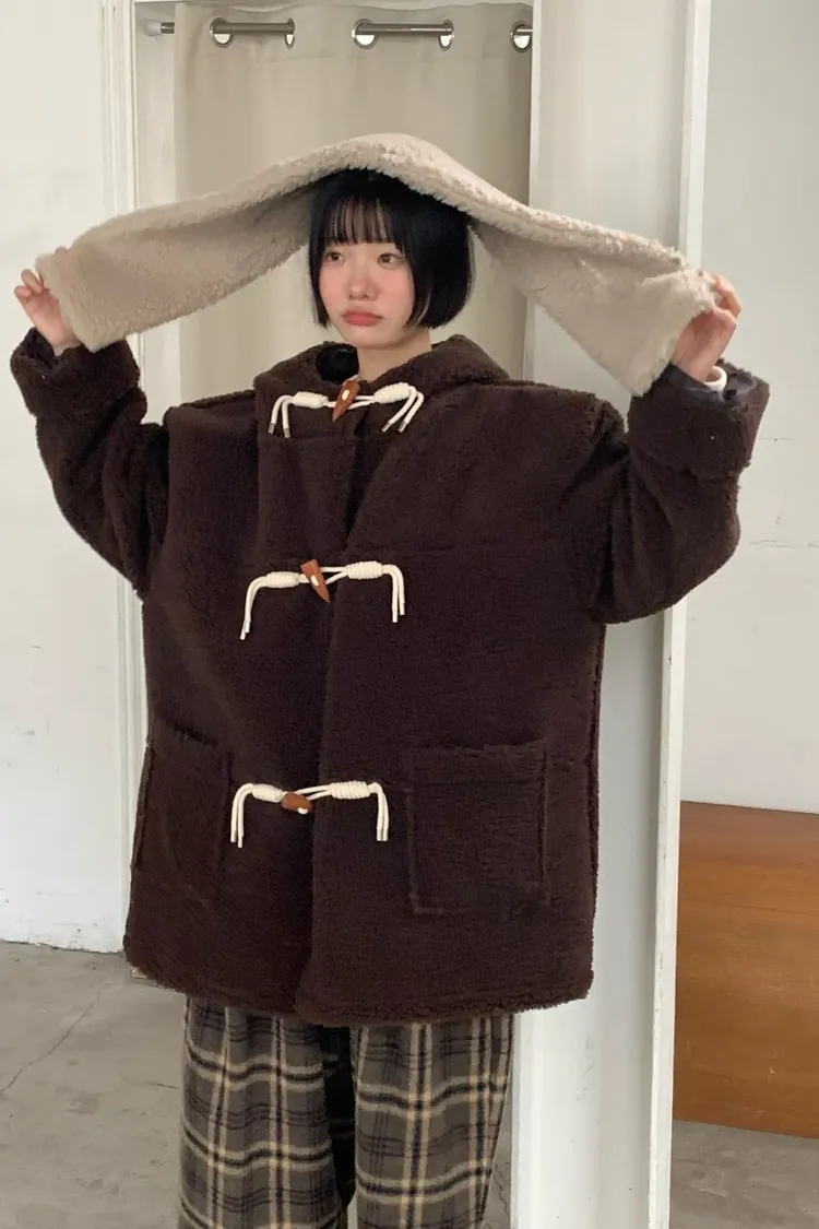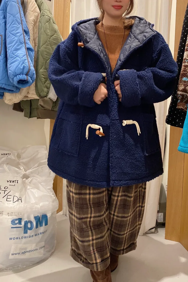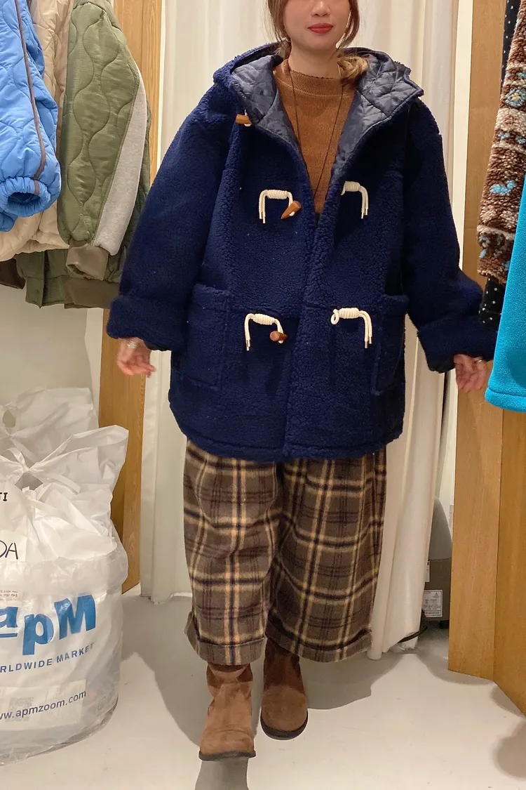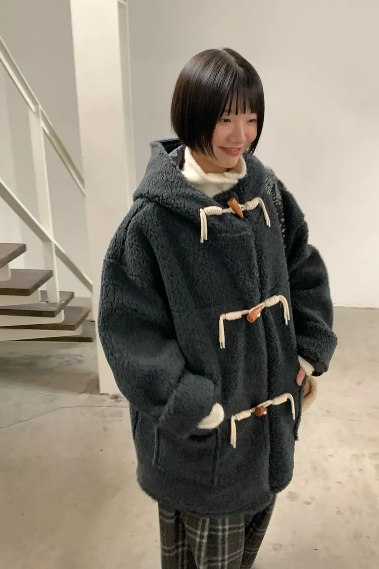 QQ羊羔毛面料柔軟有彈性,內裡有鋪棉~學院牛角扣帶點日系俏皮感