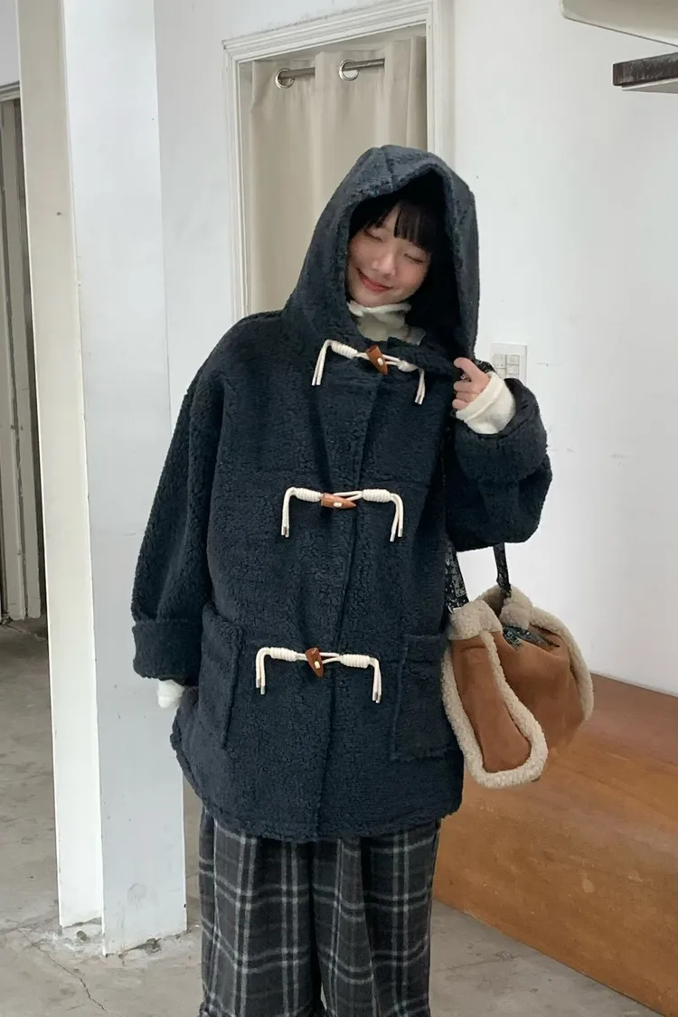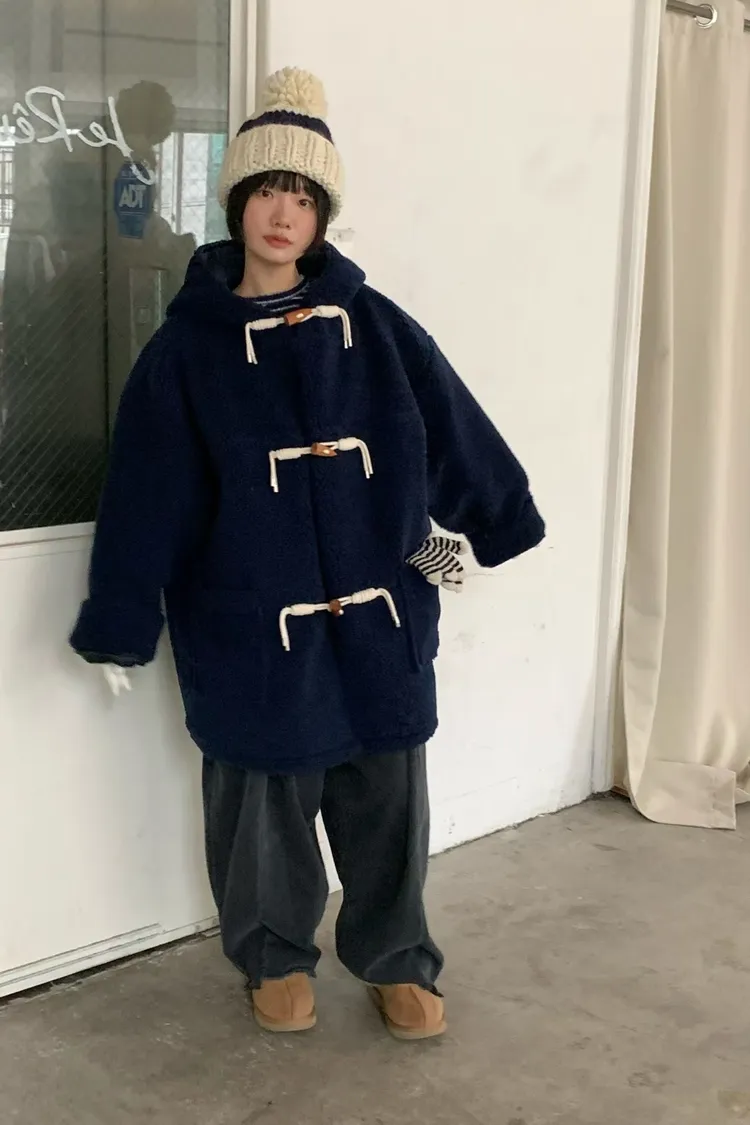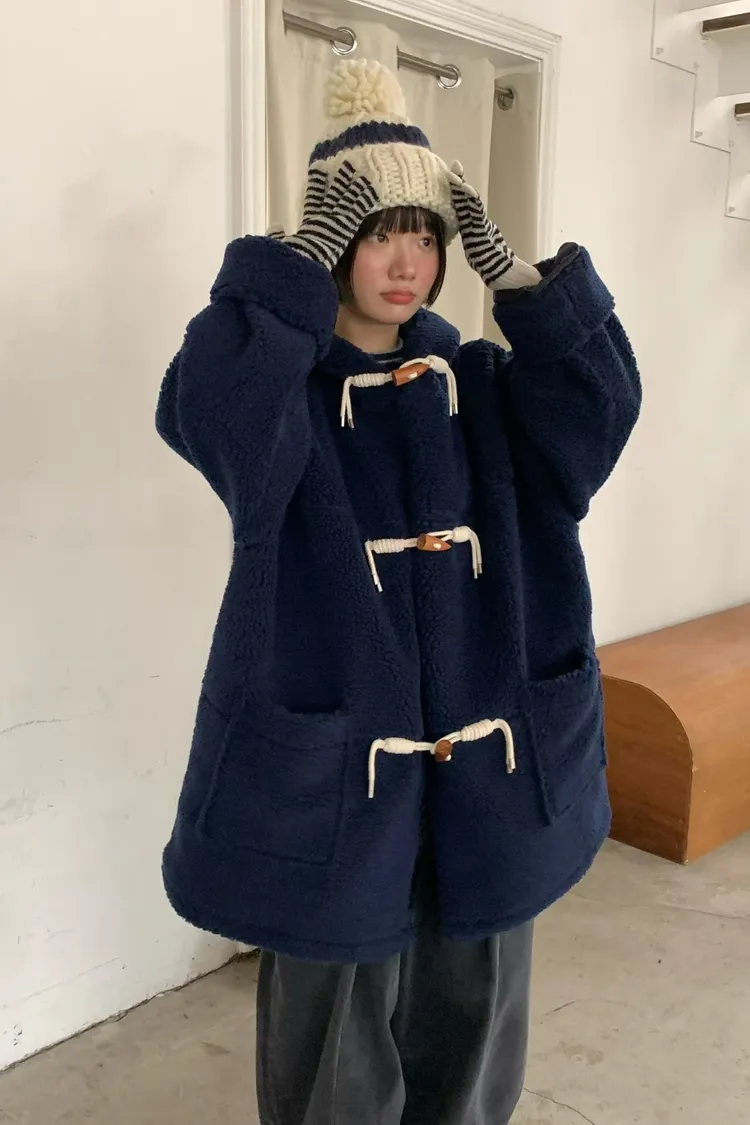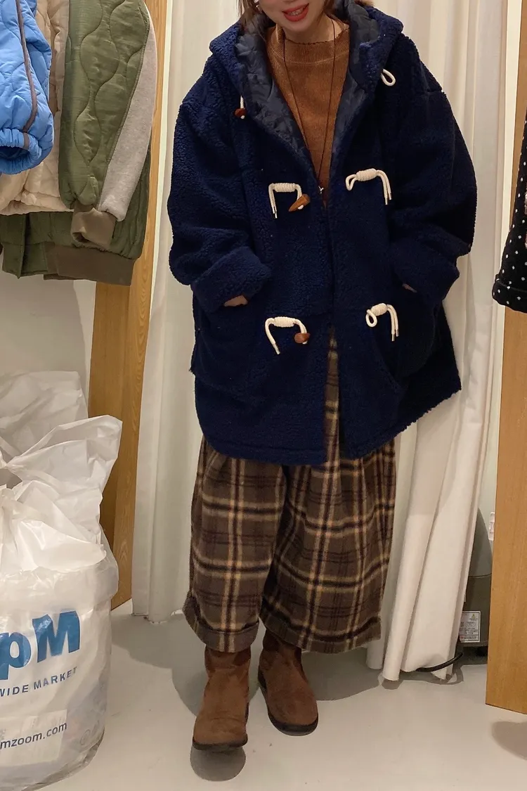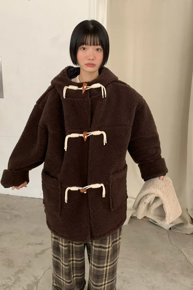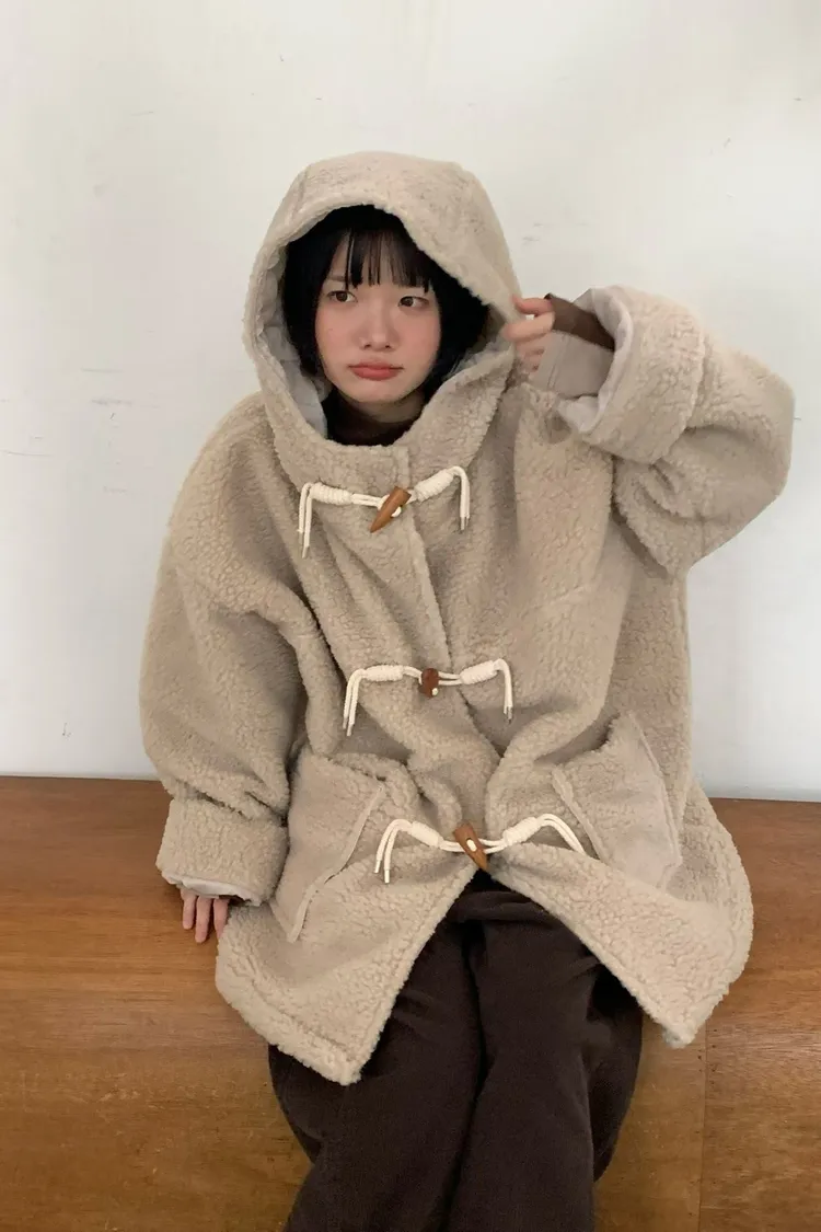 QQ羊羔毛面料柔軟有彈性,內裡有鋪棉~學院牛角扣帶點日系俏皮感