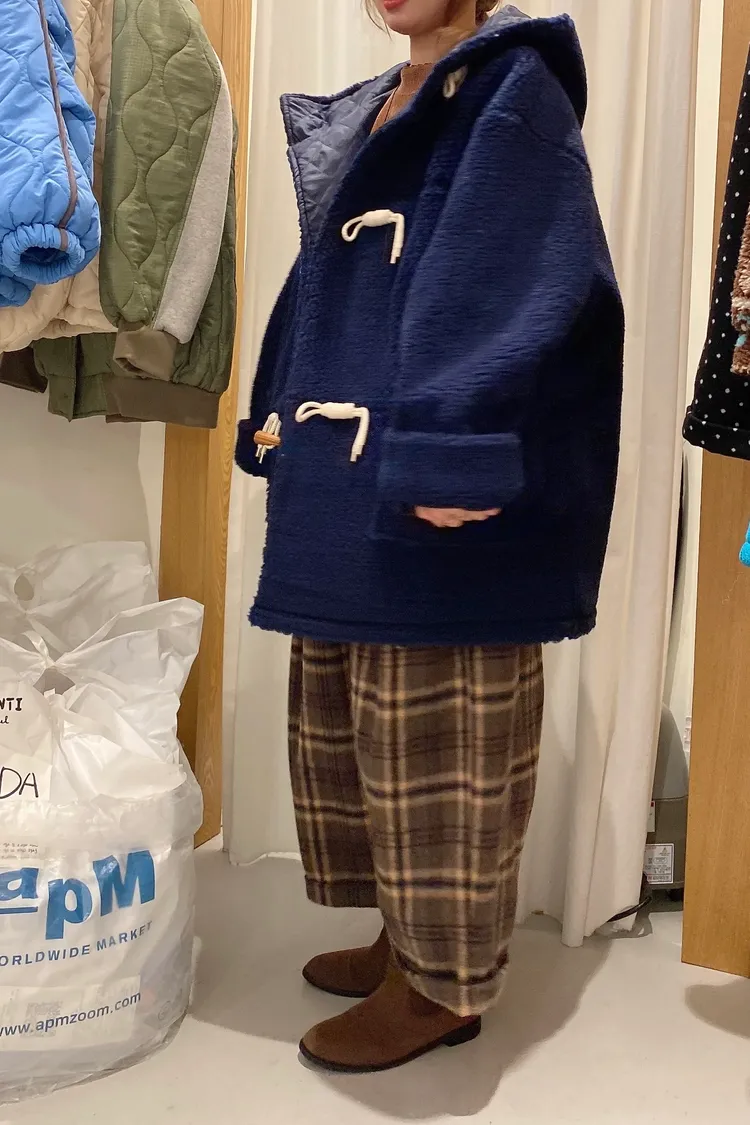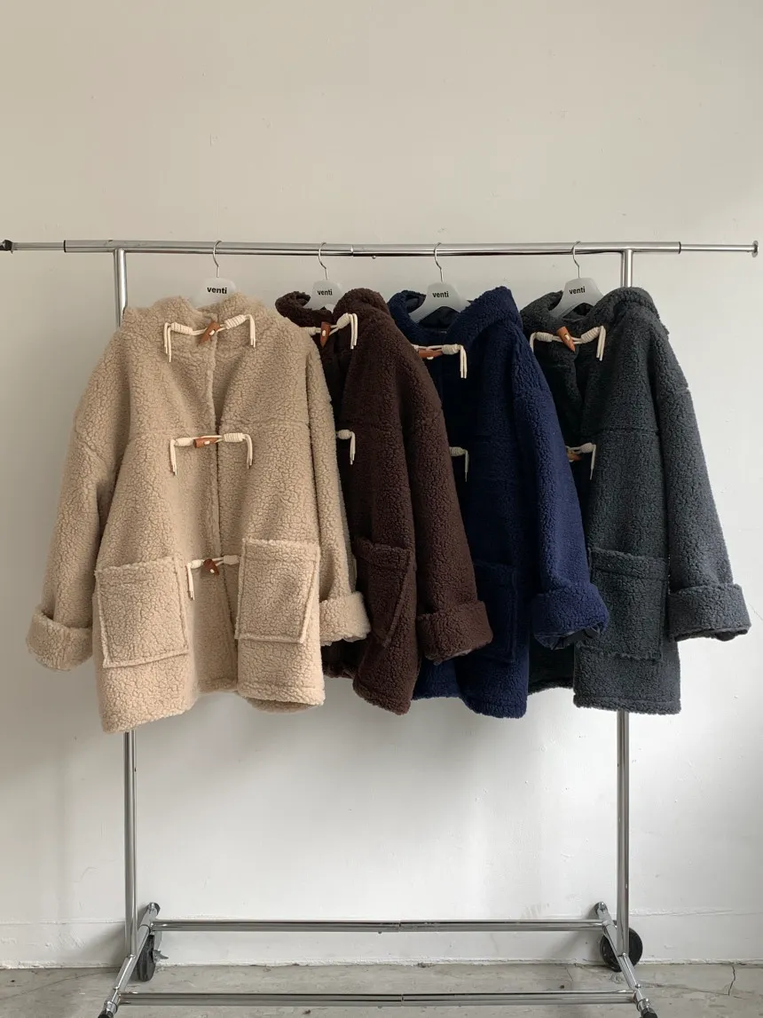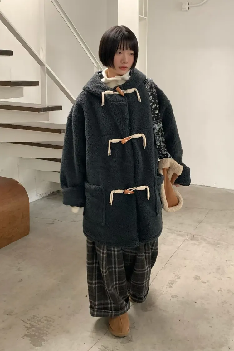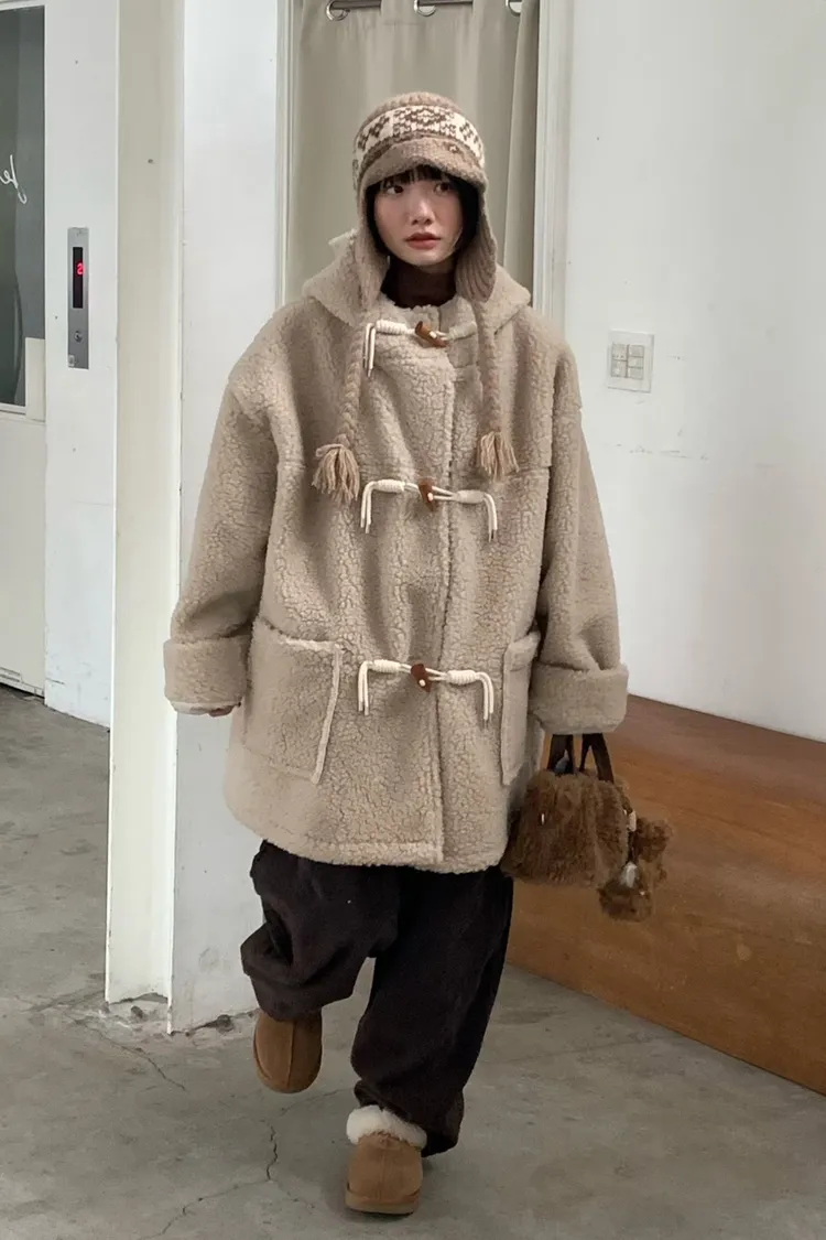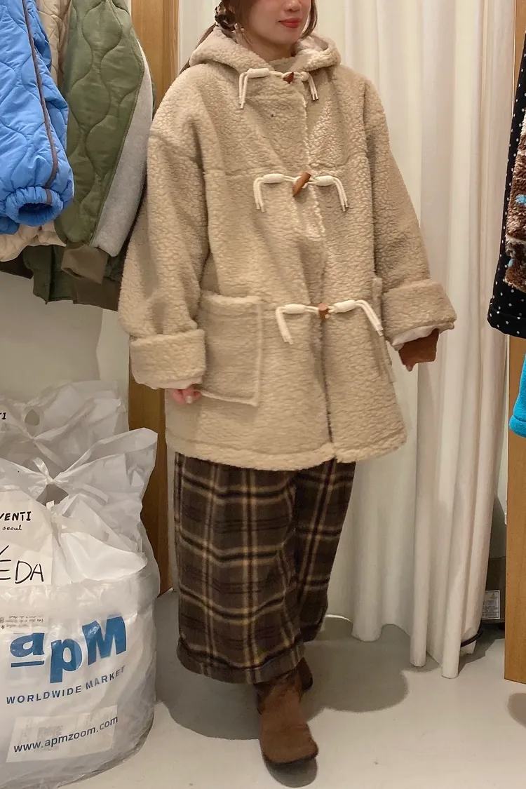 QQ羊羔毛面料柔軟有彈性,內裡有鋪棉~學院牛角扣帶點日系俏皮感