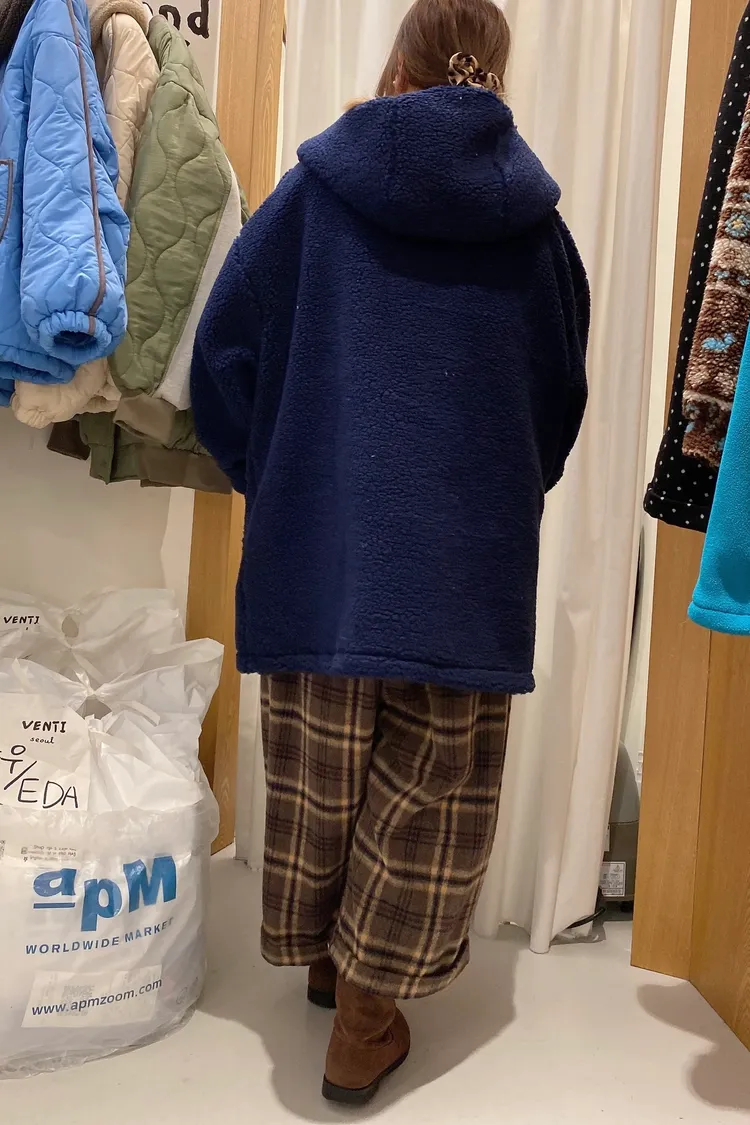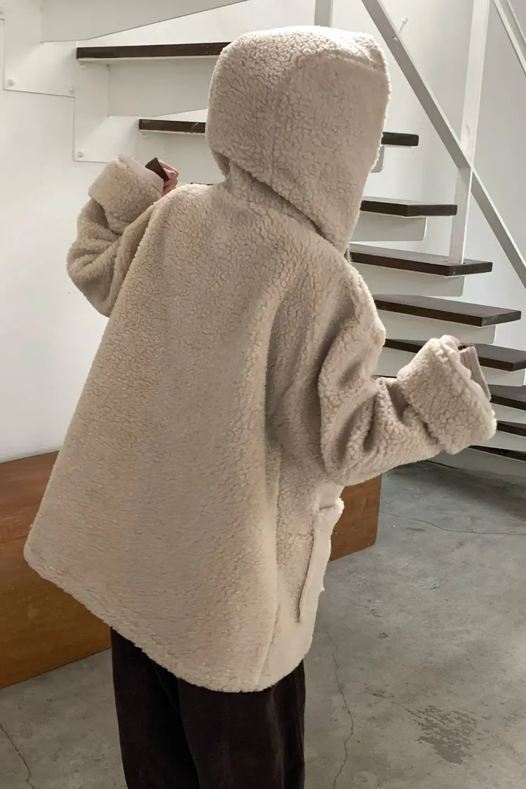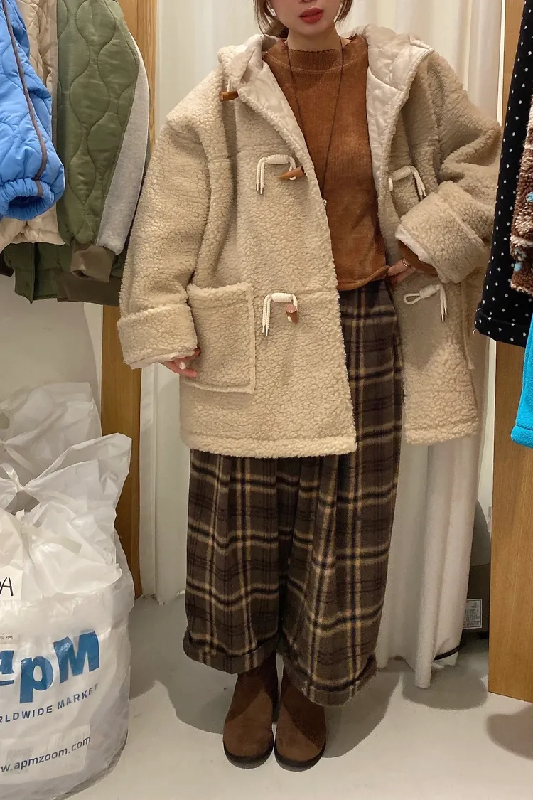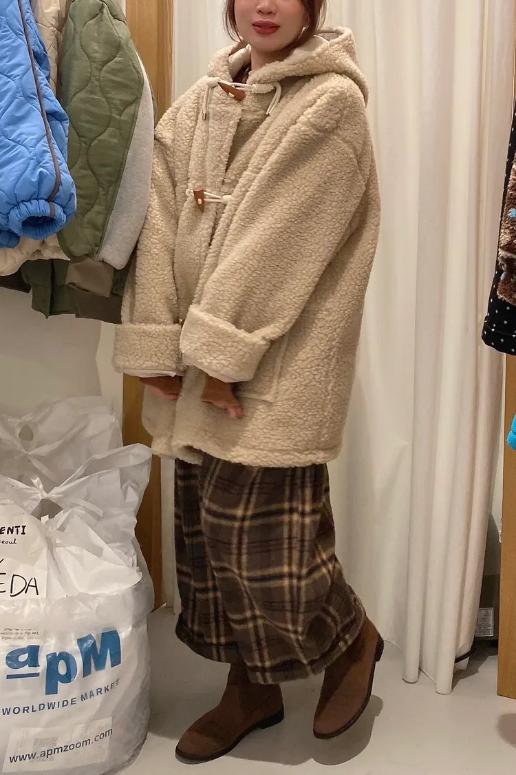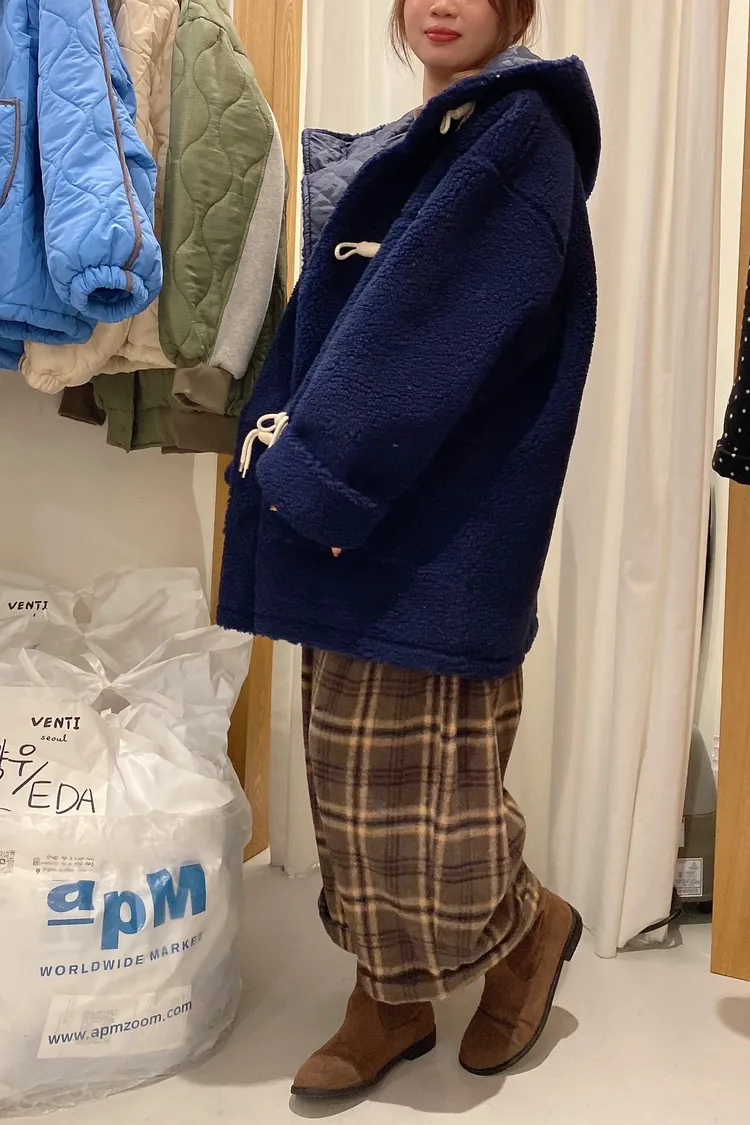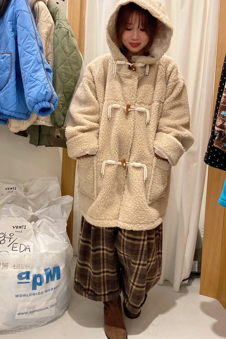 QQ羊羔毛面料柔軟有彈性,內裡有鋪棉~學院牛角扣帶點日系俏皮感