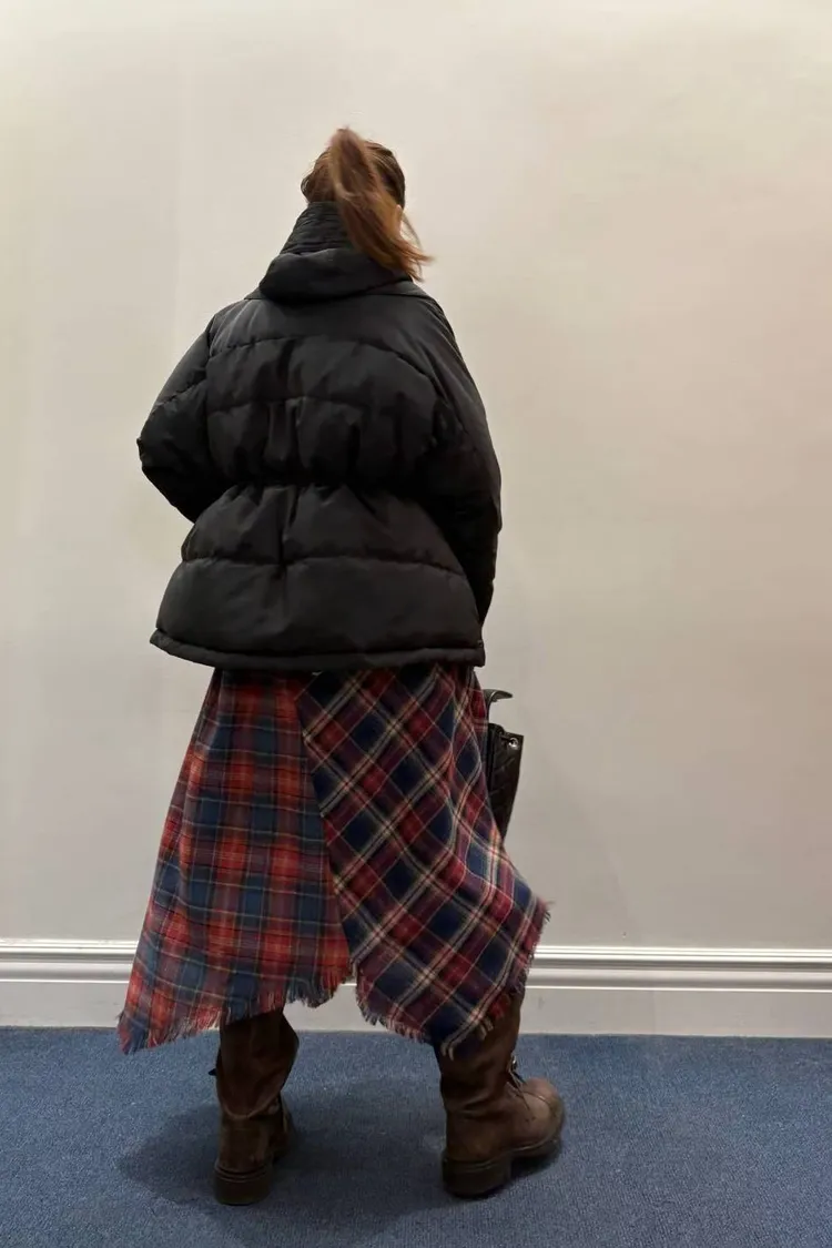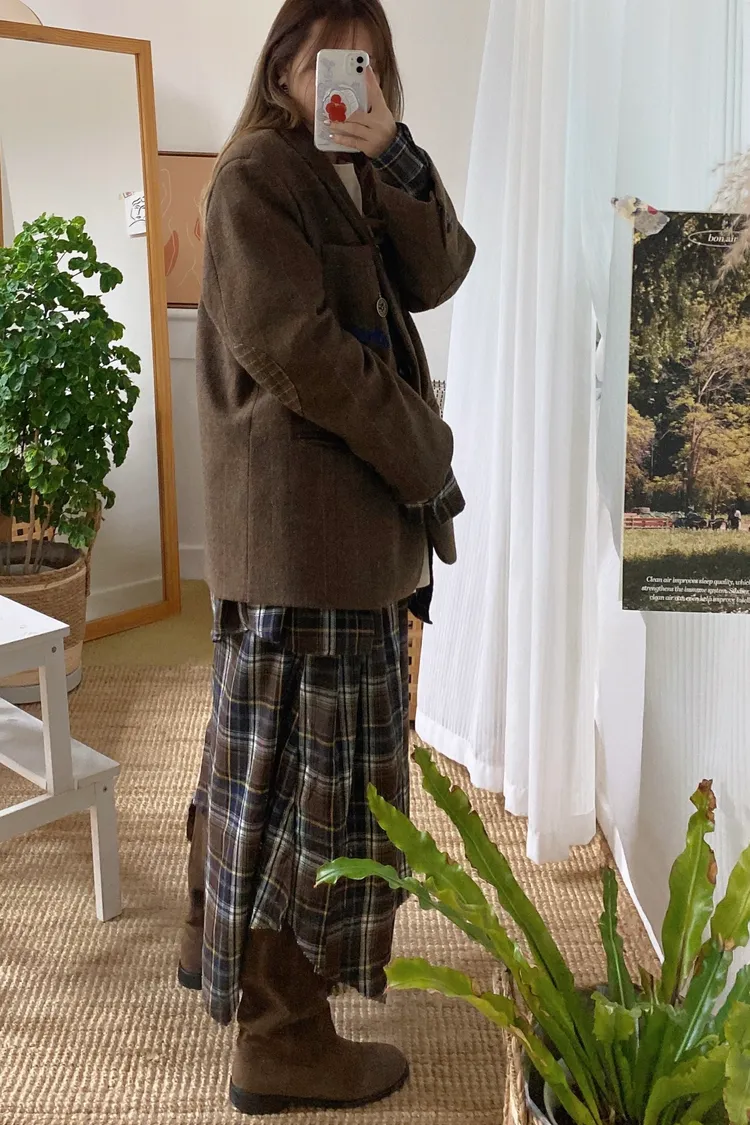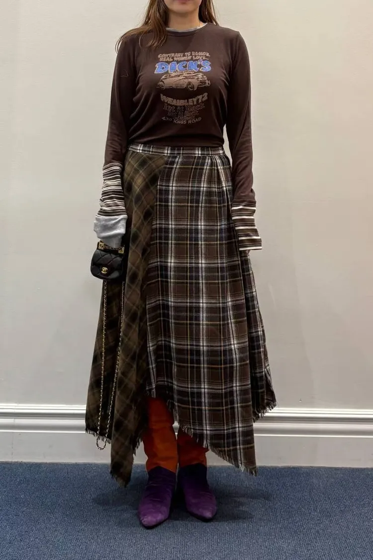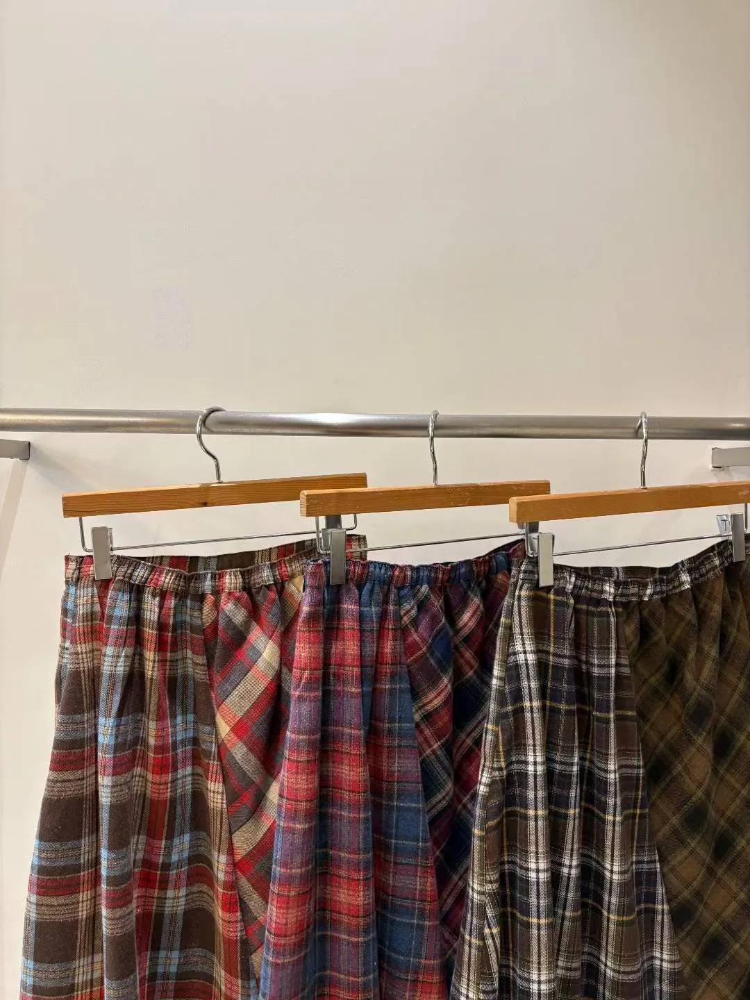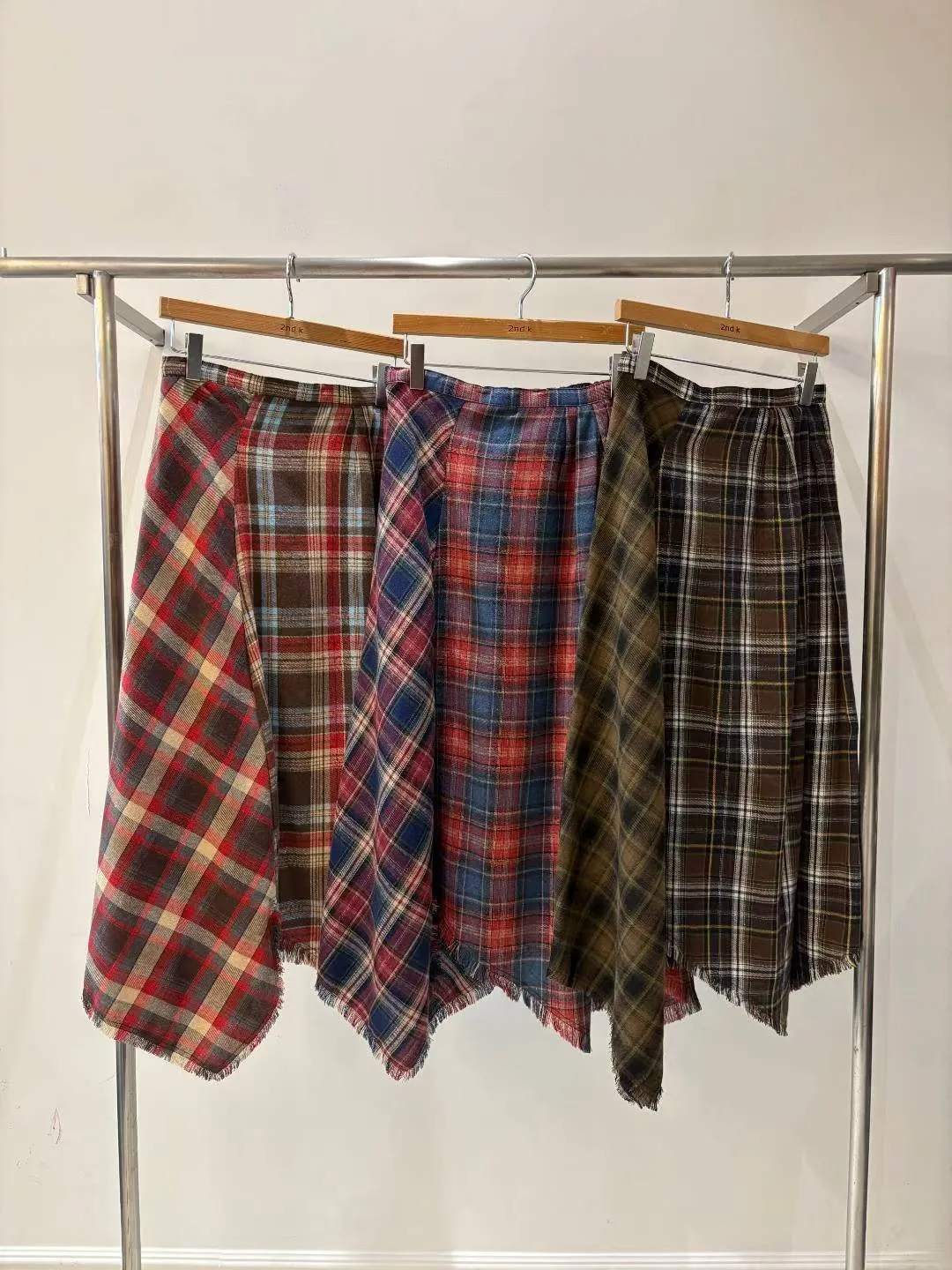把秋冬常見的格紋圍巾,變成長裙來穿,隨性的復古感性
