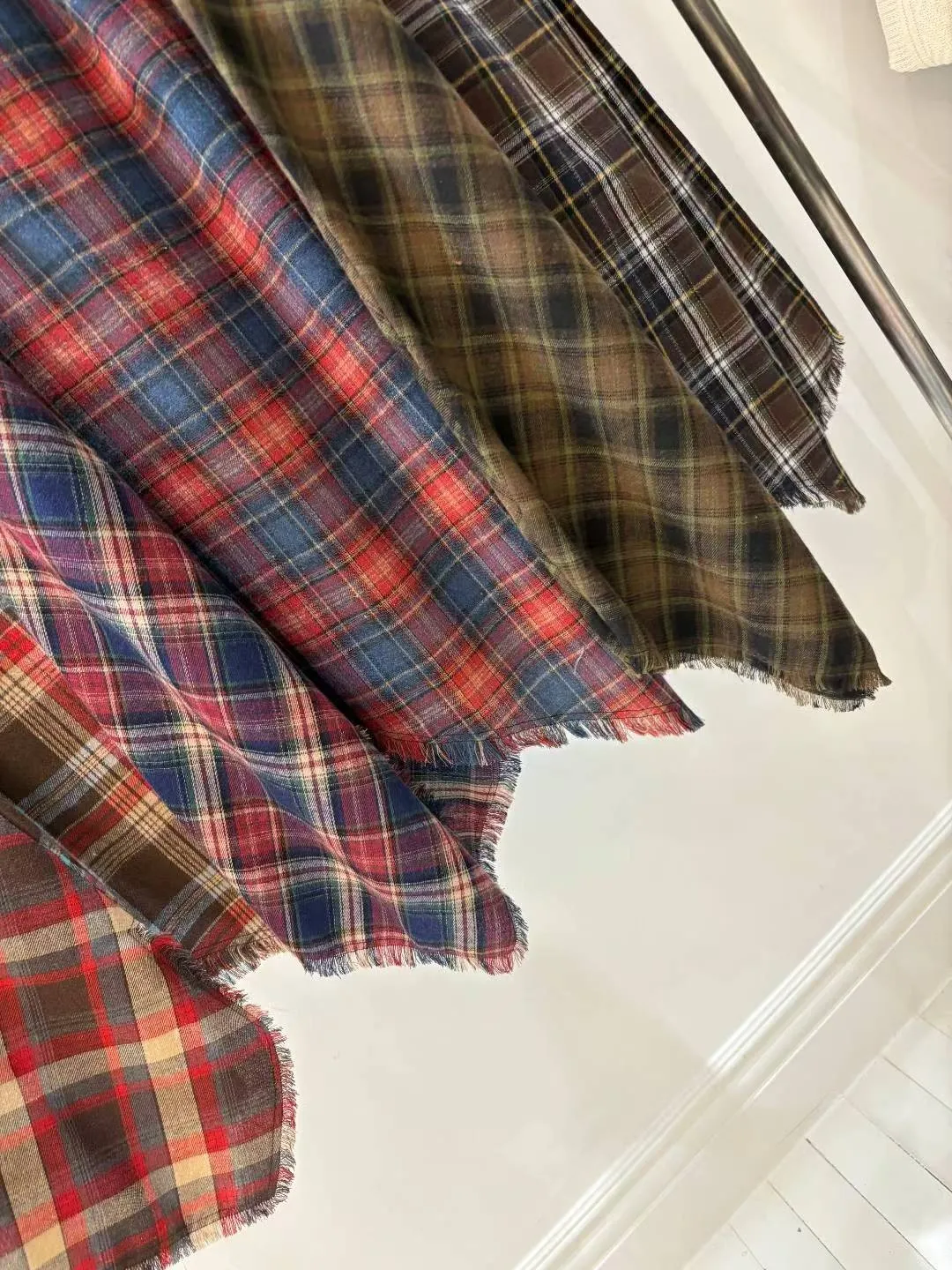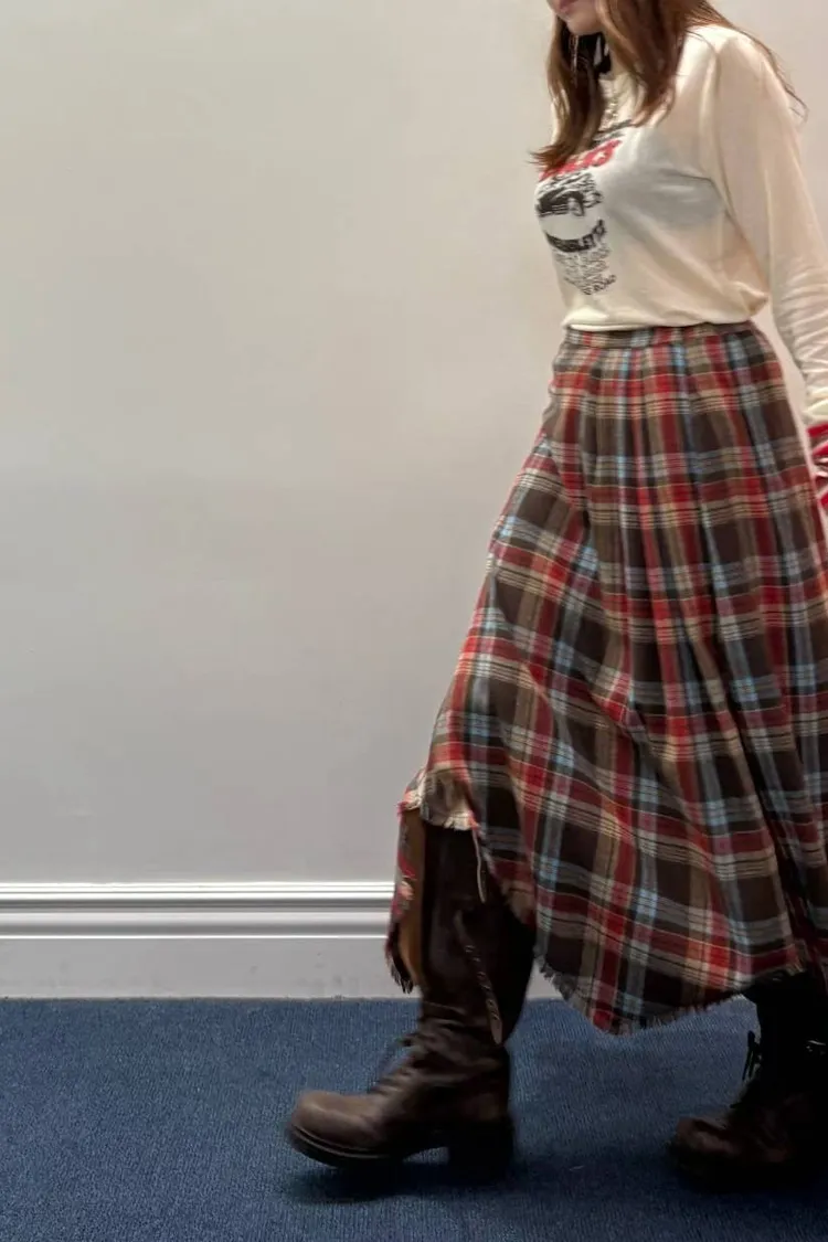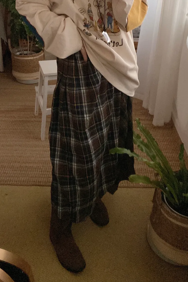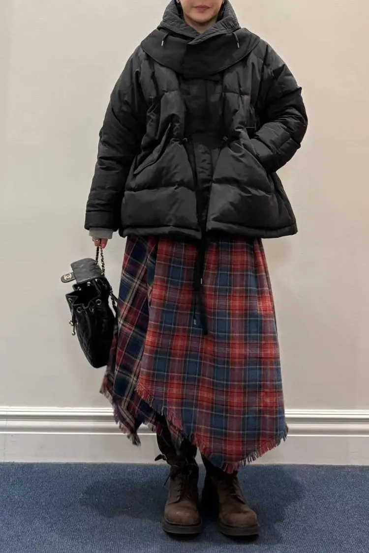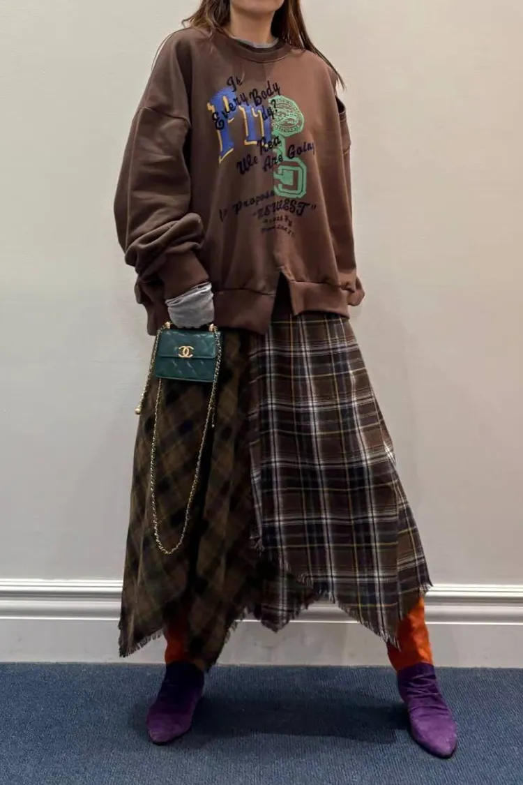 把秋冬常見的格紋圍巾,變成長裙來穿,隨性的復古感性