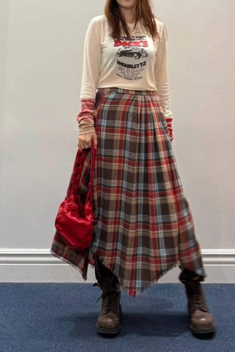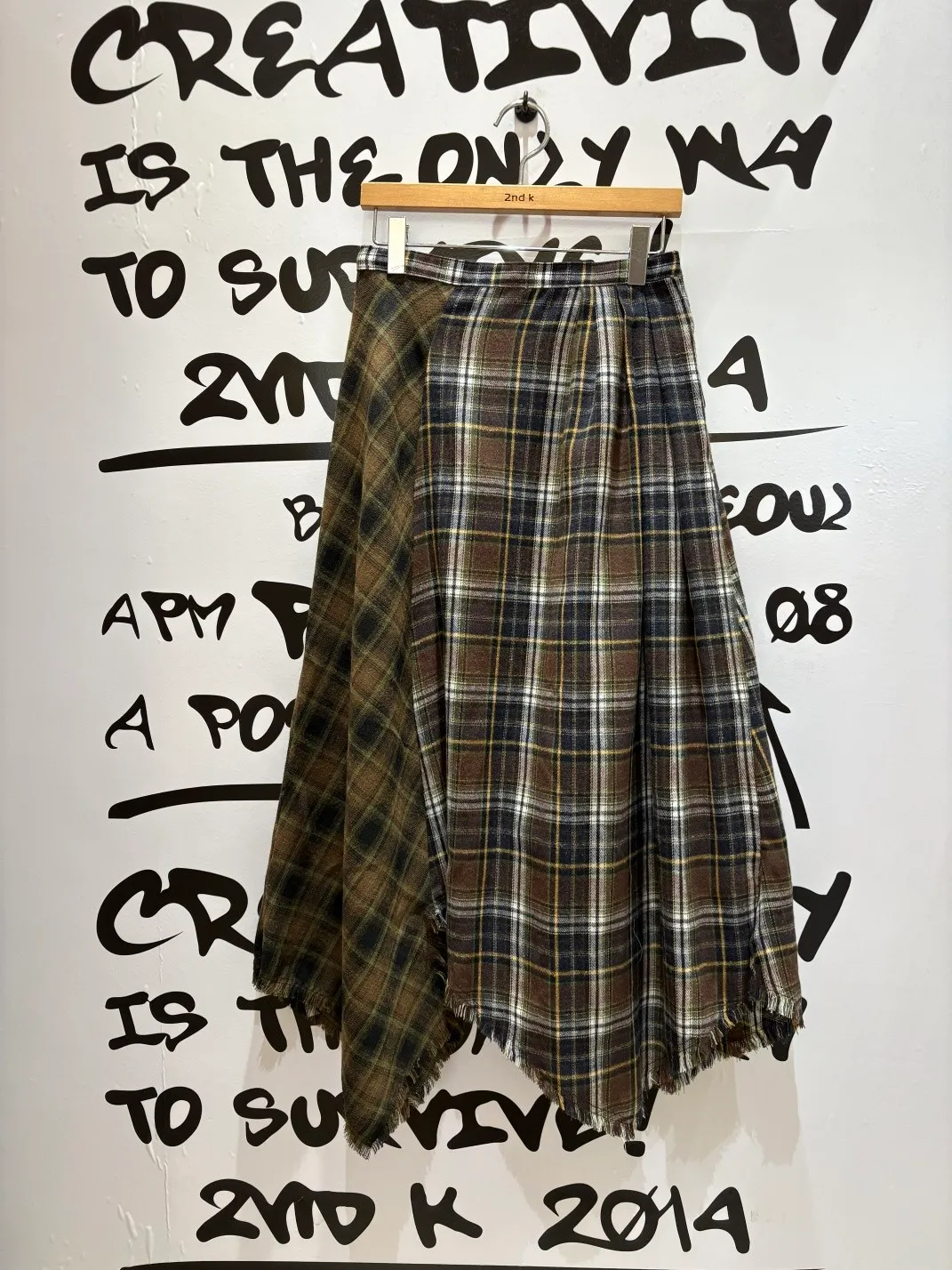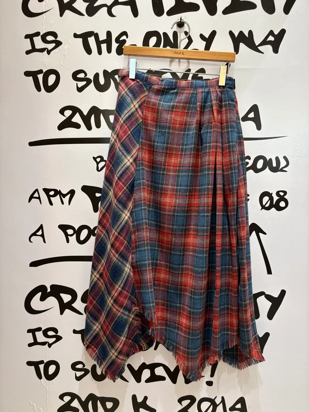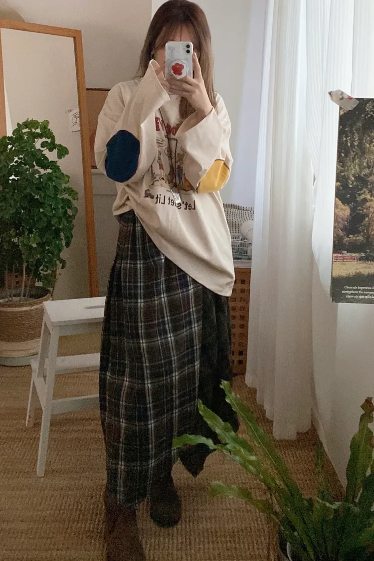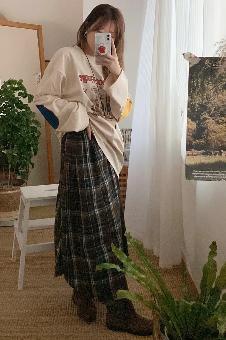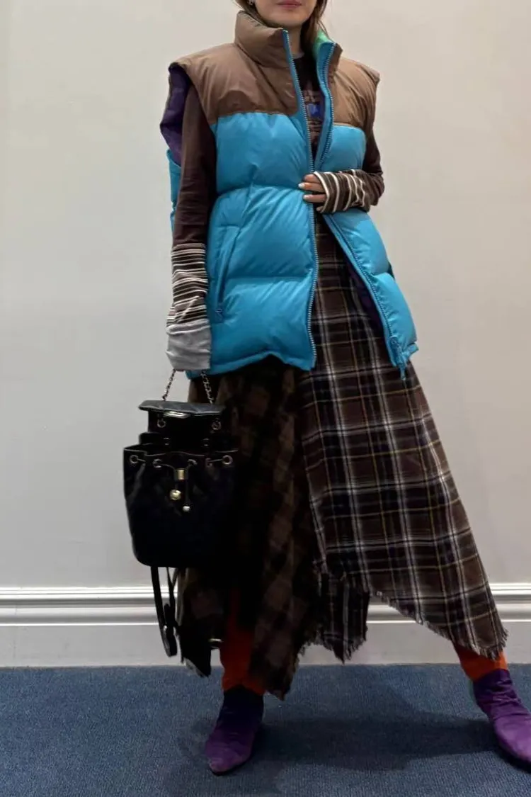 把秋冬常見的格紋圍巾,變成長裙來穿,隨性的復古感性
