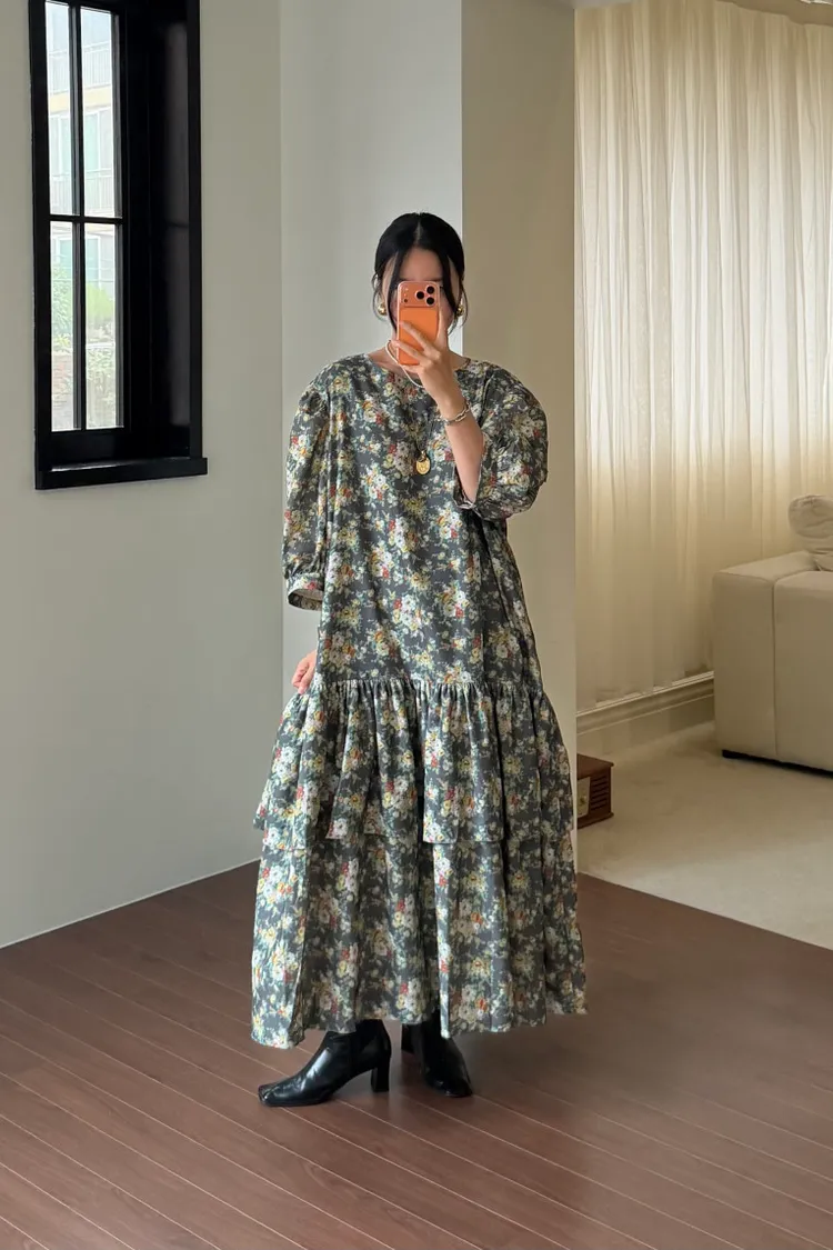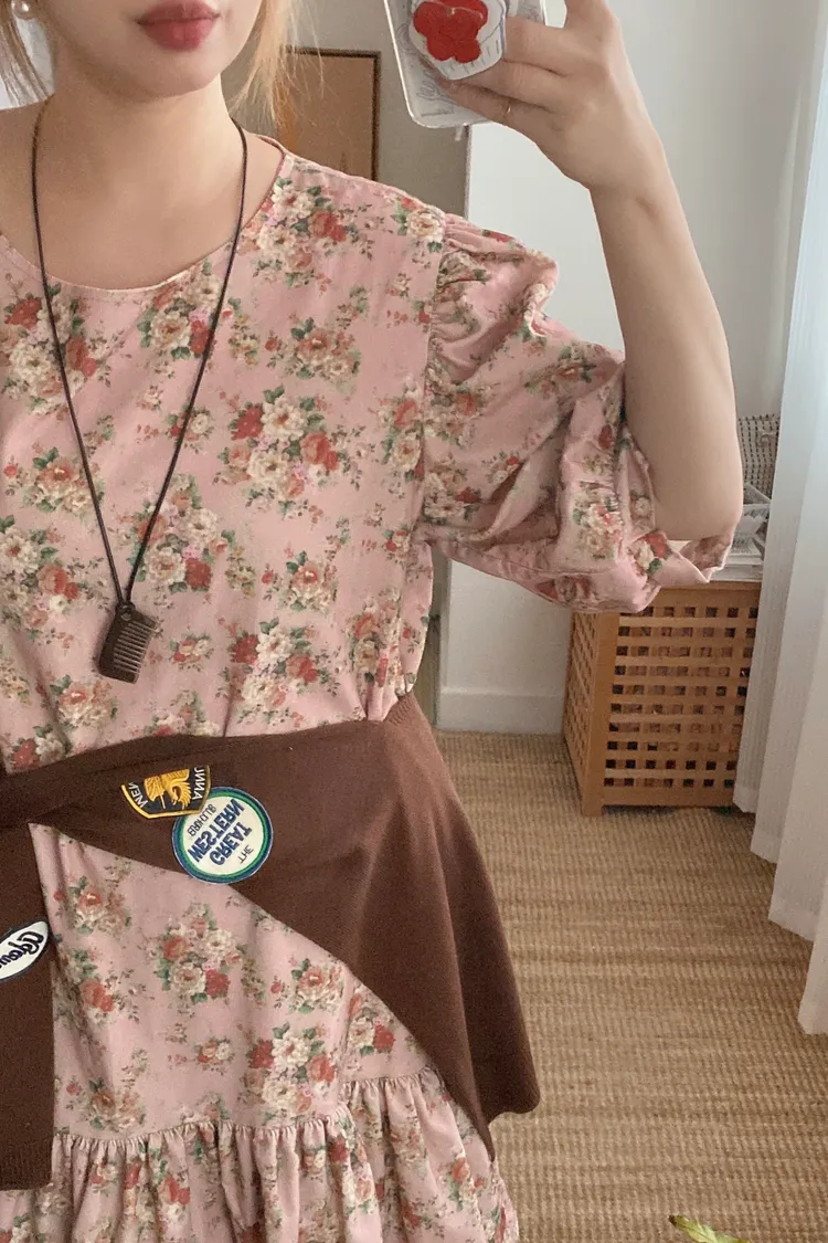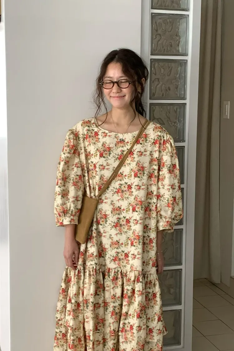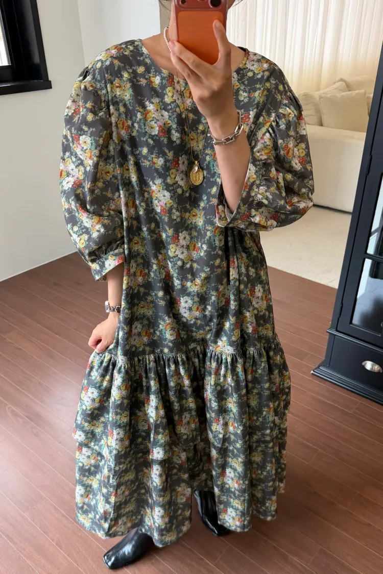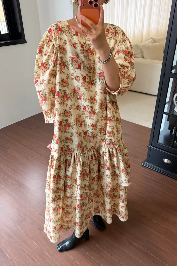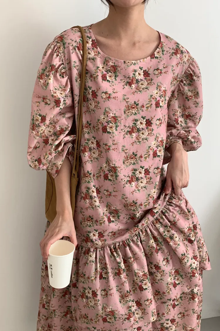 整件繽紛花束印花超吸睛,搭配寬鬆七分蓬蓬袖和低腰線設計