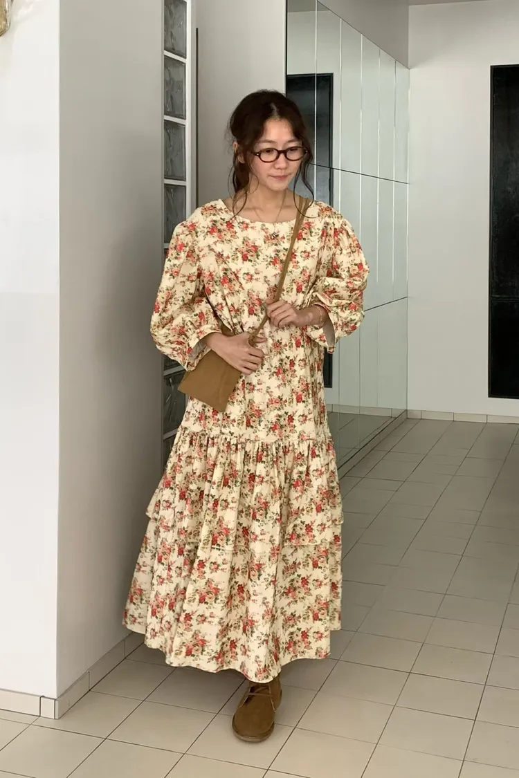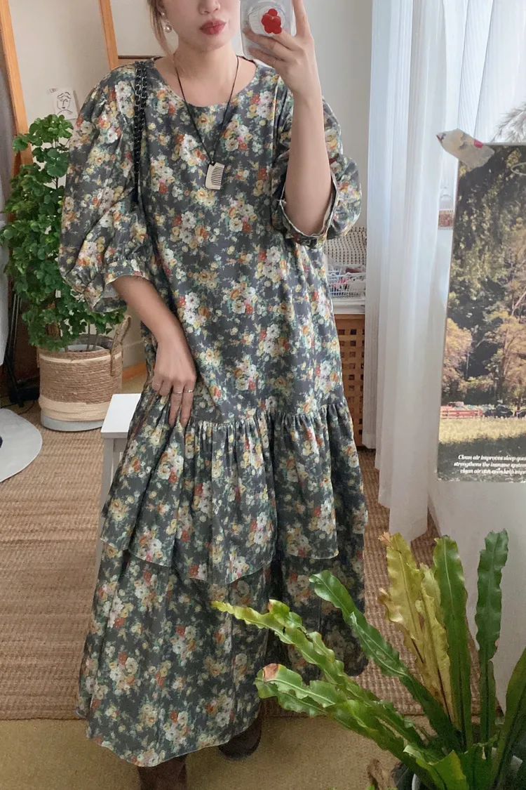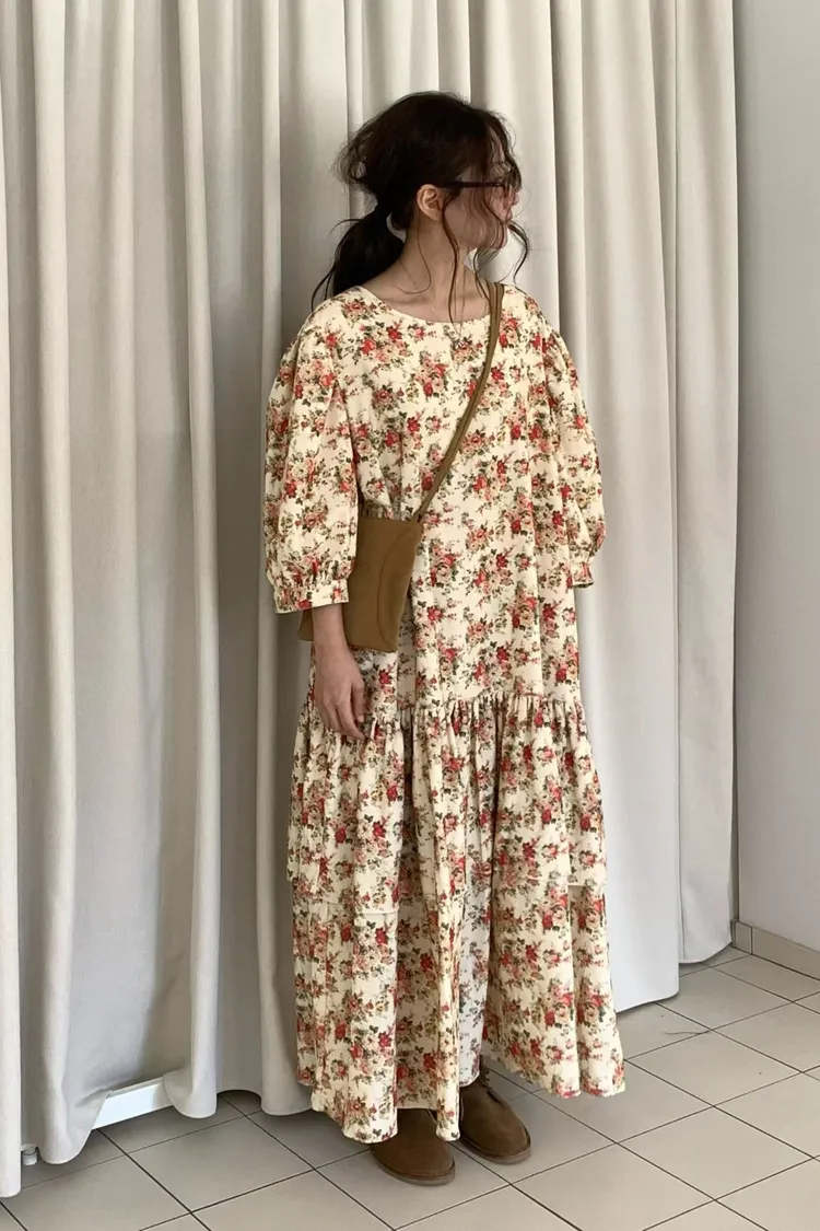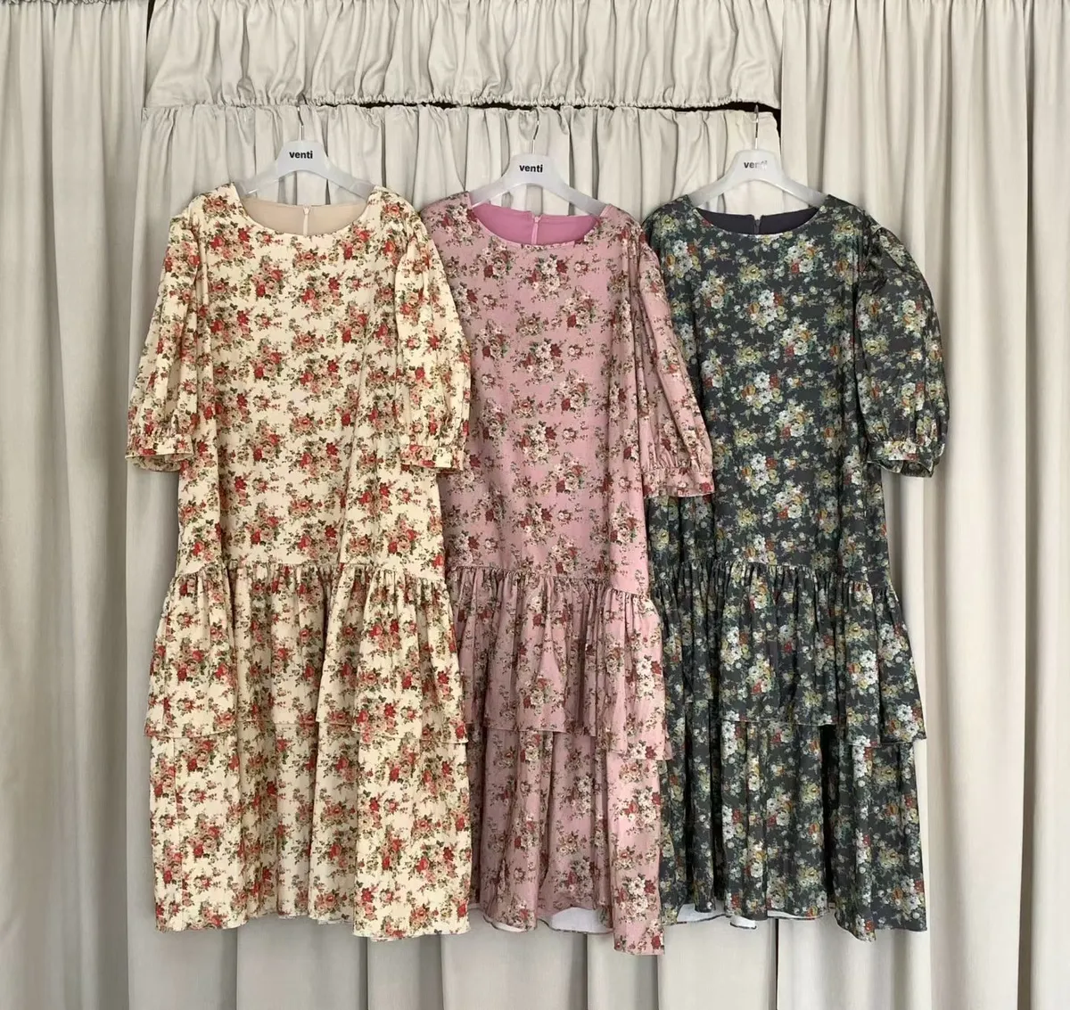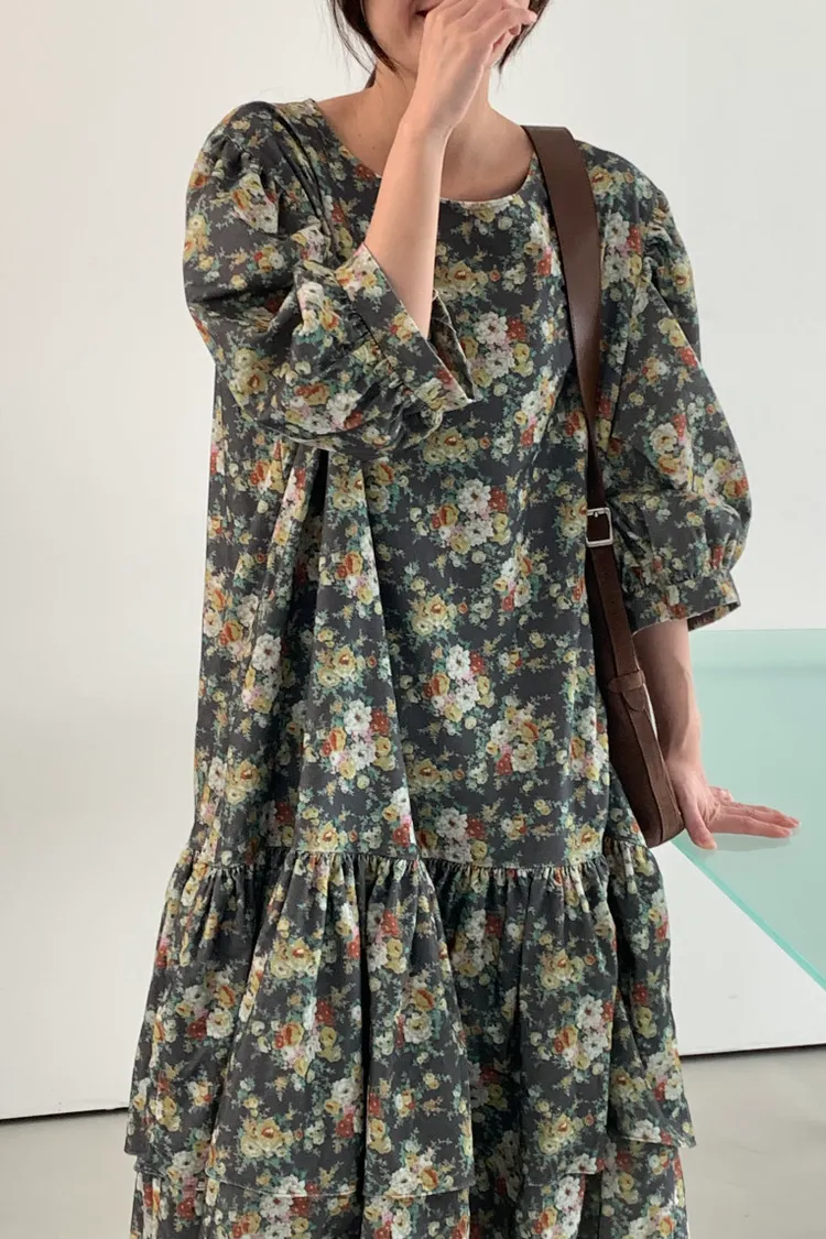 整件繽紛花束印花超吸睛,搭配寬鬆七分蓬蓬袖和低腰線設計