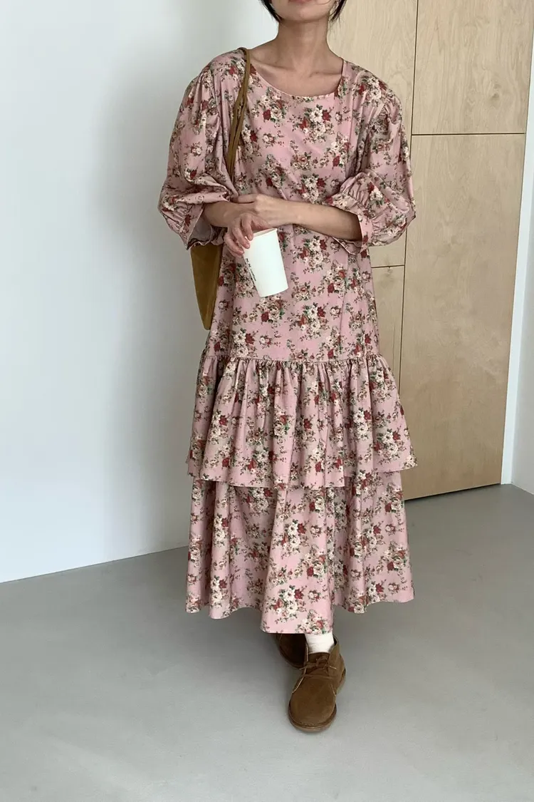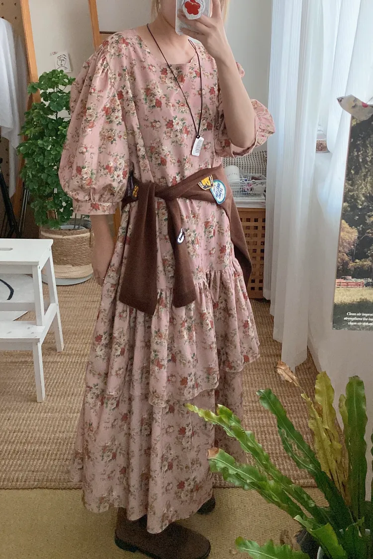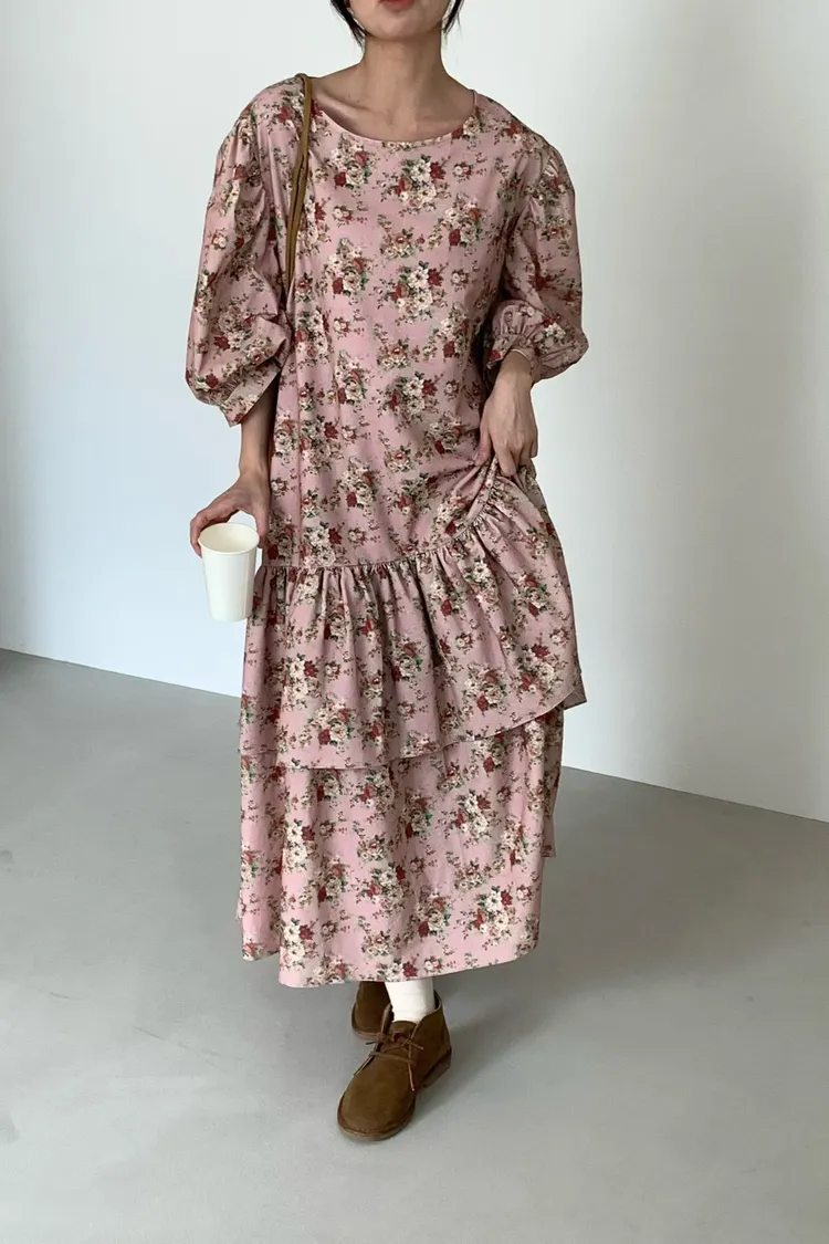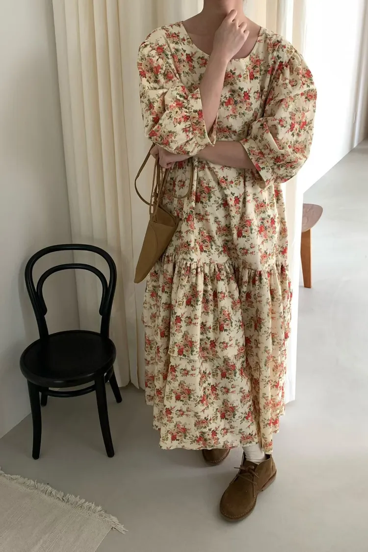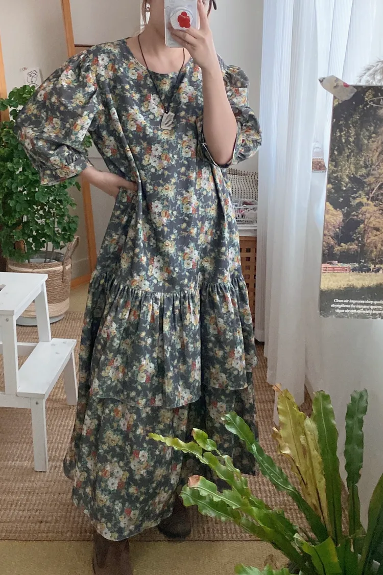 整件繽紛花束印花超吸睛,搭配寬鬆七分蓬蓬袖和低腰線設計