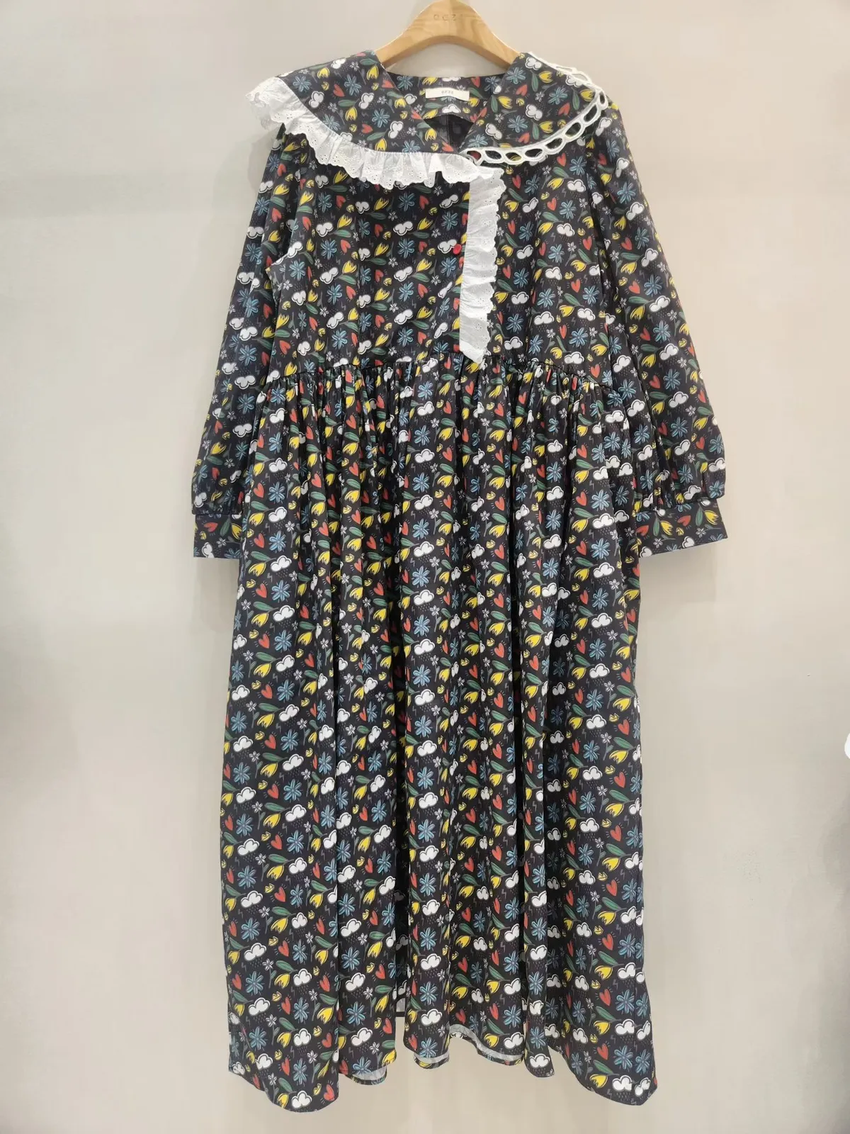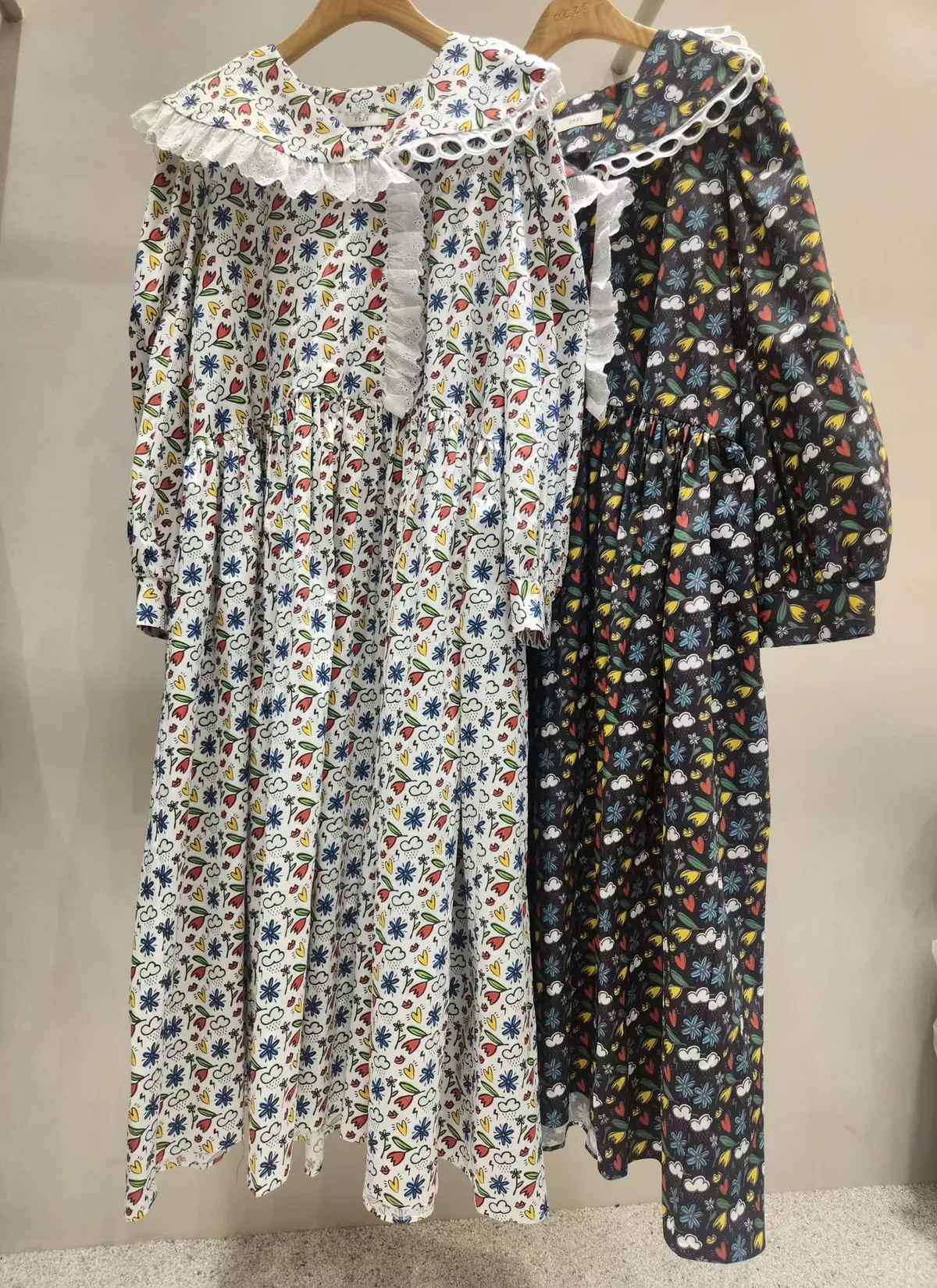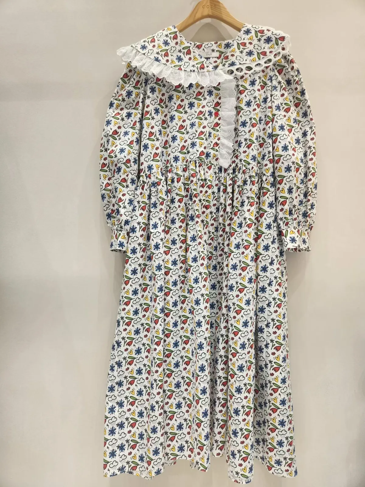 就像走進童話世界的連身洋~滿版愛心、白雲、花朵的插畫印花 色彩繽紛又充滿想像力 棉料材質柔軟親膚,不對稱蕾絲緞帶翻領設計超有特色,甜美中帶點俏皮小反差 寬鬆傘擺,S-XL妞都可以穿 一件就能穿出童趣感與藝術氣息兼具的夢幻look