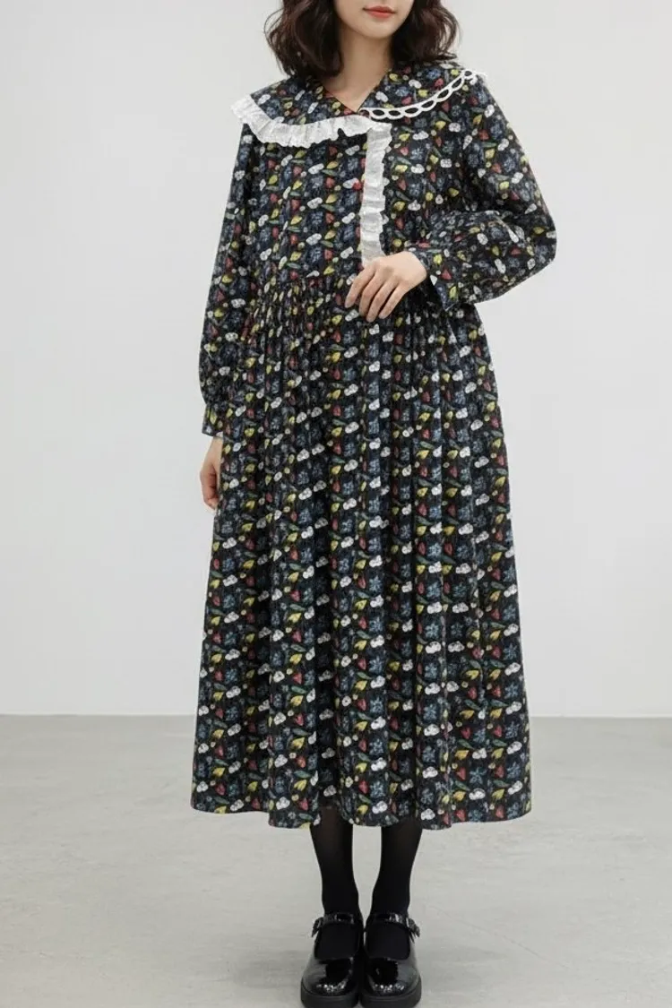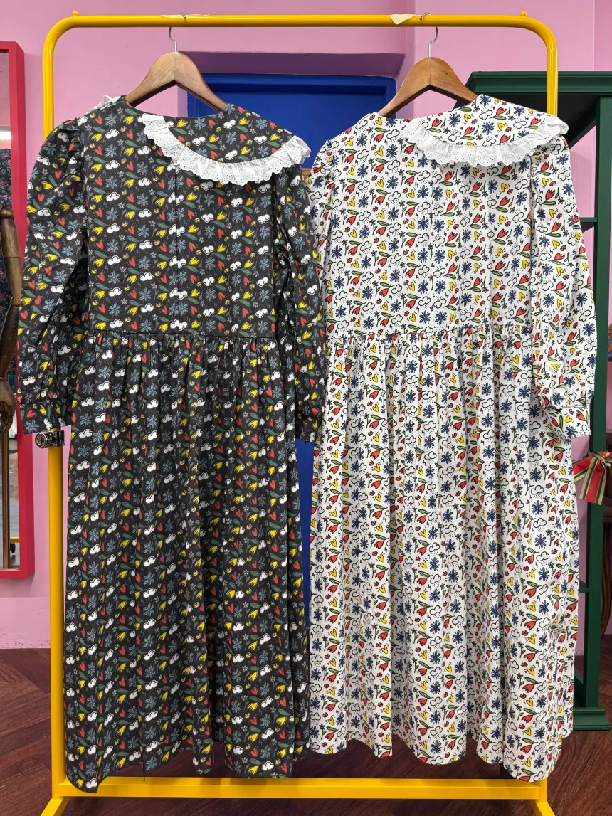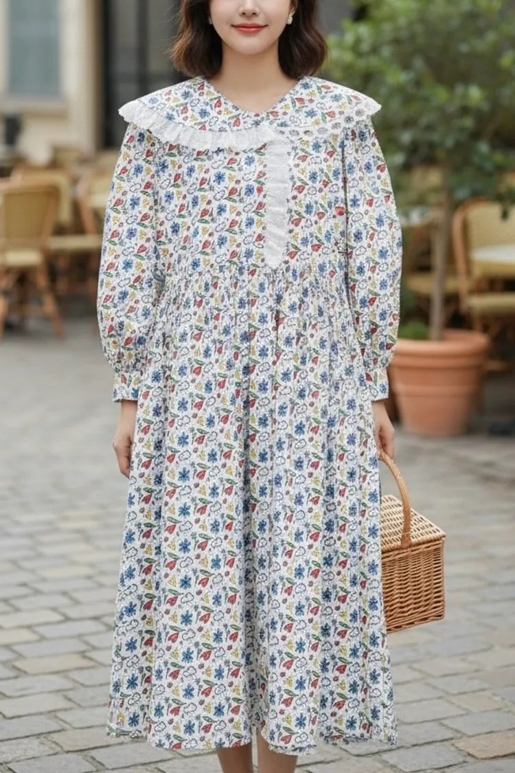 就像走進童話世界的連身洋~滿版愛心、白雲、花朵的插畫印花 色彩繽紛又充滿想像力 棉料材質柔軟親膚,不對稱蕾絲緞帶翻領設計超有特色,甜美中帶點俏皮小反差 寬鬆傘擺,S-XL妞都可以穿 一件就能穿出童趣感與藝術氣息兼具的夢幻look