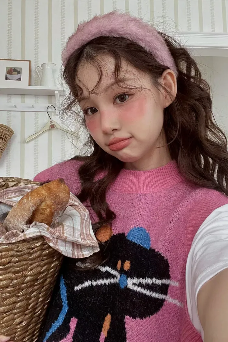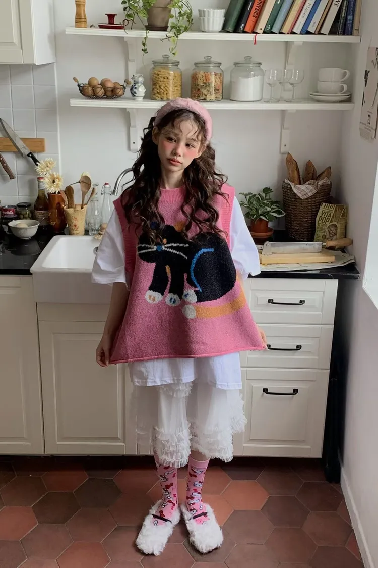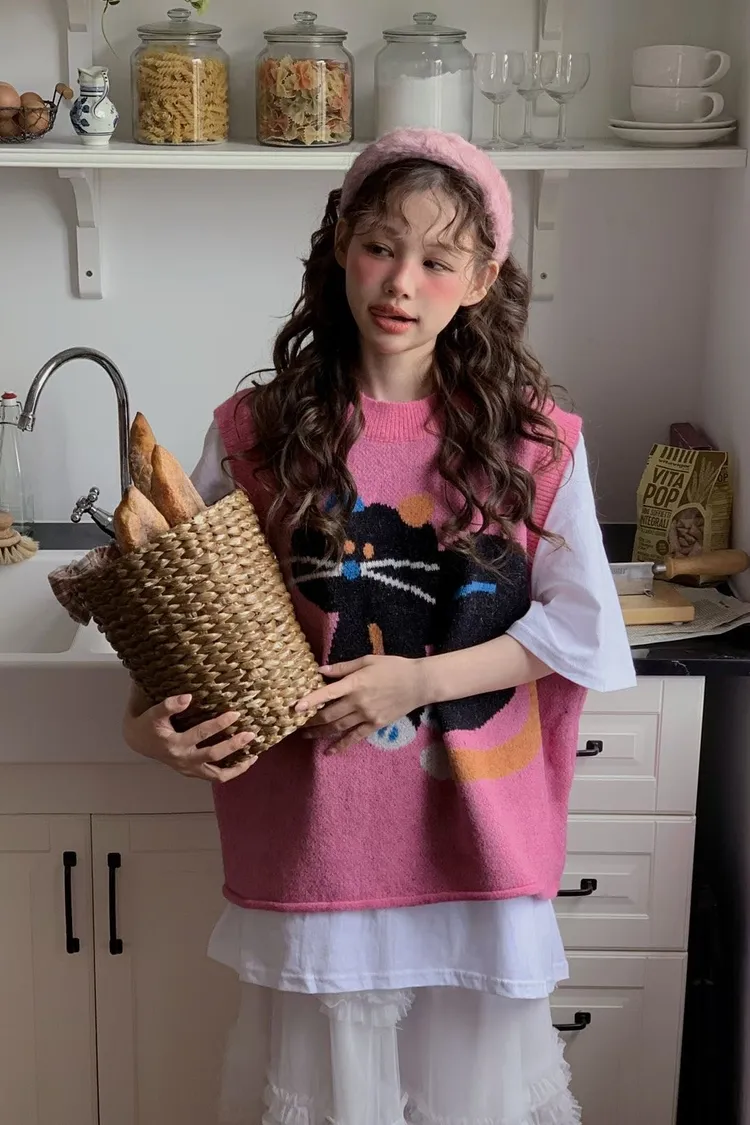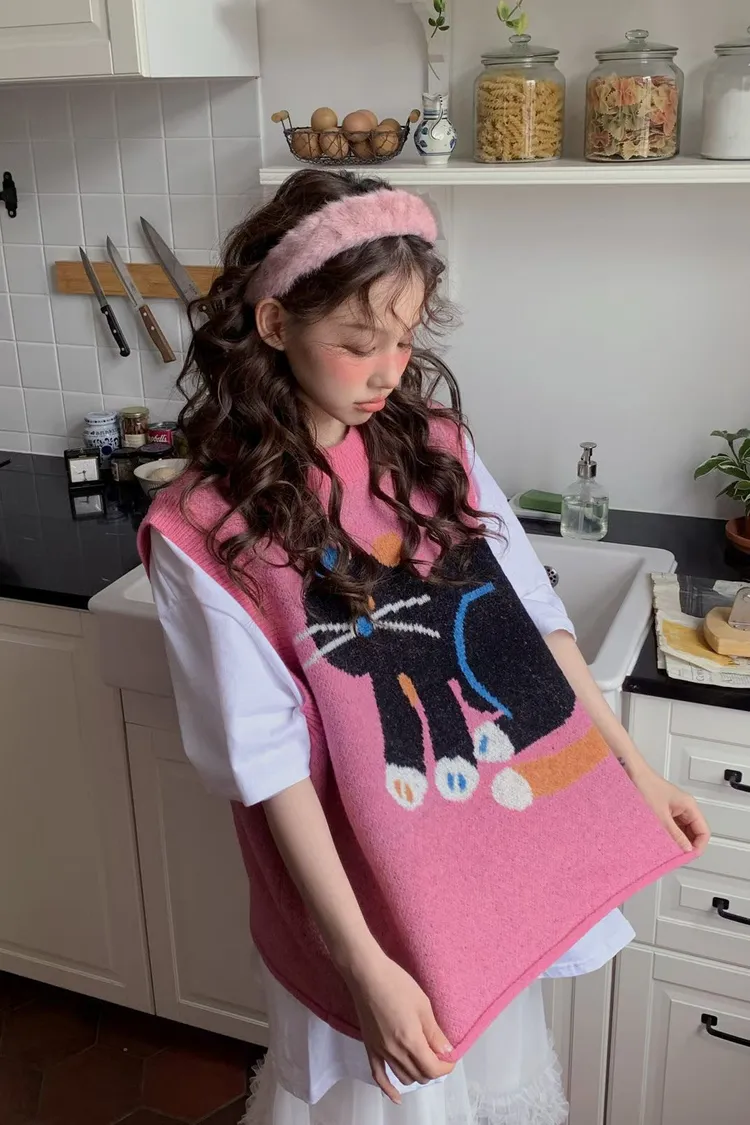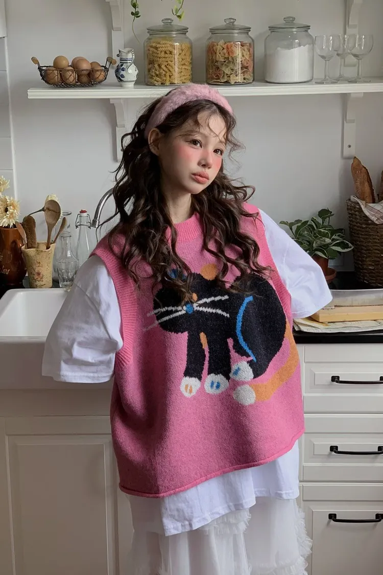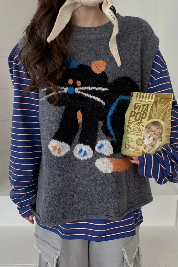 羊毛100%柔軟觸感,溫暖中帶點小俏皮 正面大大的黑貓圖案超吸睛 耳朵、腳爪、尾巴還是撞色設計,細節感滿分 寬鬆版型,S-XL妞都可以穿 背心洞口大,內搭棉T沒問題~ 下擺捲捲邊多了幾分可愛慵懶氛圍,秋冬穿搭亮點首選