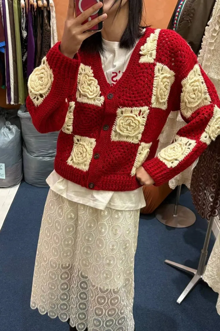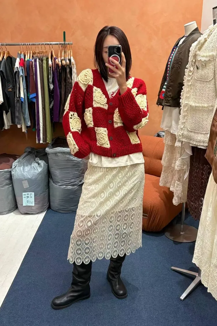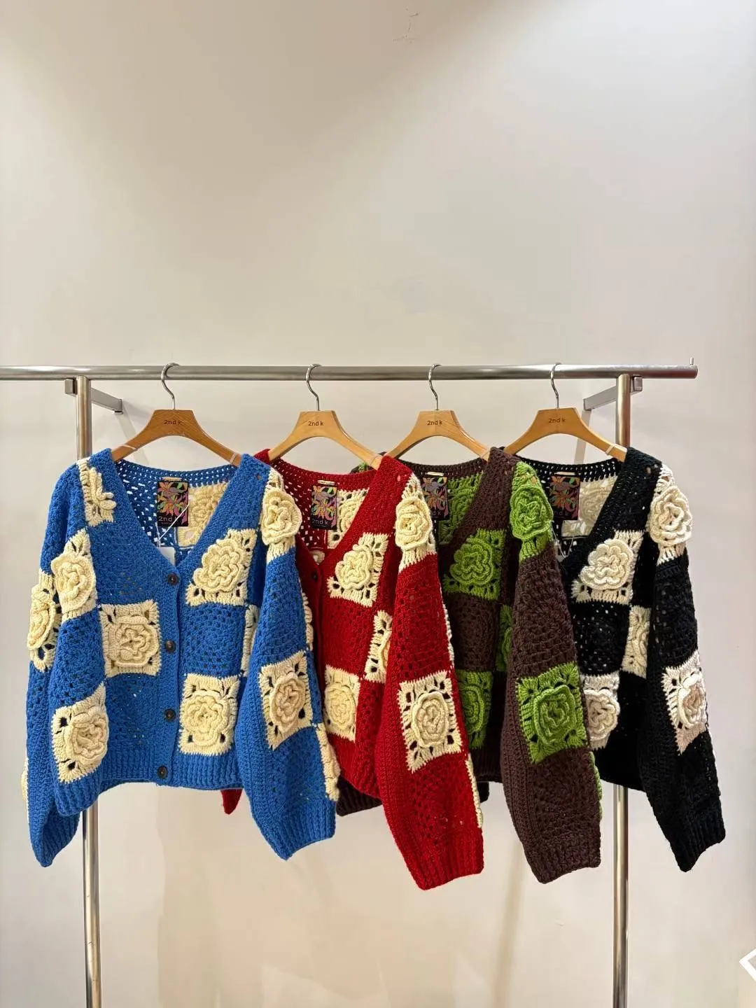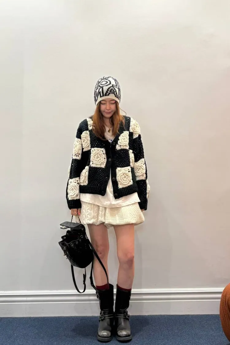 HAND MADE 手工製,精緻又有質感 羊毛50%、幼馬海毛(Kid Mohair)20%,纖維很細、柔軟保暖 棋盤格鉤織立體花朵,優雅中帶點甜美氣息 S-L妞都可以穿,無論日常出街或秋冬約會都超吸睛韓國熱銷色是黑、紅