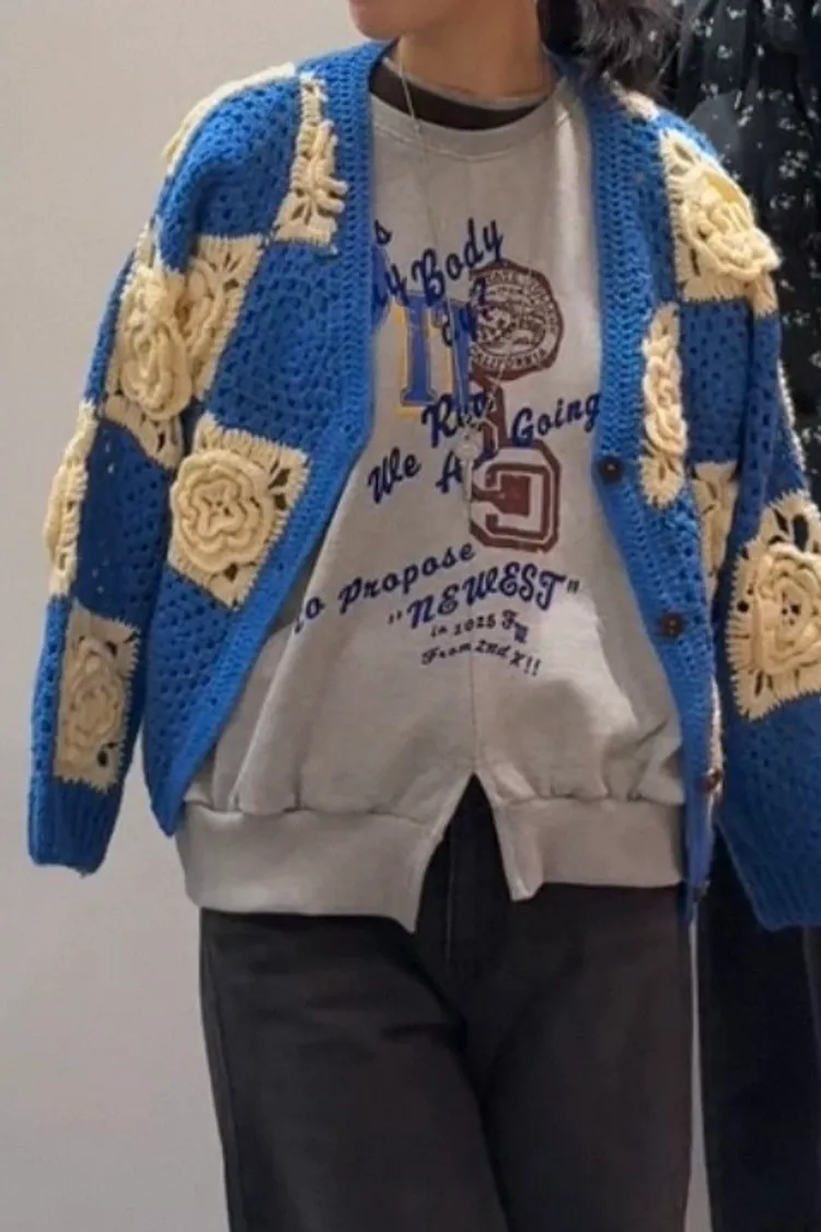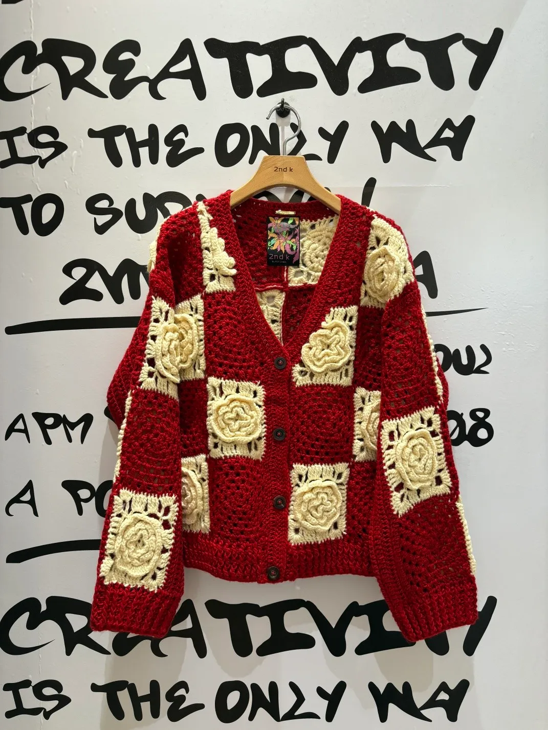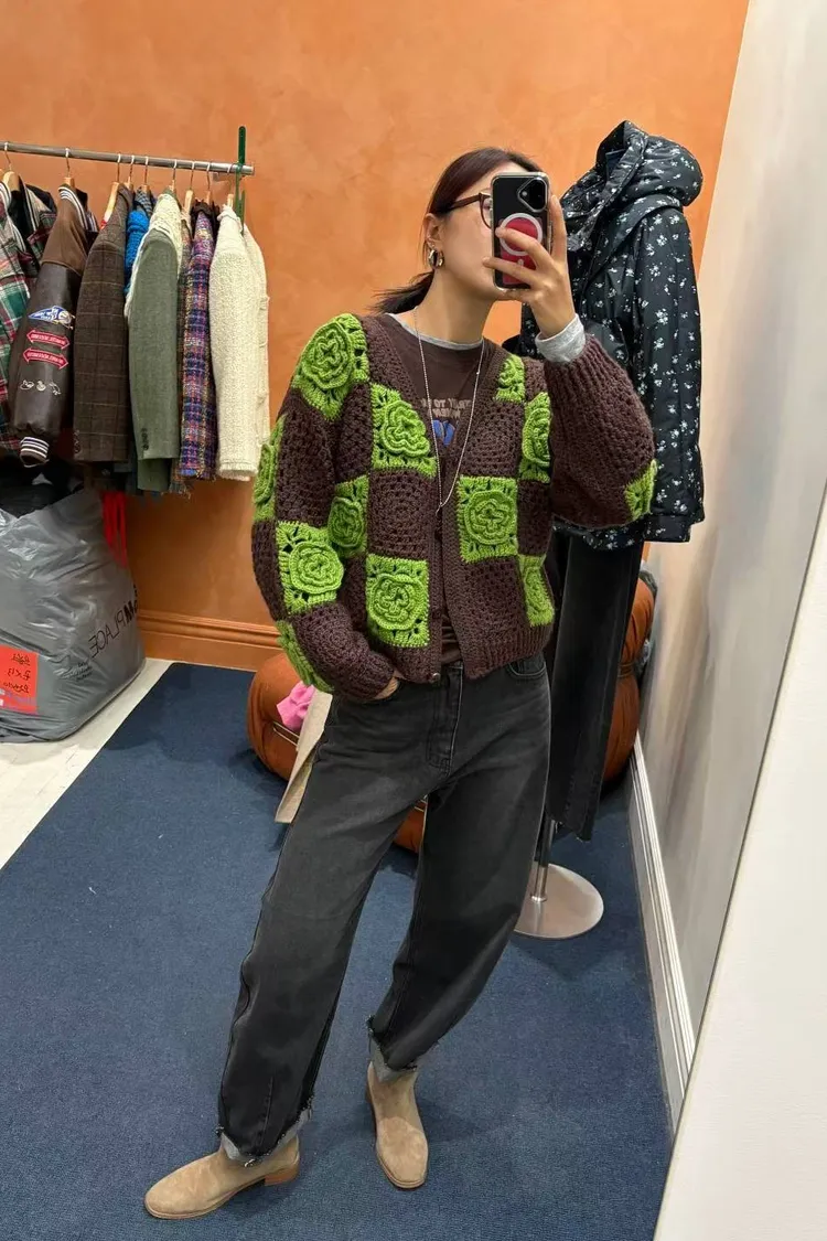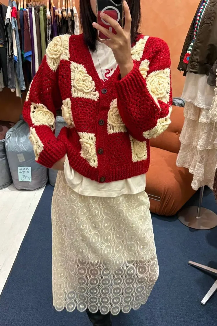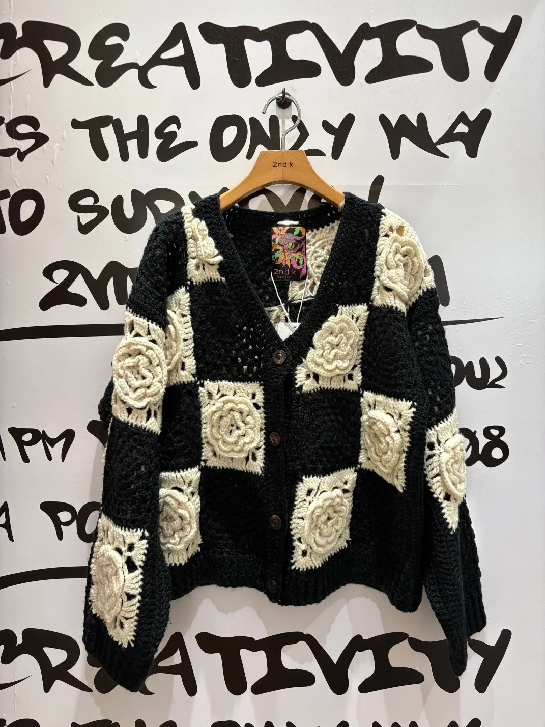 HAND MADE 手工製,精緻又有質感 羊毛50%、幼馬海毛(Kid Mohair)20%,纖維很細、柔軟保暖 棋盤格鉤織立體花朵,優雅中帶點甜美氣息 S-L妞都可以穿,無論日常出街或秋冬約會都超吸睛韓國熱銷色是黑、紅