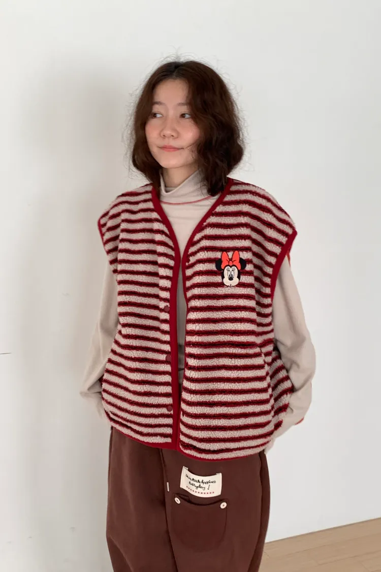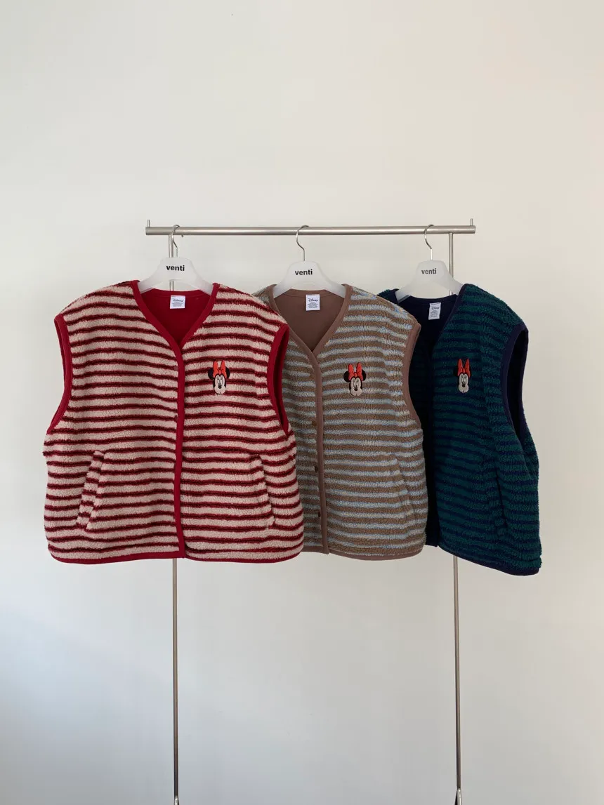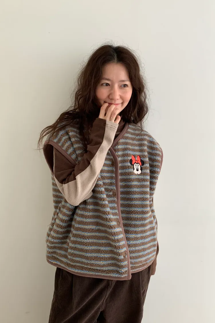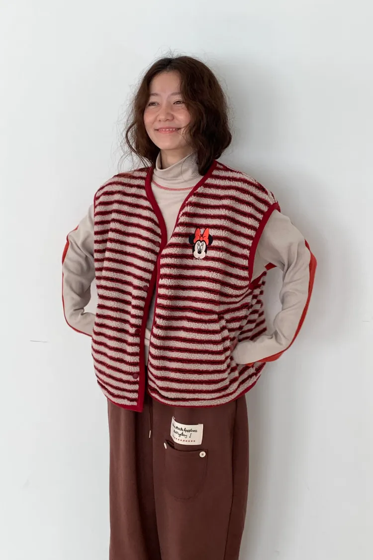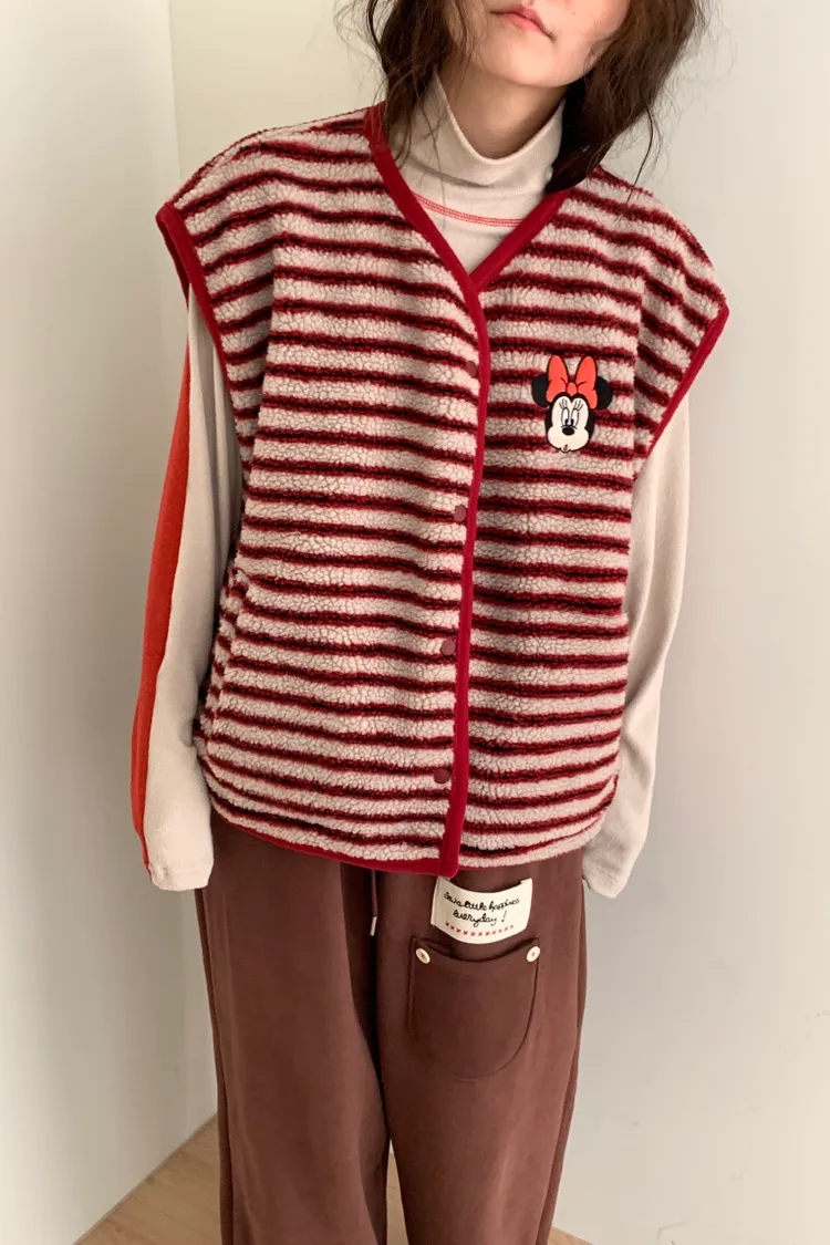 迪士尼正版授權,米妮刺繡萌力滿分 QQ羊羔毛面料、內裡絨料,柔軟保暖又舒適,秋冬外出超安心 寬鬆版型,S-XL妞都可以穿、有口袋 撞色條紋與滾邊增添可愛層次 背心洞口大,內搭毛衣也OK,甜美又實穿 韓國熱銷色是紅