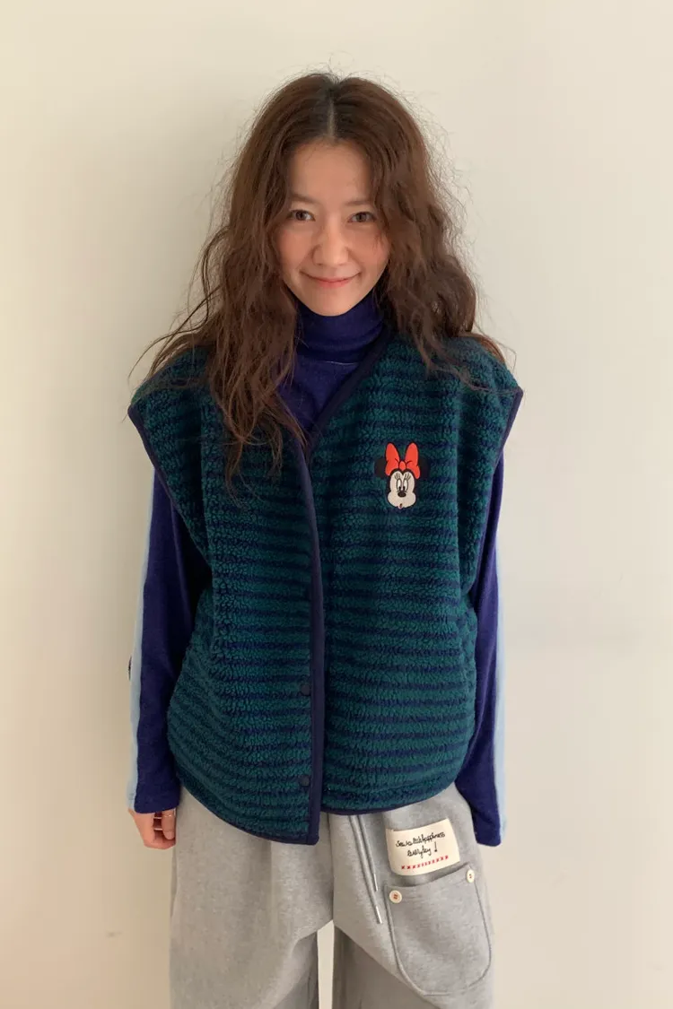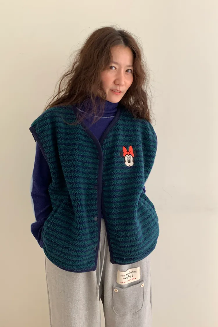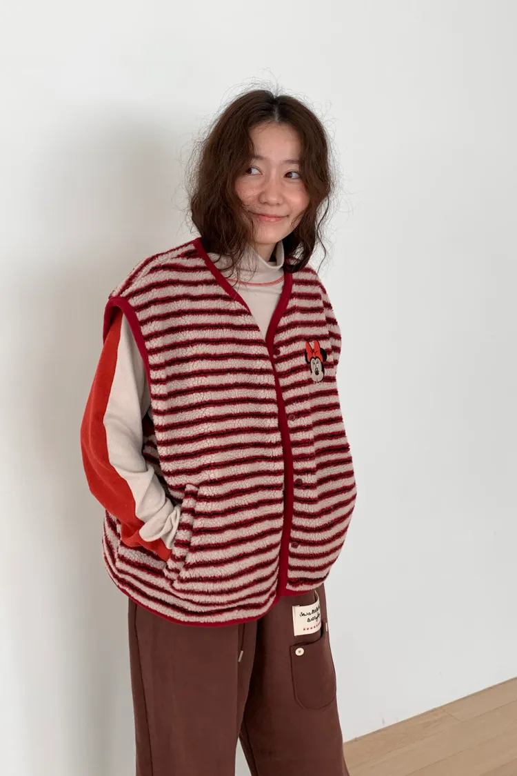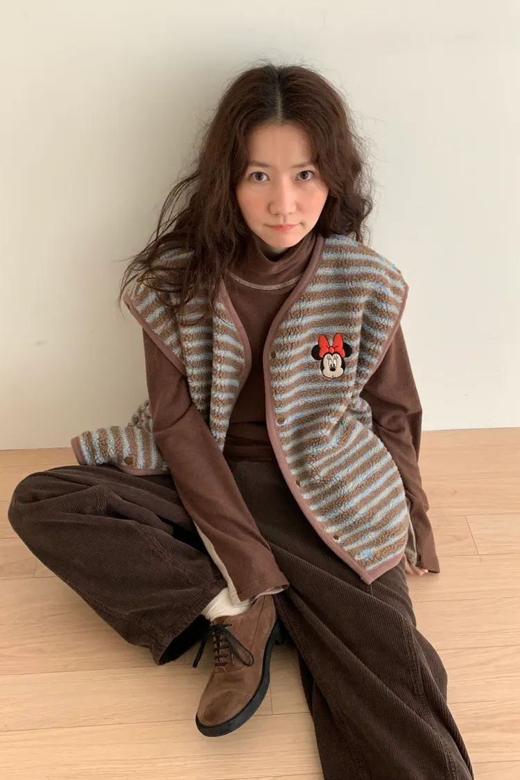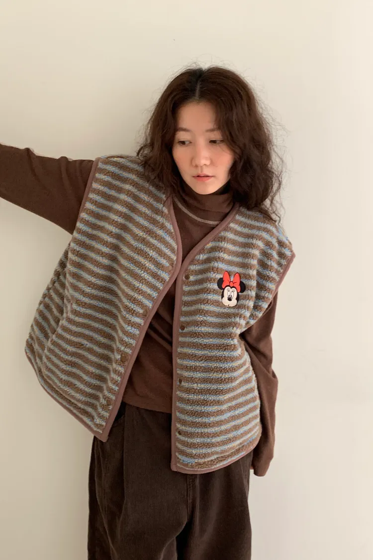 迪士尼正版授權,米妮刺繡萌力滿分 QQ羊羔毛面料、內裡絨料,柔軟保暖又舒適,秋冬外出超安心 寬鬆版型,S-XL妞都可以穿、有口袋 撞色條紋與滾邊增添可愛層次 背心洞口大,內搭毛衣也OK,甜美又實穿 韓國熱銷色是紅