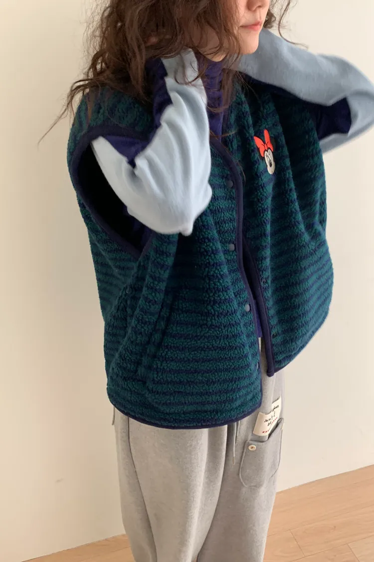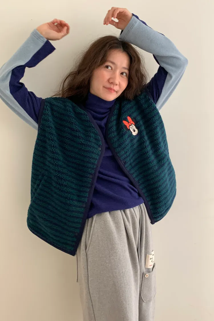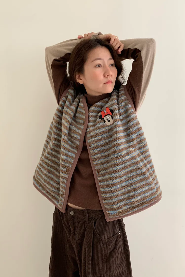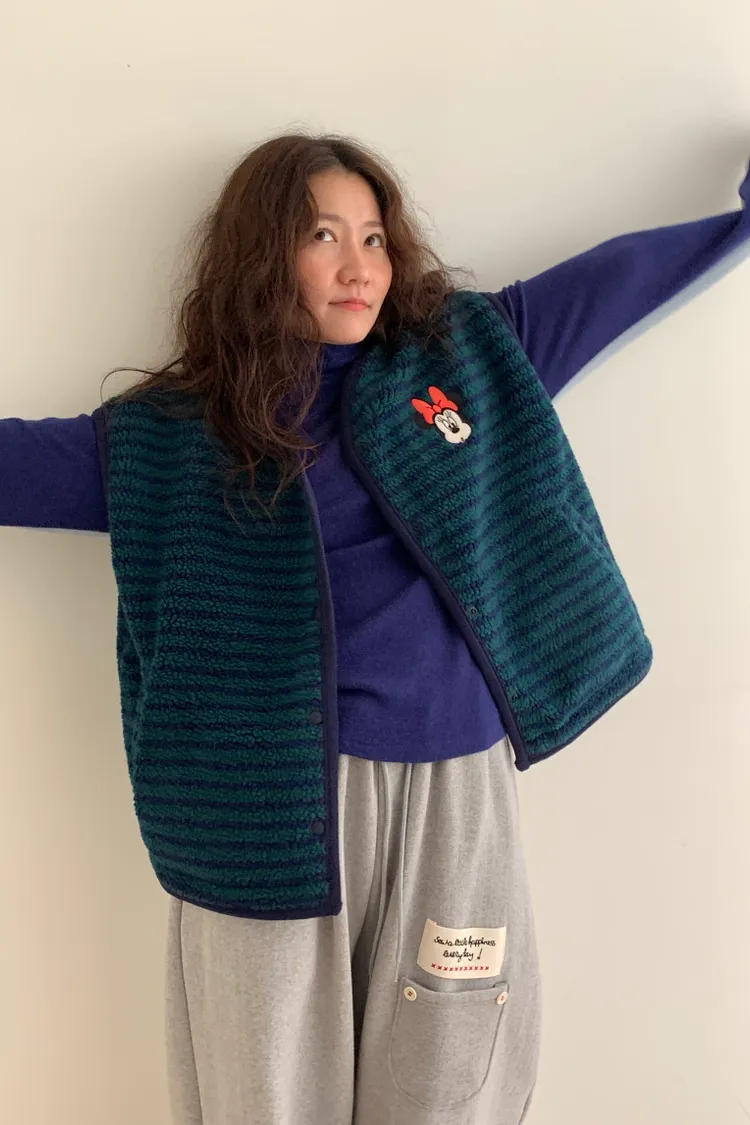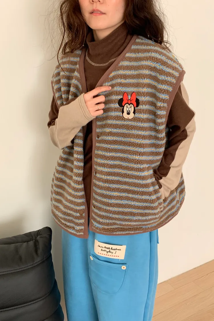 迪士尼正版授權,米妮刺繡萌力滿分 QQ羊羔毛面料、內裡絨料,柔軟保暖又舒適,秋冬外出超安心 寬鬆版型,S-XL妞都可以穿、有口袋 撞色條紋與滾邊增添可愛層次 背心洞口大,內搭毛衣也OK,甜美又實穿 韓國熱銷色是紅