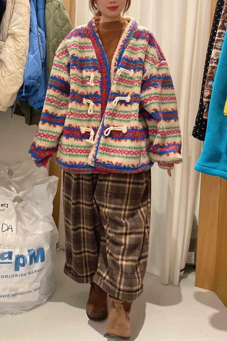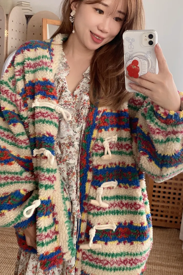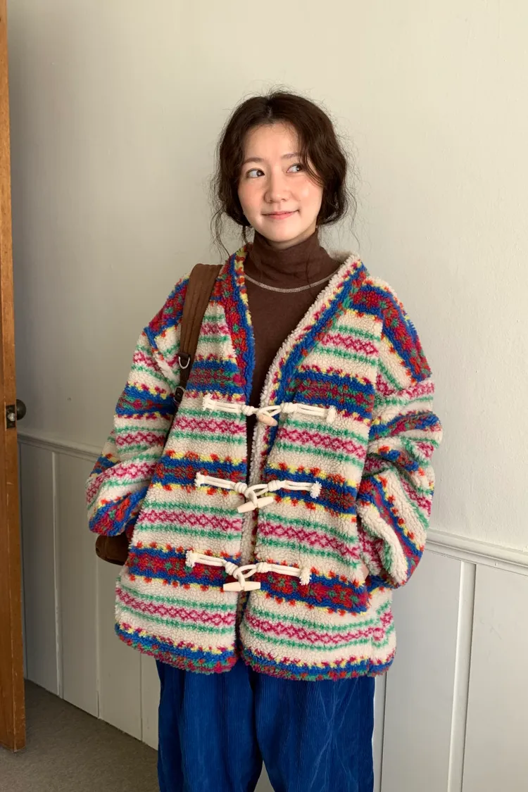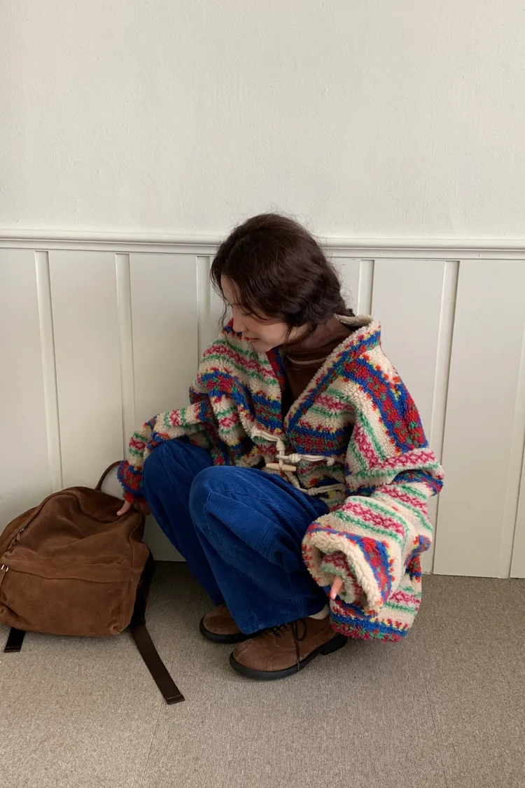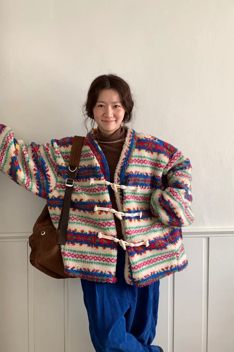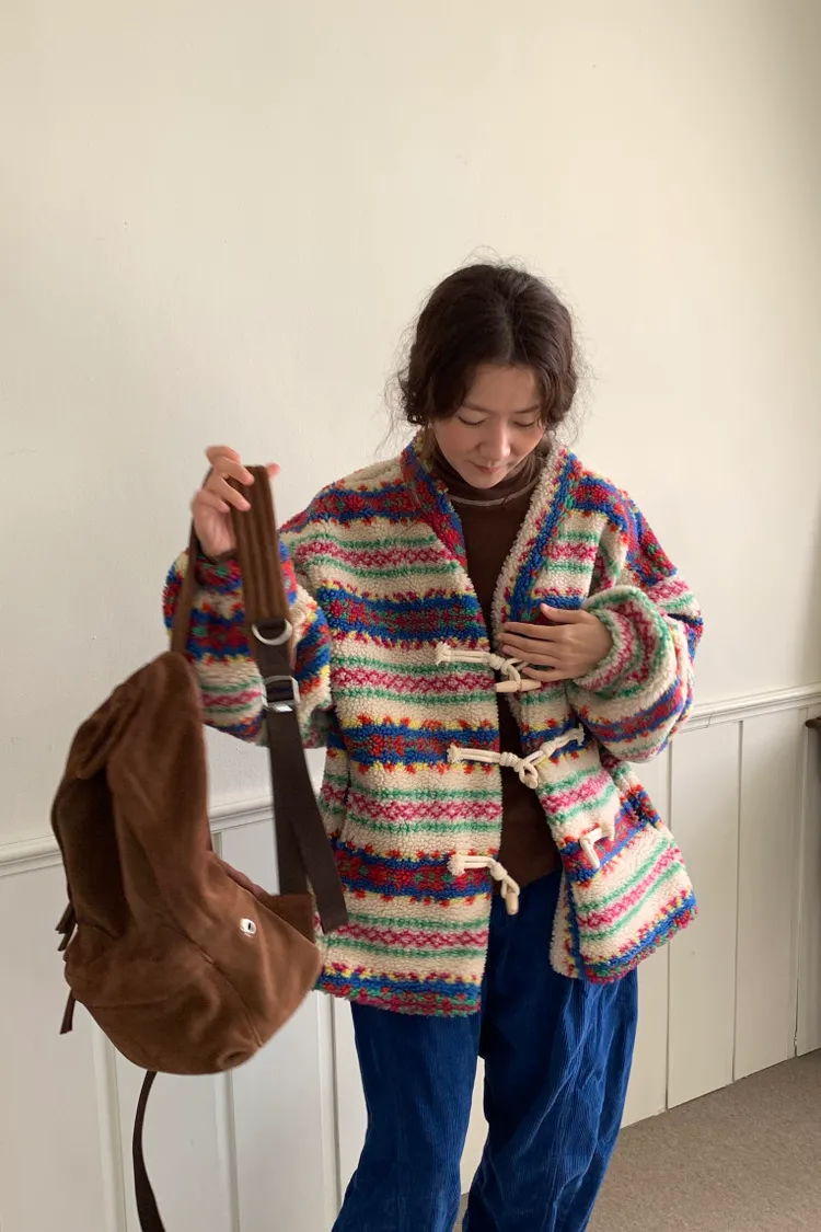 費爾島圖騰搭配牛角扣設計,甜美又帶小巧思