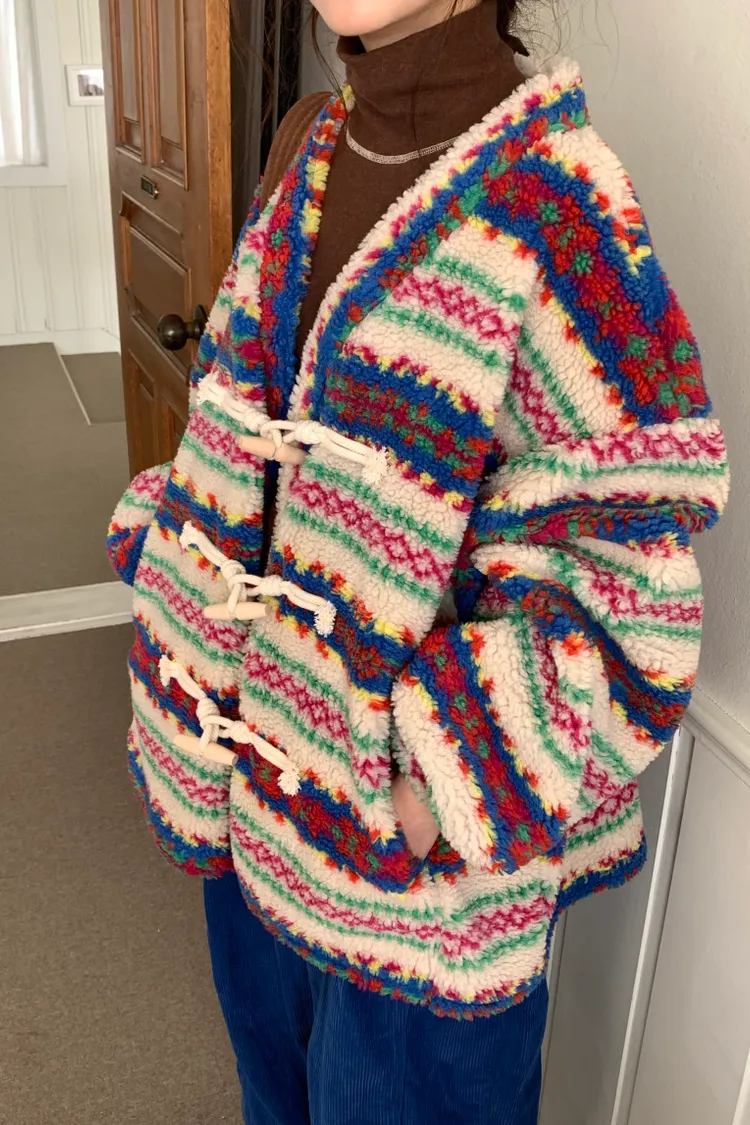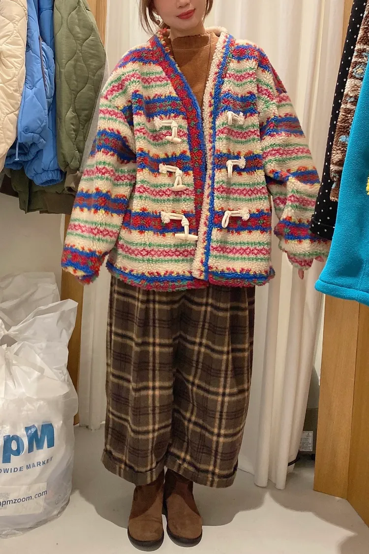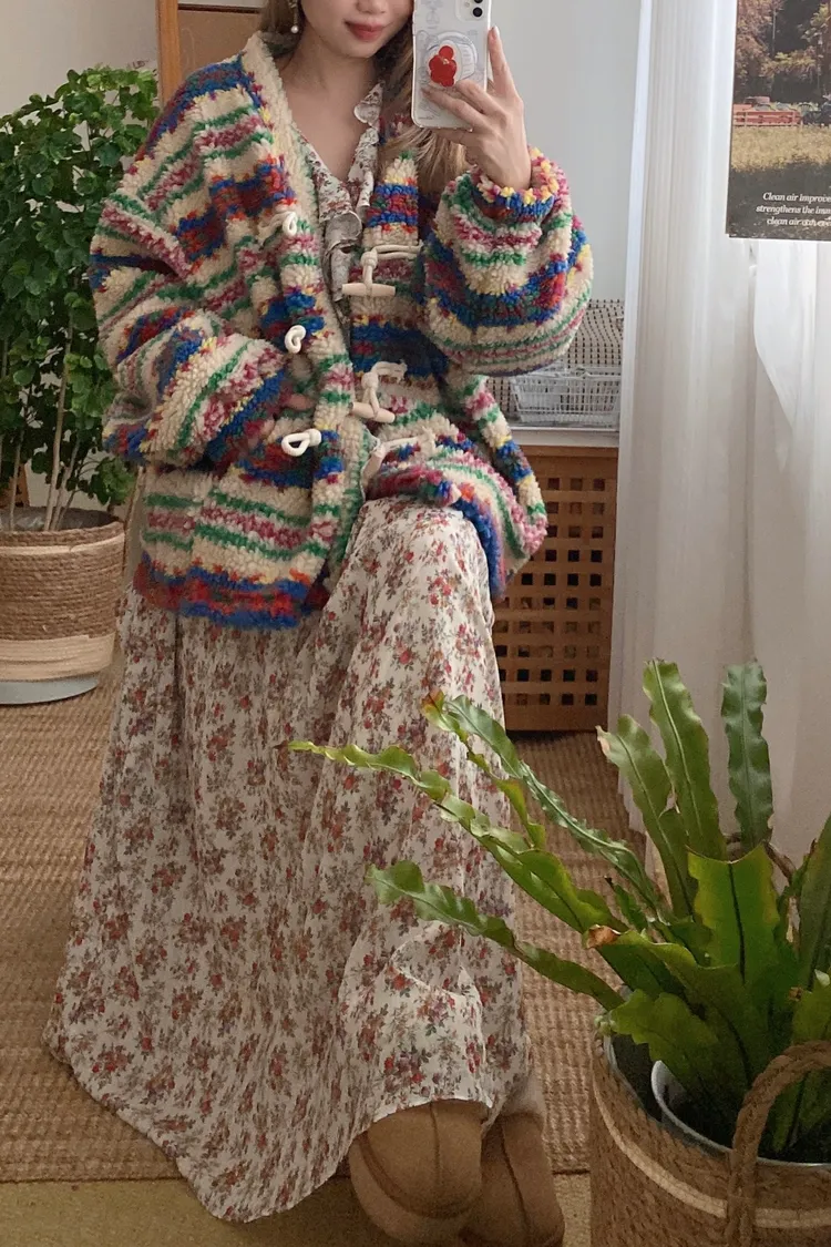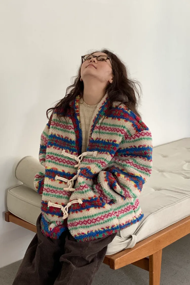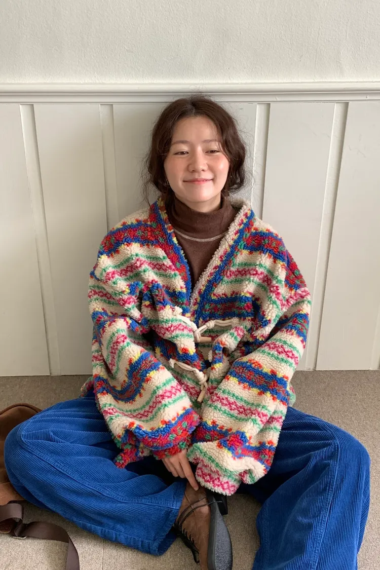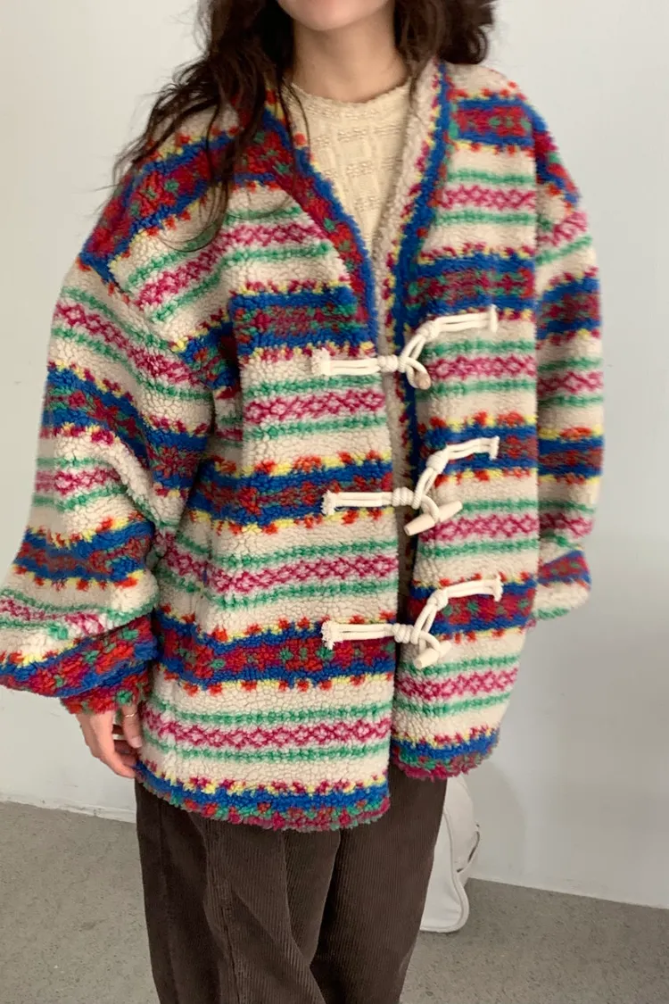 費爾島圖騰搭配牛角扣設計,甜美又帶小巧思