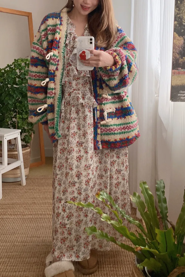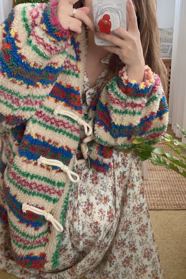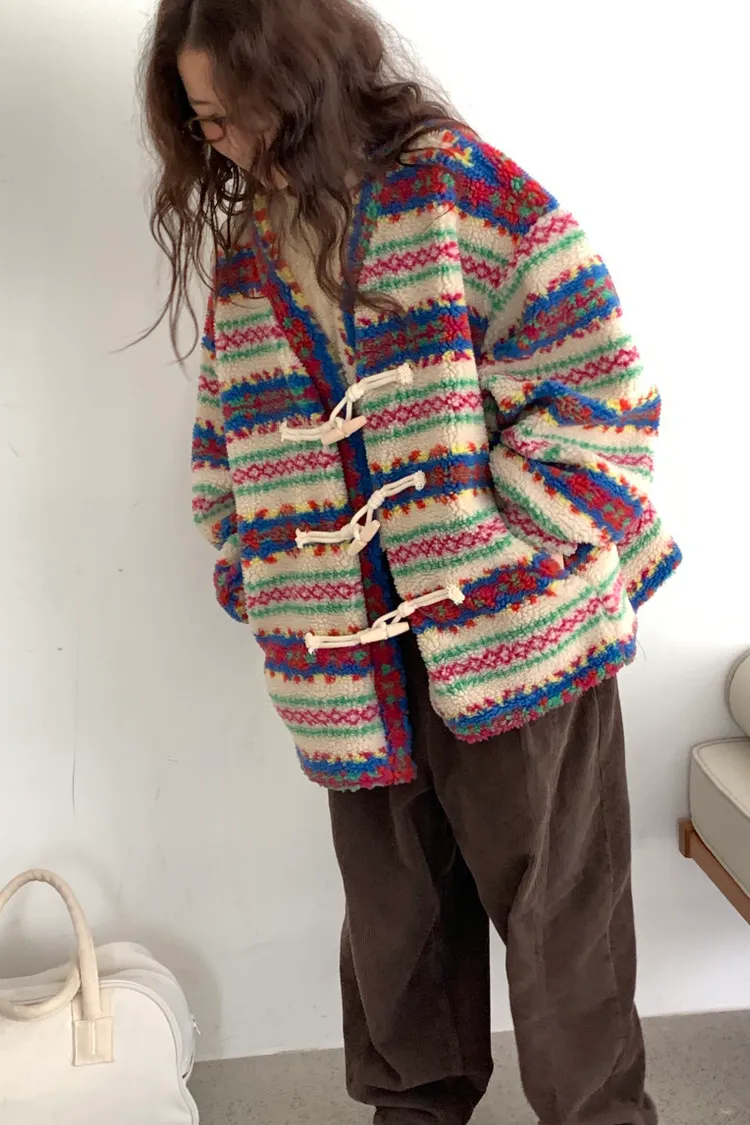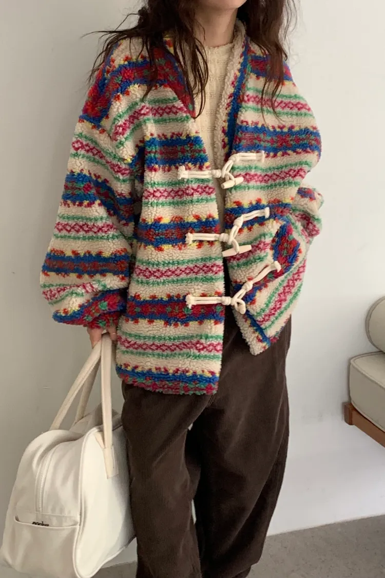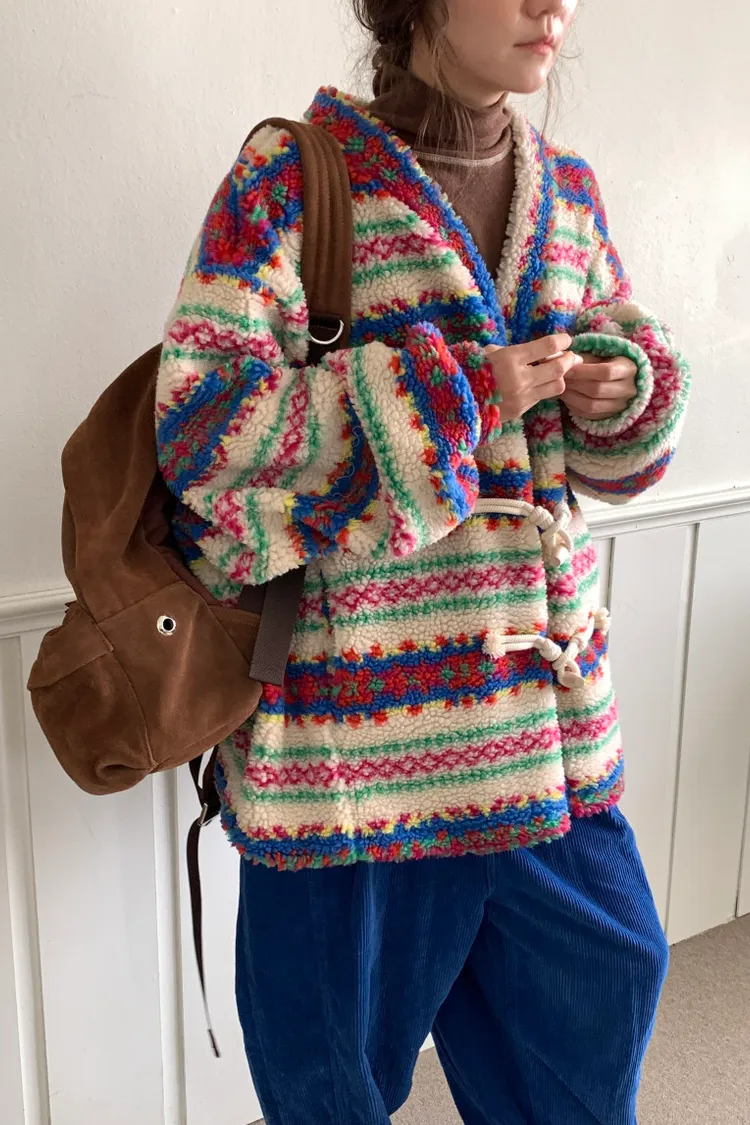 費爾島圖騰搭配牛角扣設計,甜美又帶小巧思
