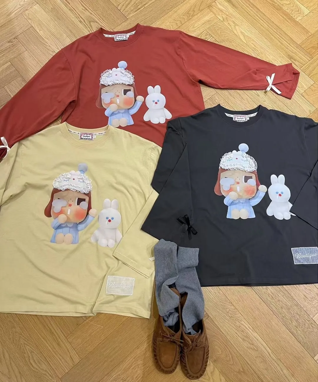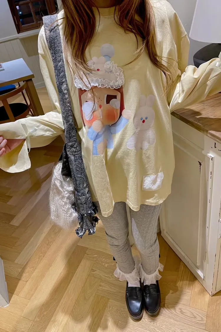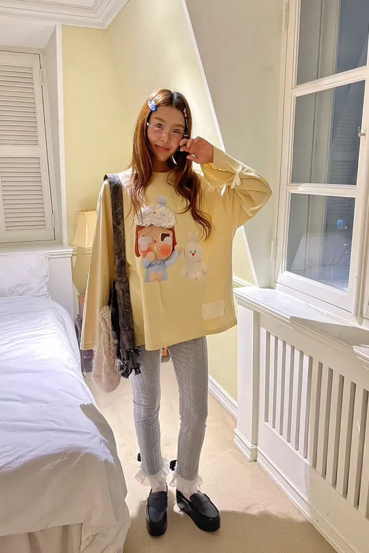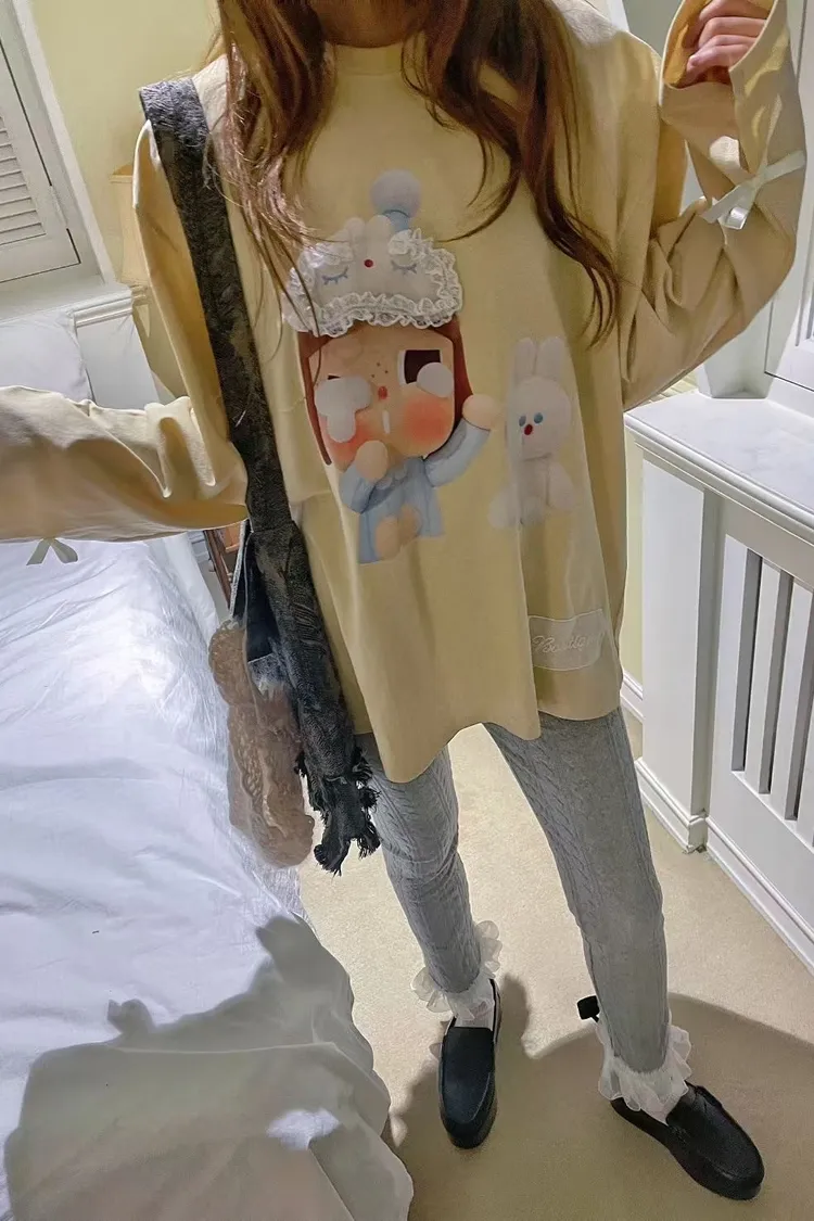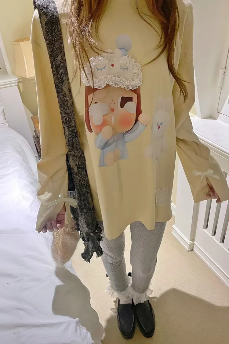 棉料材質、落肩寬鬆蓋臀版型機修飾身形,S-XL妞都可以穿 手袖有開衩和蝴蝶結緞帶點綴,舉手投足都甜甜的 最可愛的是哭娃穿著睡衣、戴著蕾絲緞帶眼罩 身旁還有萌萌兔兔相伴,光看就覺得療癒到心尖 穿上它絕對成為大家目光的焦點