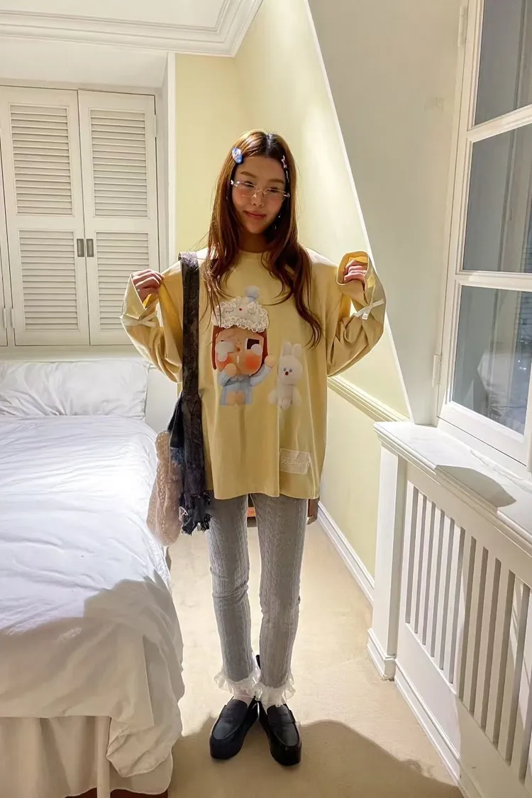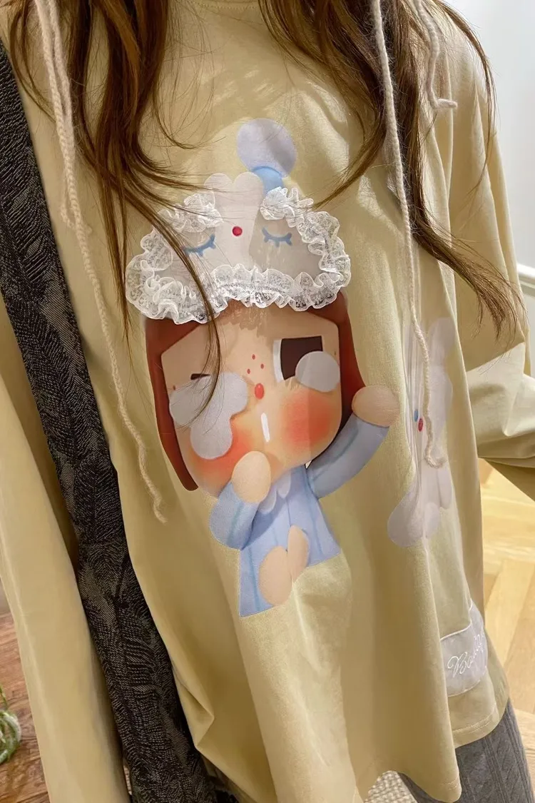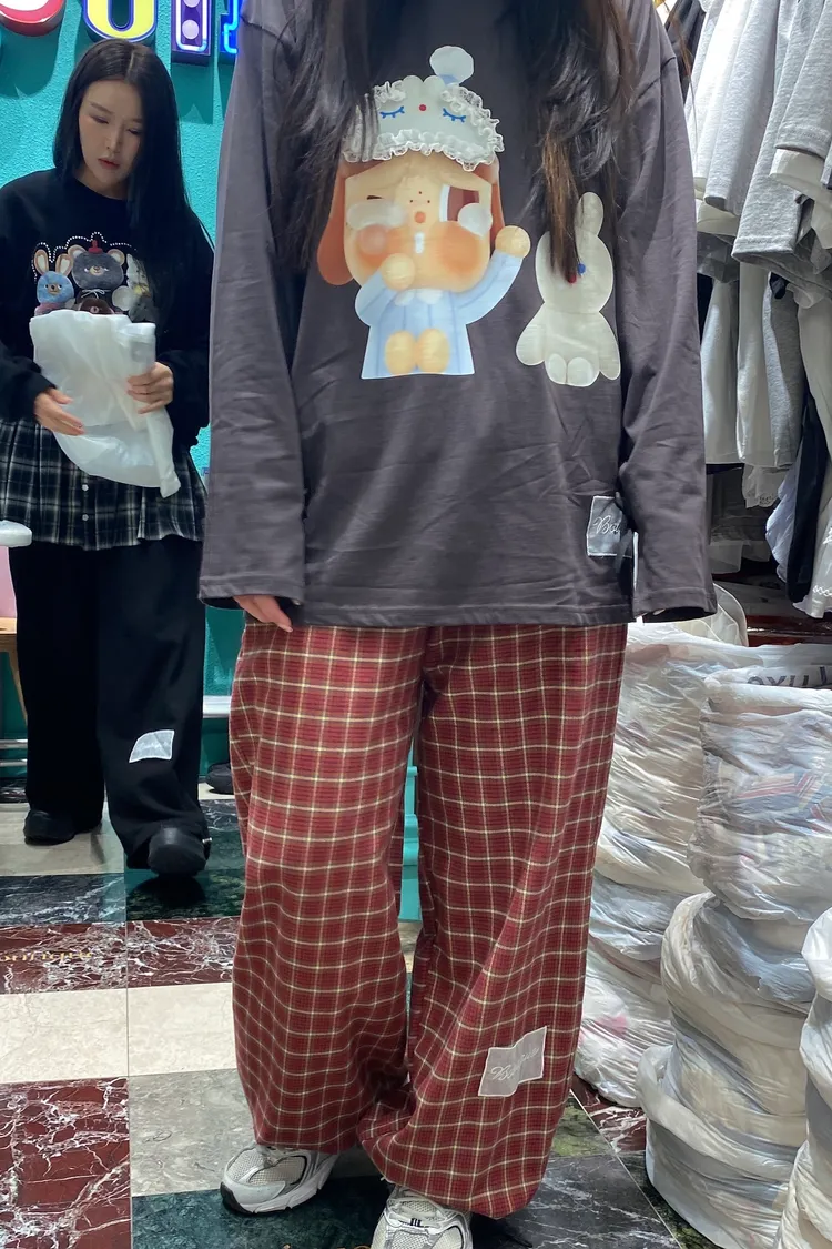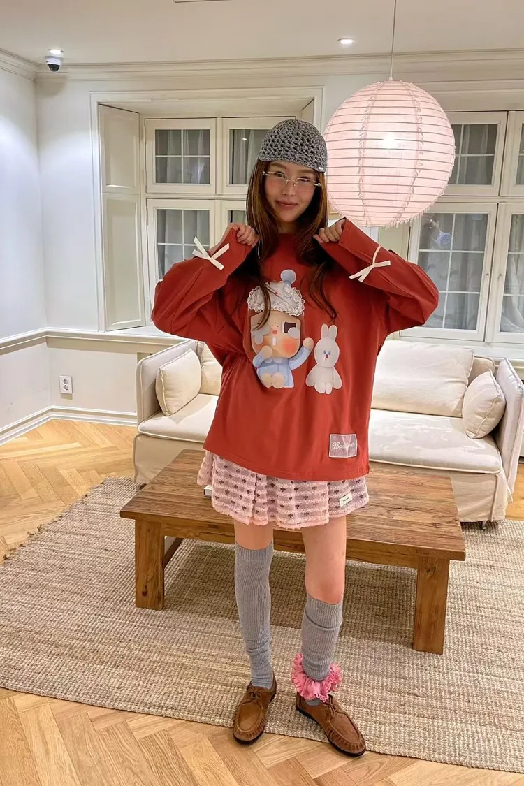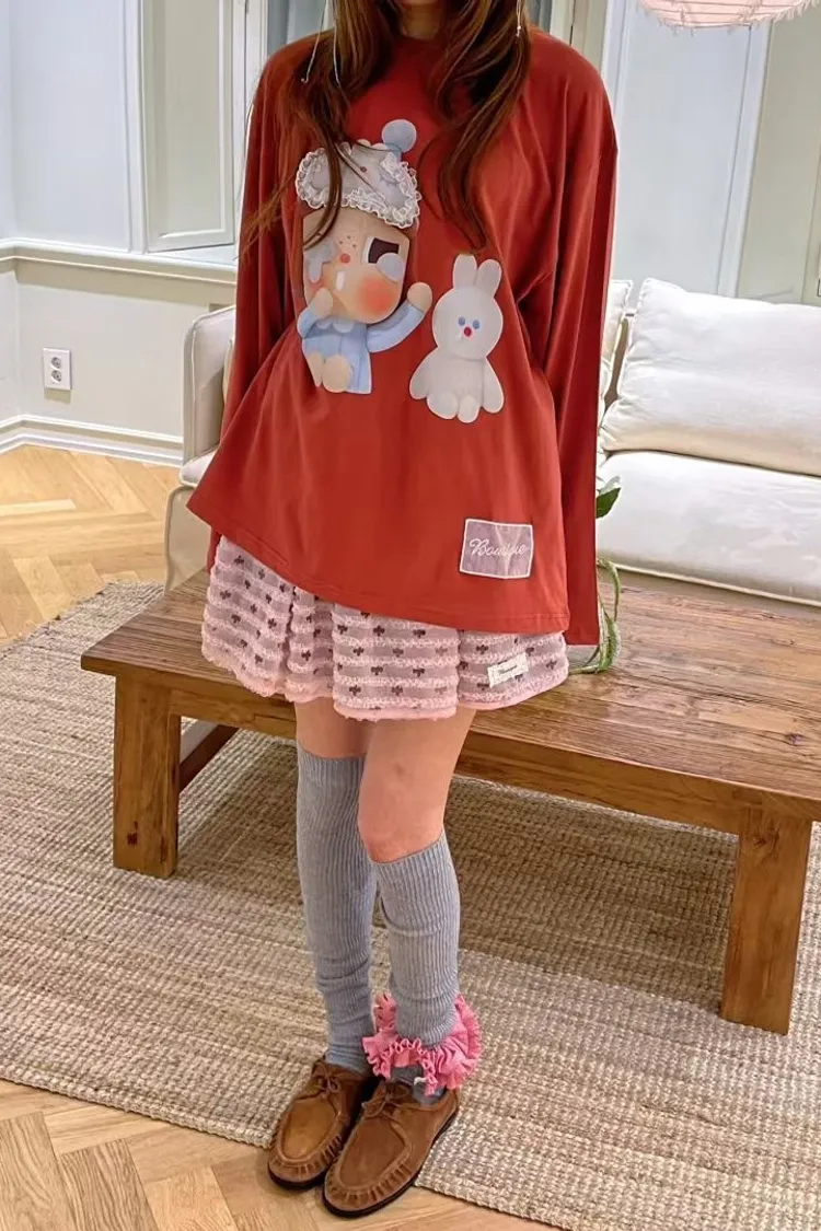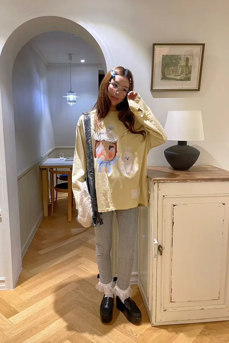 棉料材質、落肩寬鬆蓋臀版型機修飾身形,S-XL妞都可以穿 手袖有開衩和蝴蝶結緞帶點綴,舉手投足都甜甜的 最可愛的是哭娃穿著睡衣、戴著蕾絲緞帶眼罩 身旁還有萌萌兔兔相伴,光看就覺得療癒到心尖 穿上它絕對成為大家目光的焦點