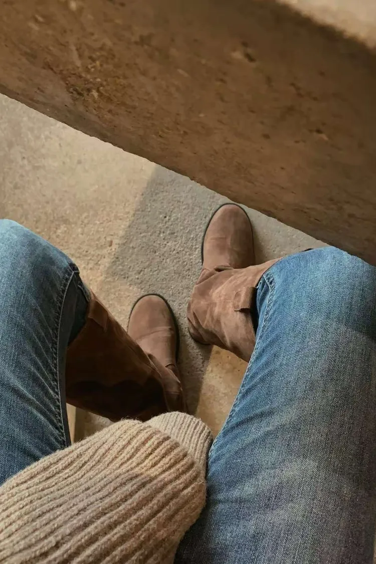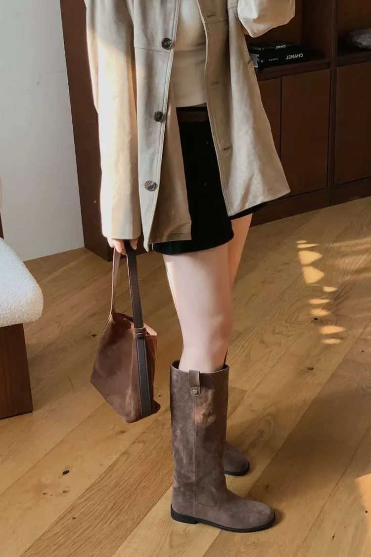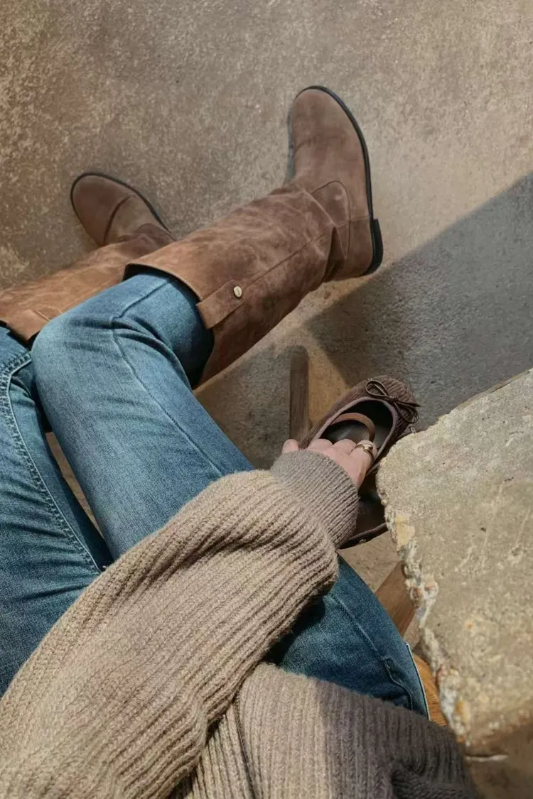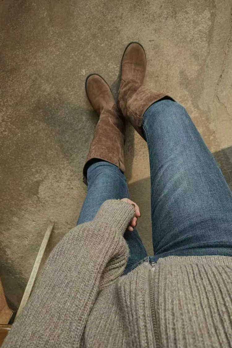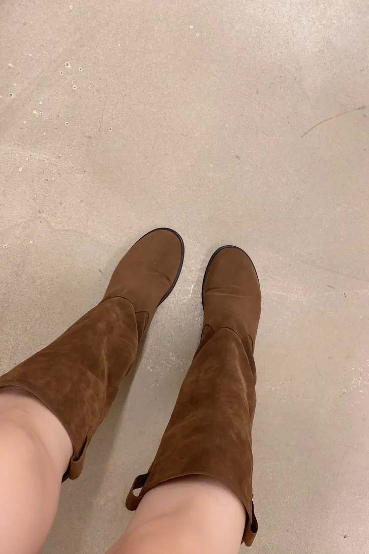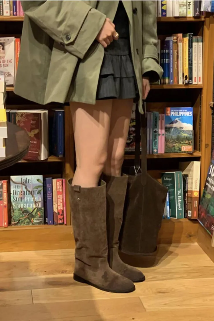 版型、材質、顏色、穿著感都很棒 膝下長靴版型,歐膩說為了防止靴子線條下垂 是有加了內襯的製作 不管什麼衣服都很百搭的基礎款 質感很好的麂皮材質,棕色是偏灰棕的非常好看 側邊有個小金標誌,簡約又帶有小亮點 穿著感舒服不會悶,不習慣高跟的這款可以輕鬆駕馭 鞋底有防滑設計 艾蜜平常穿23.5或24,這款拿24,穿長襪都還有空間 秋冬內搭羊毛襪也沒問題