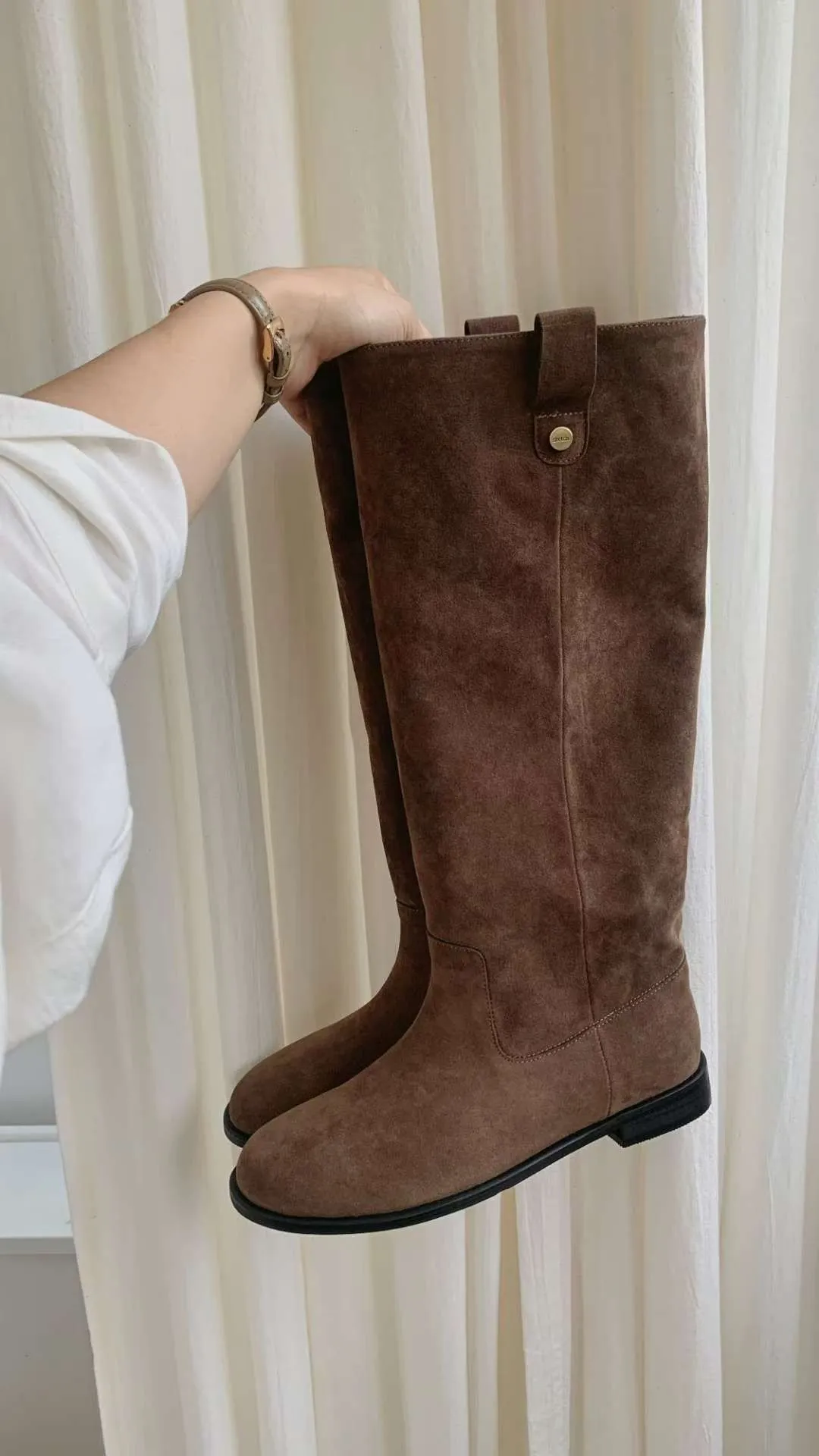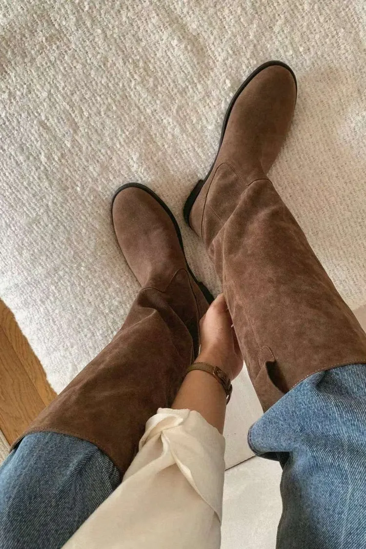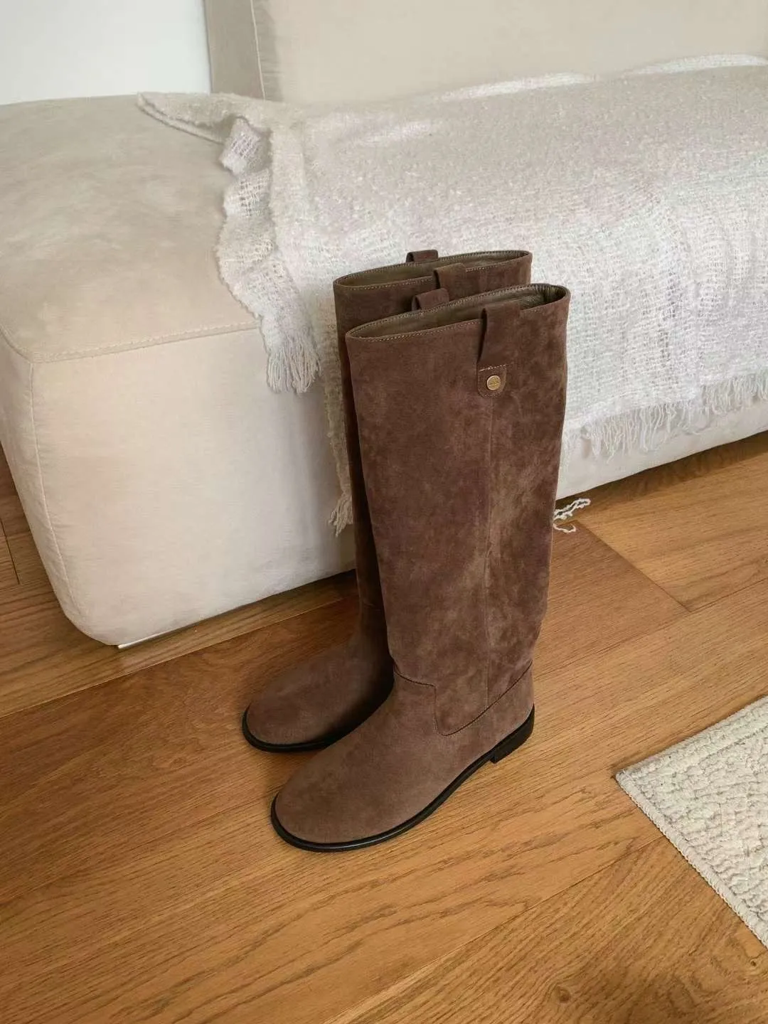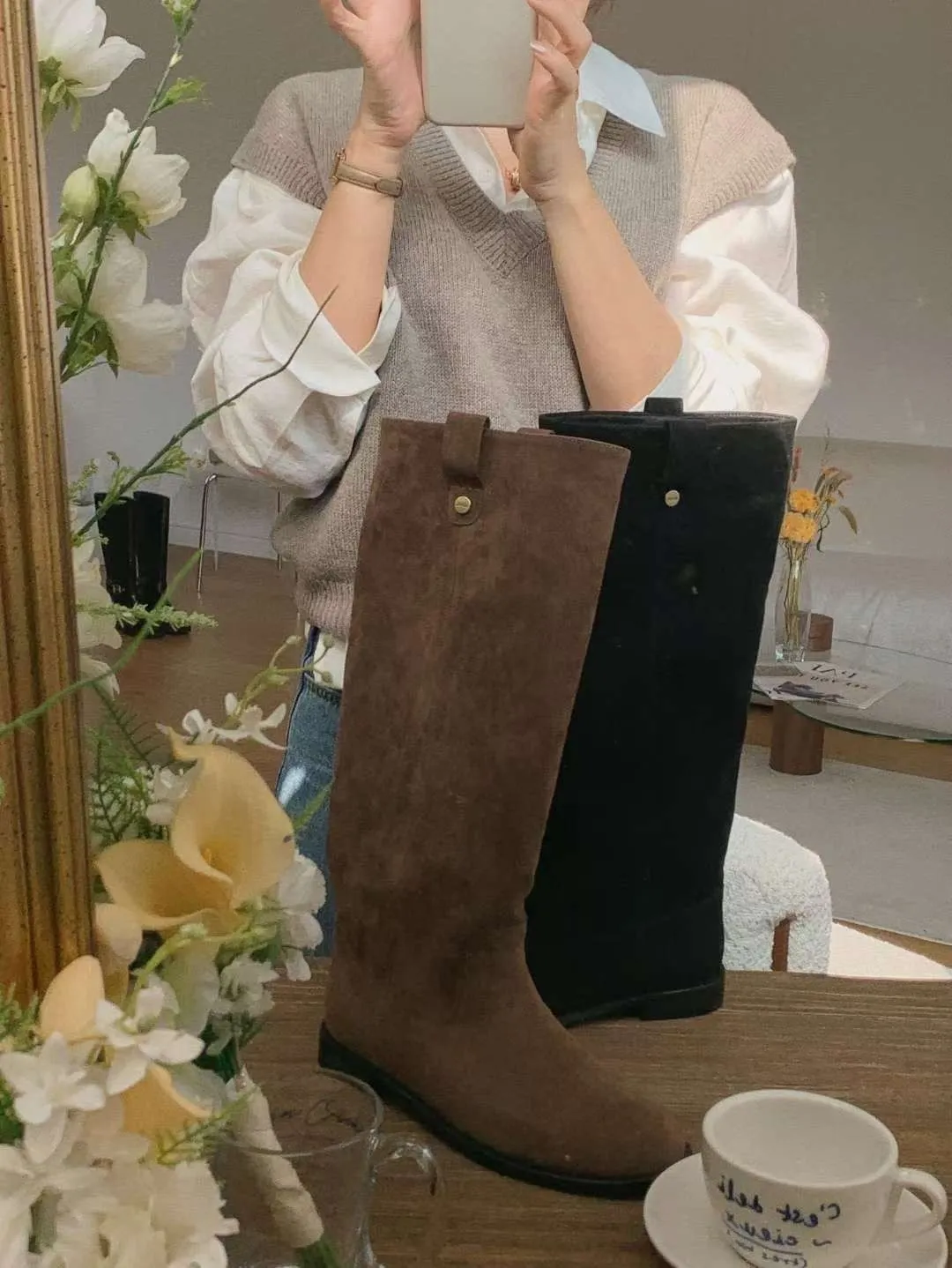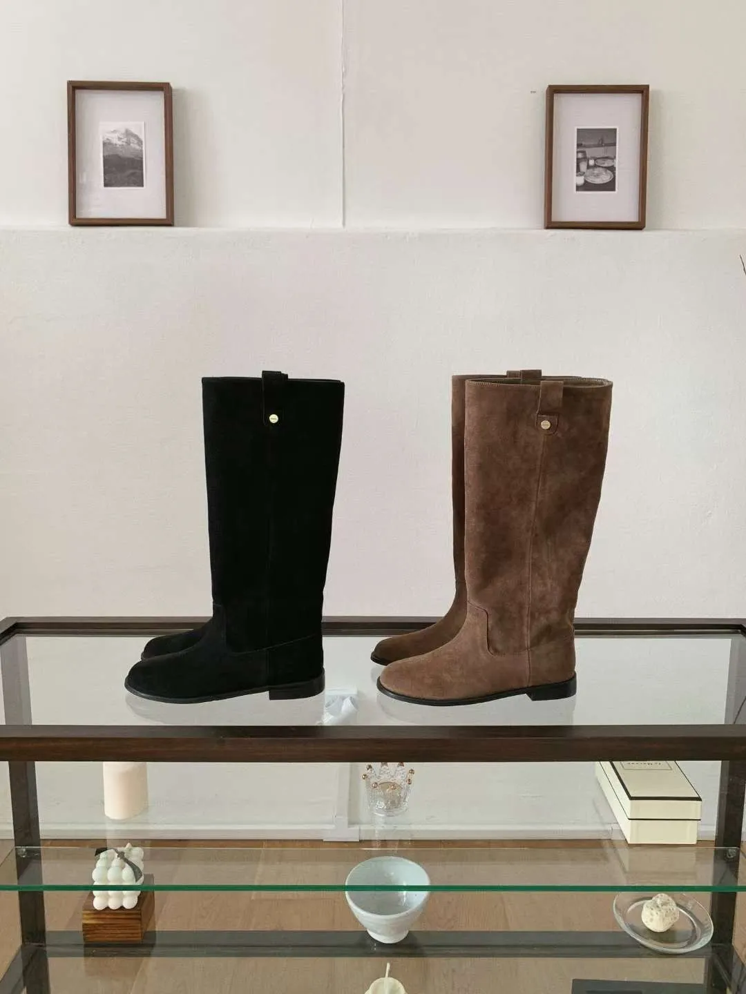 版型、材質、顏色、穿著感都很棒 膝下長靴版型,歐膩說為了防止靴子線條下垂 是有加了內襯的製作 不管什麼衣服都很百搭的基礎款 質感很好的麂皮材質,棕色是偏灰棕的非常好看 側邊有個小金標誌,簡約又帶有小亮點 穿著感舒服不會悶,不習慣高跟的這款可以輕鬆駕馭 鞋底有防滑設計 艾蜜平常穿23.5或24,這款拿24,穿長襪都還有空間 秋冬內搭羊毛襪也沒問題