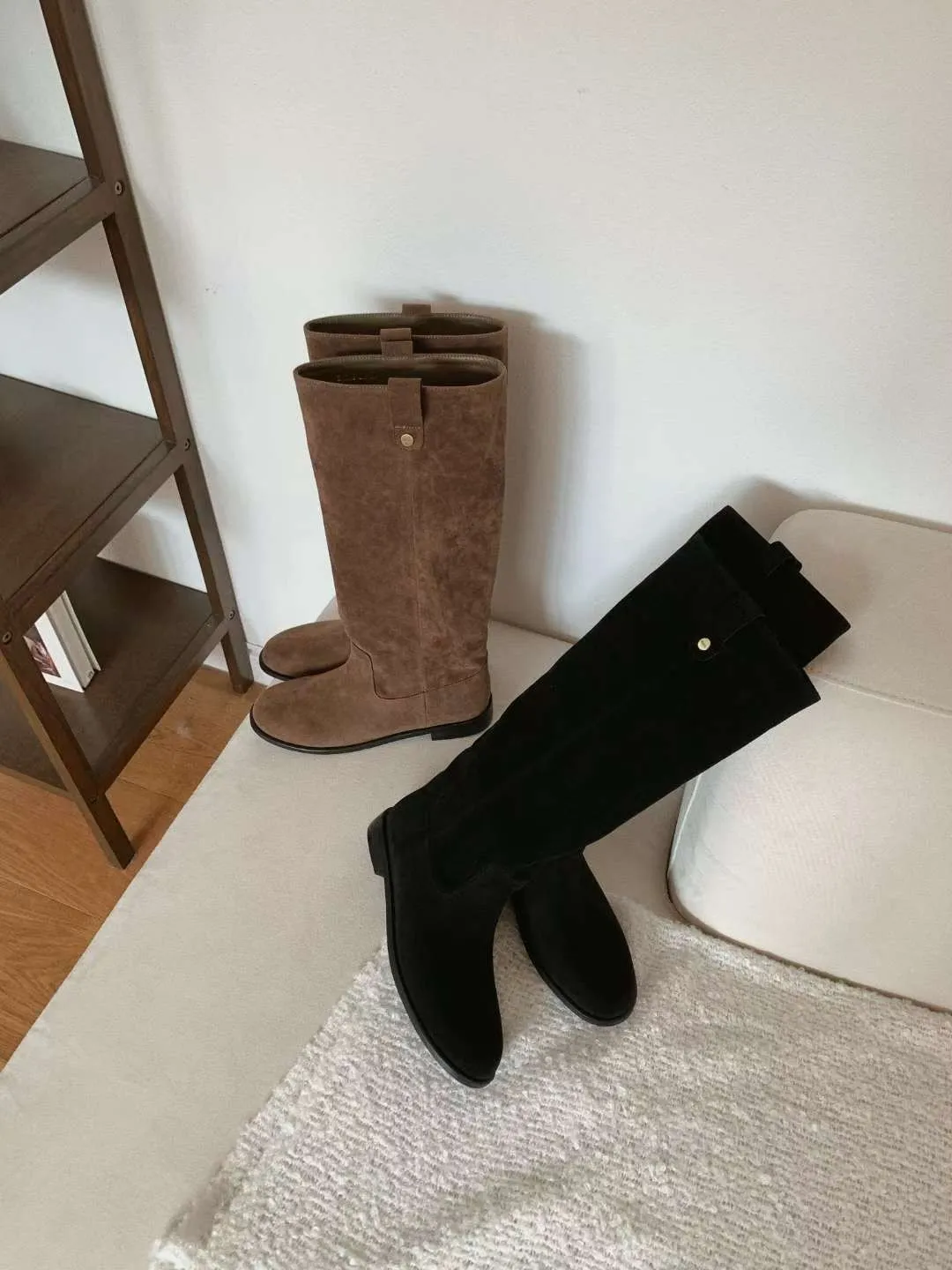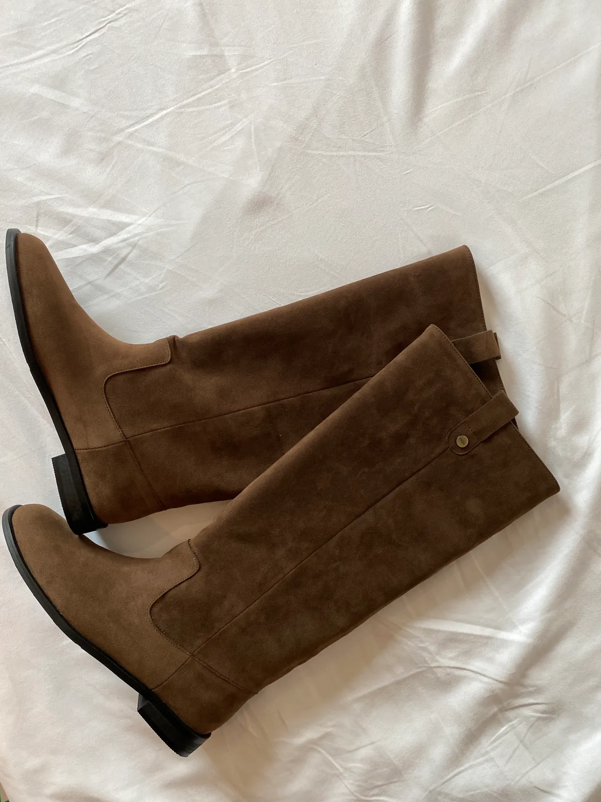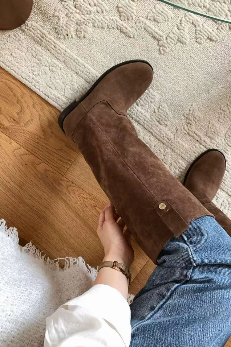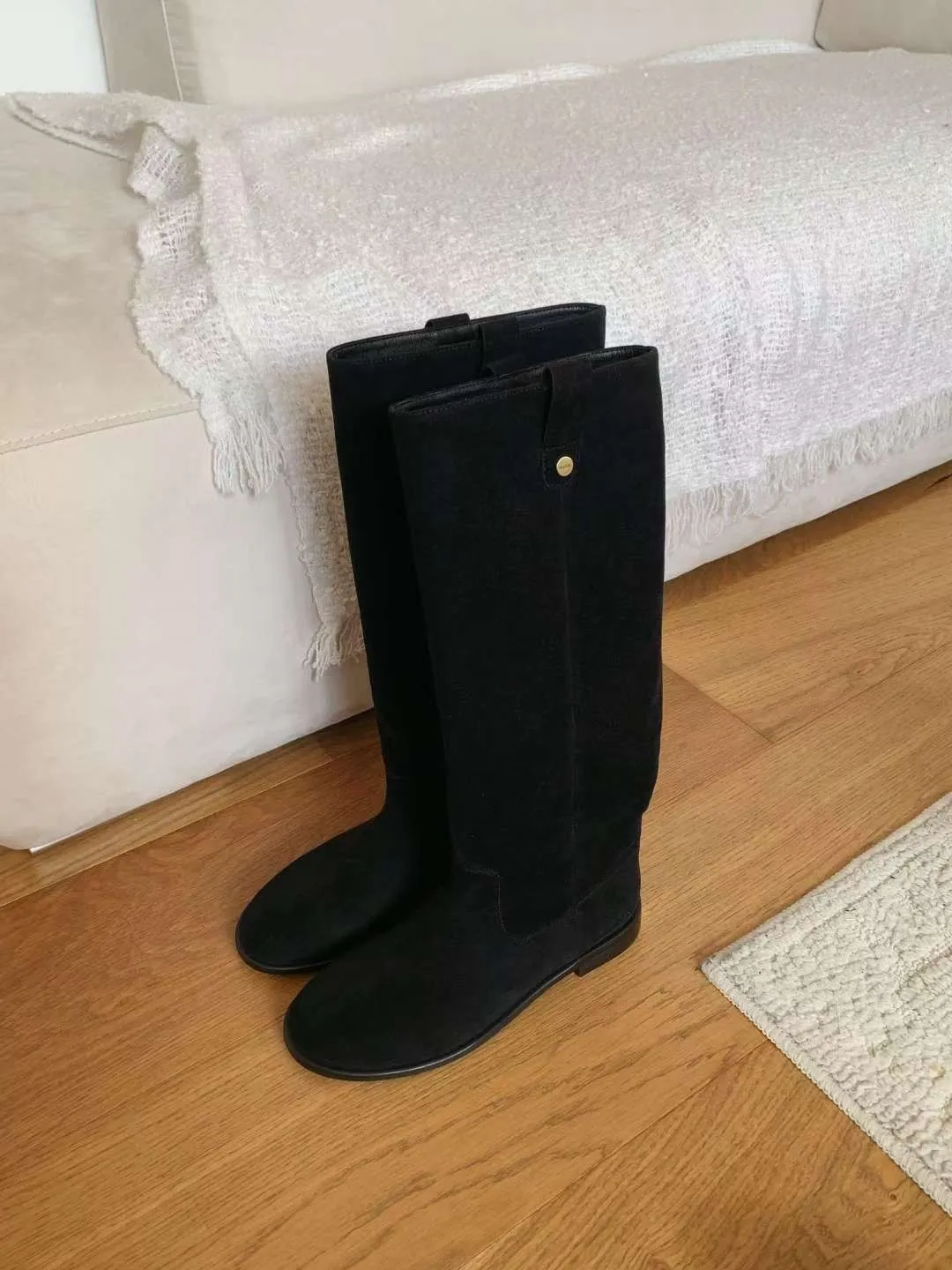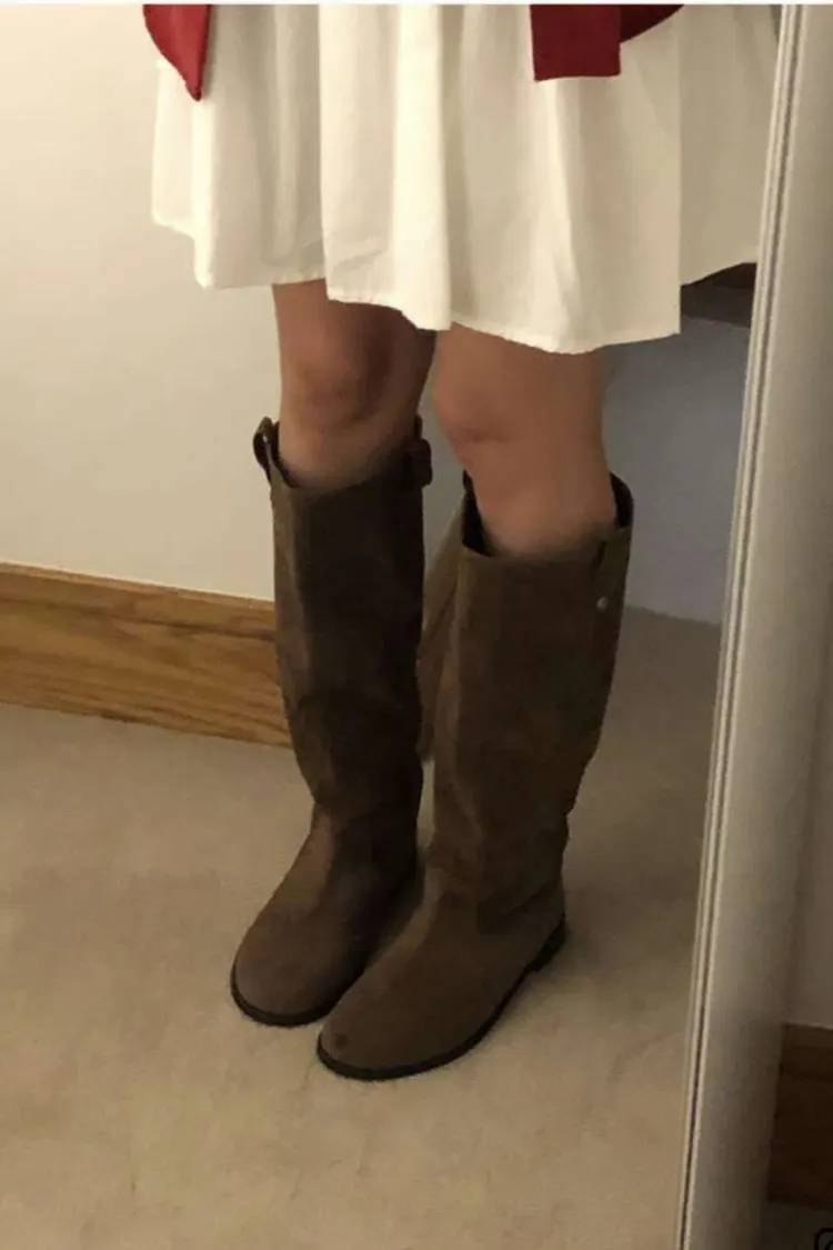 版型、材質、顏色、穿著感都很棒 膝下長靴版型,歐膩說為了防止靴子線條下垂 是有加了內襯的製作 不管什麼衣服都很百搭的基礎款 質感很好的麂皮材質,棕色是偏灰棕的非常好看 側邊有個小金標誌,簡約又帶有小亮點 穿著感舒服不會悶,不習慣高跟的這款可以輕鬆駕馭 鞋底有防滑設計 艾蜜平常穿23.5或24,這款拿24,穿長襪都還有空間 秋冬內搭羊毛襪也沒問題