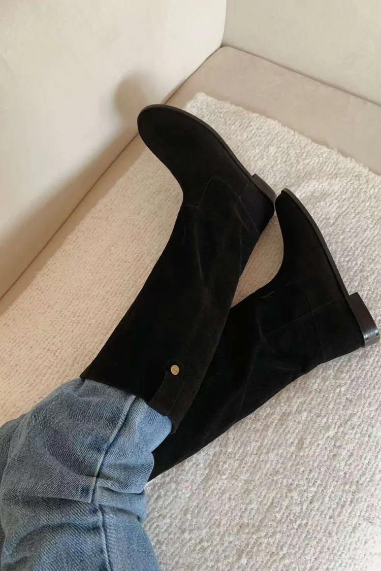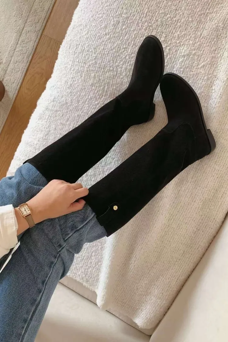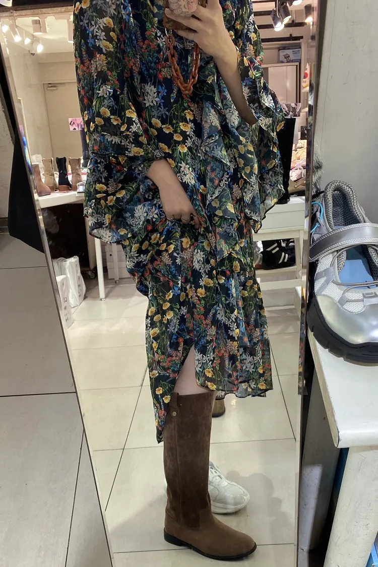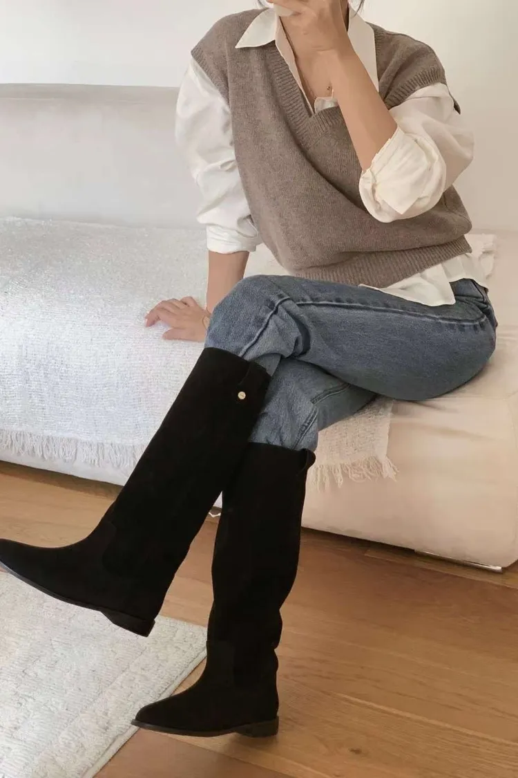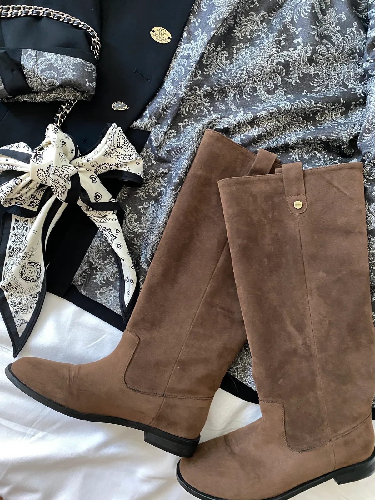 版型、材質、顏色、穿著感都很棒 膝下長靴版型,歐膩說為了防止靴子線條下垂 是有加了內襯的製作 不管什麼衣服都很百搭的基礎款 質感很好的麂皮材質,棕色是偏灰棕的非常好看 側邊有個小金標誌,簡約又帶有小亮點 穿著感舒服不會悶,不習慣高跟的這款可以輕鬆駕馭 鞋底有防滑設計 艾蜜平常穿23.5或24,這款拿24,穿長襪都還有空間 秋冬內搭羊毛襪也沒問題