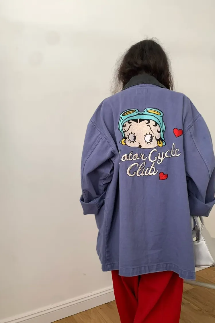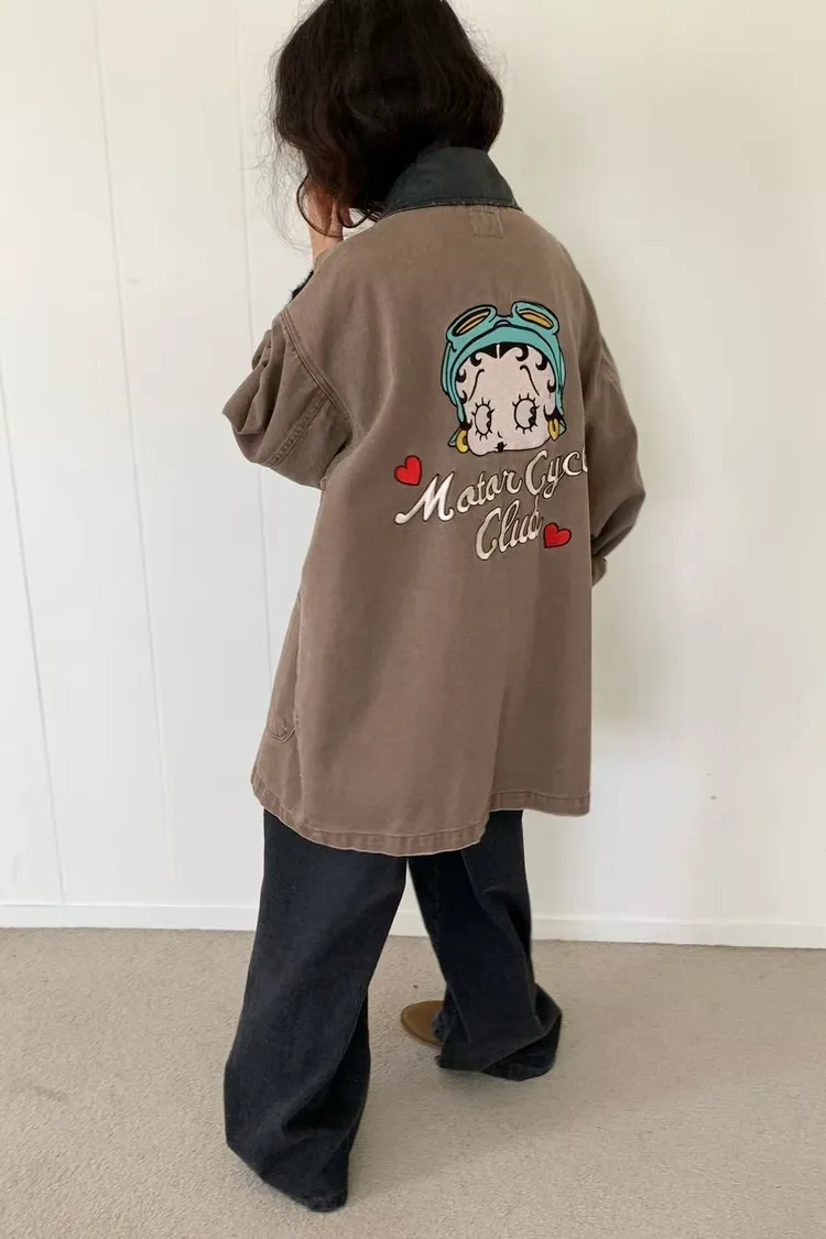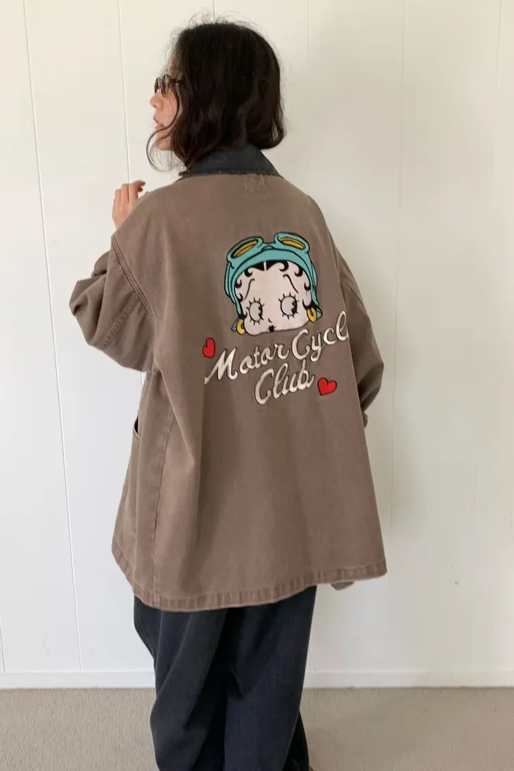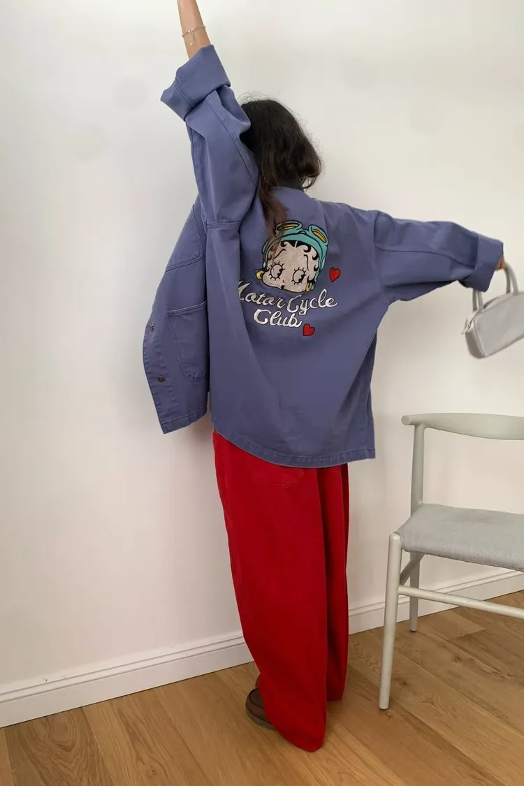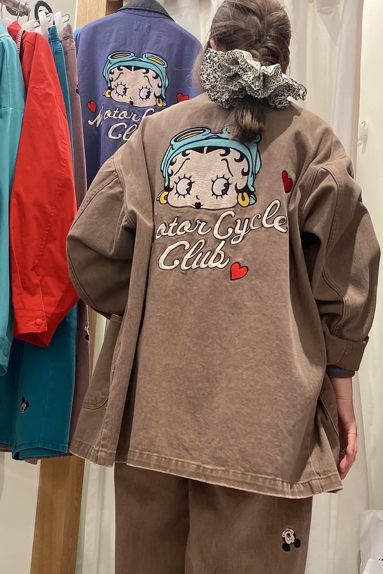 棉料牛仔面料,正面四個大口袋設計滿滿工裝感,實用又有型 寬鬆版型可蓋臀,S-L妞都可以穿,怎麼穿都自在 撞色翻領加上背面超可愛的貝蒂刺繡,轉身就是驚喜亮點 街頭感裡又帶一點俏皮氛圍 無論是休閒褲裝還是小短裙搭配都能輕鬆展現個性女孩的酷甜魅力~