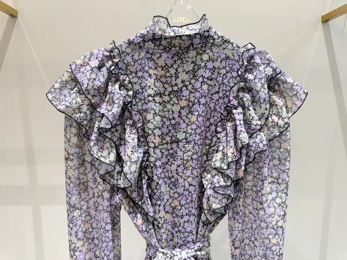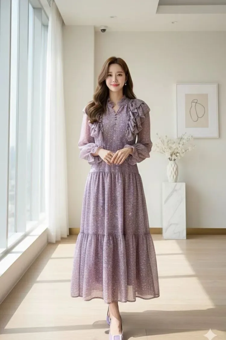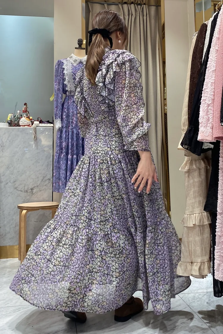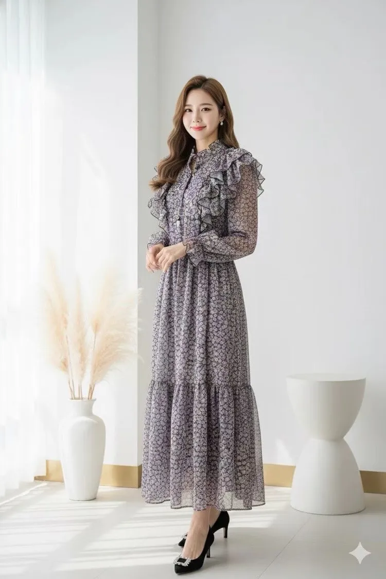 碎花圖紋輕飄飄雪紡料子,隨著走動輕盈搖曳,浪漫感滿分 寬鬆版型,S-L妞、孕媽咪都可以穿 領口排扣,全扣上就是荷葉立領、不全扣開幾個就變成小V領 胸到肩後拼接雙層波浪花邊加上袖口彈性鬆緊,細節甜美又不單調 有內襯艾蜜160公分穿到腳踝小幫手166公分穿到蓋小腿