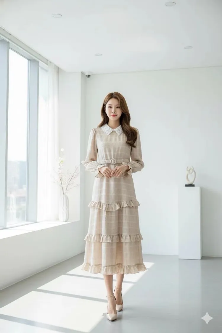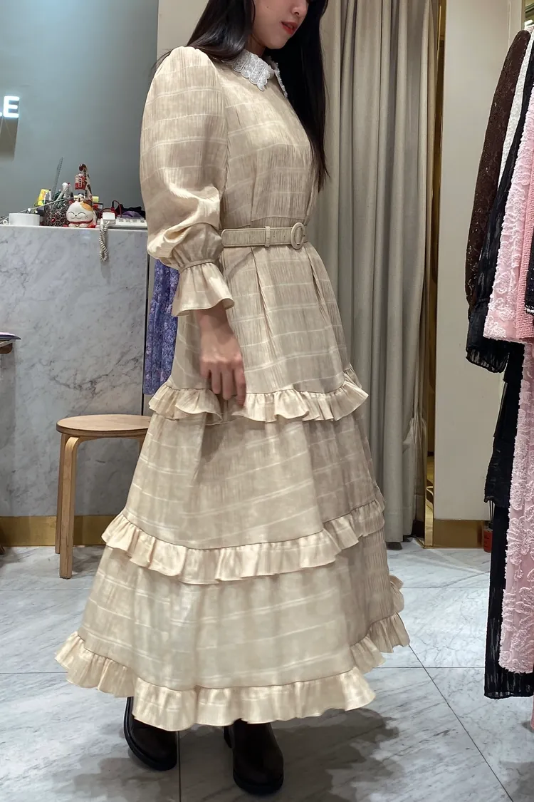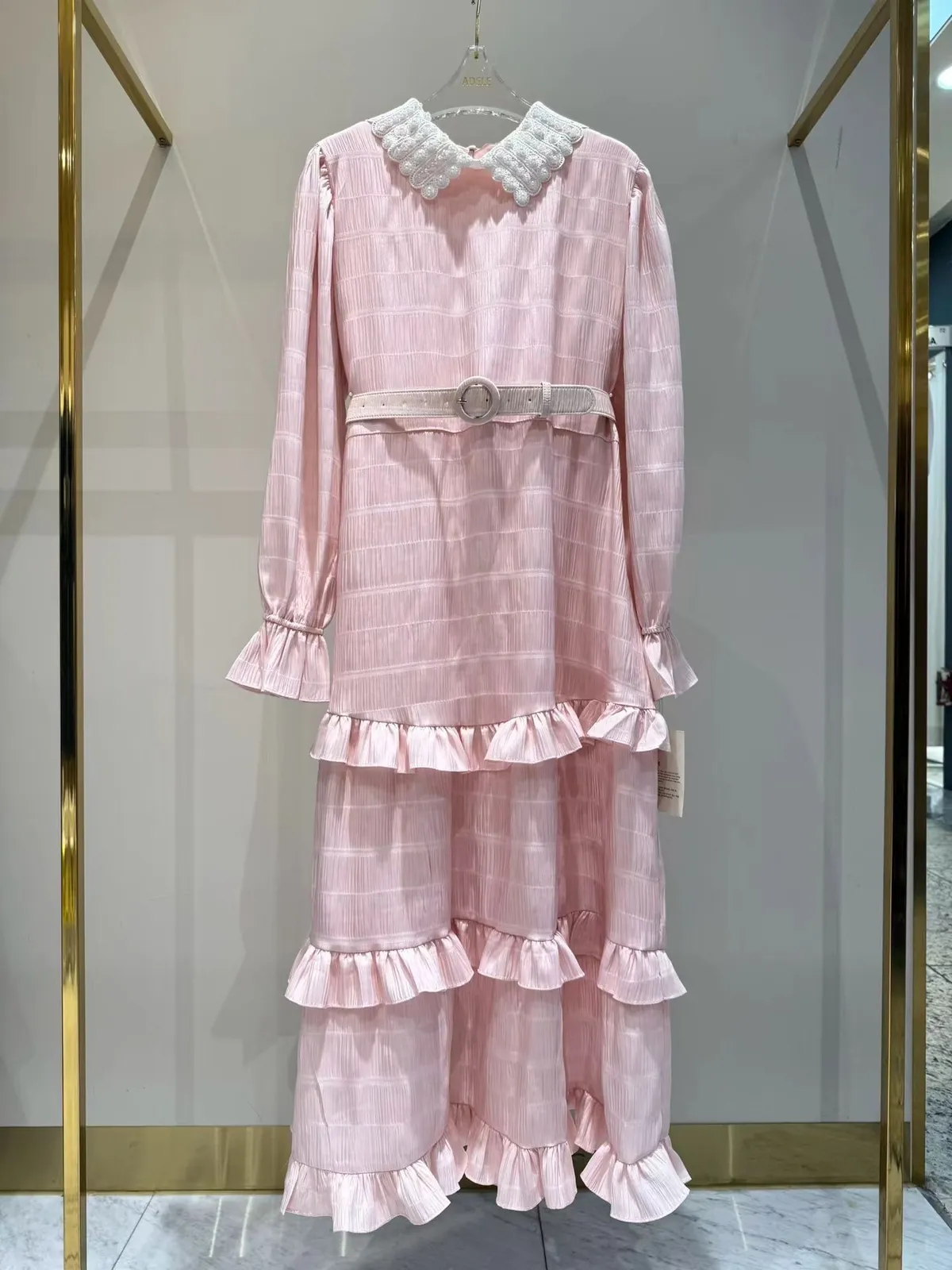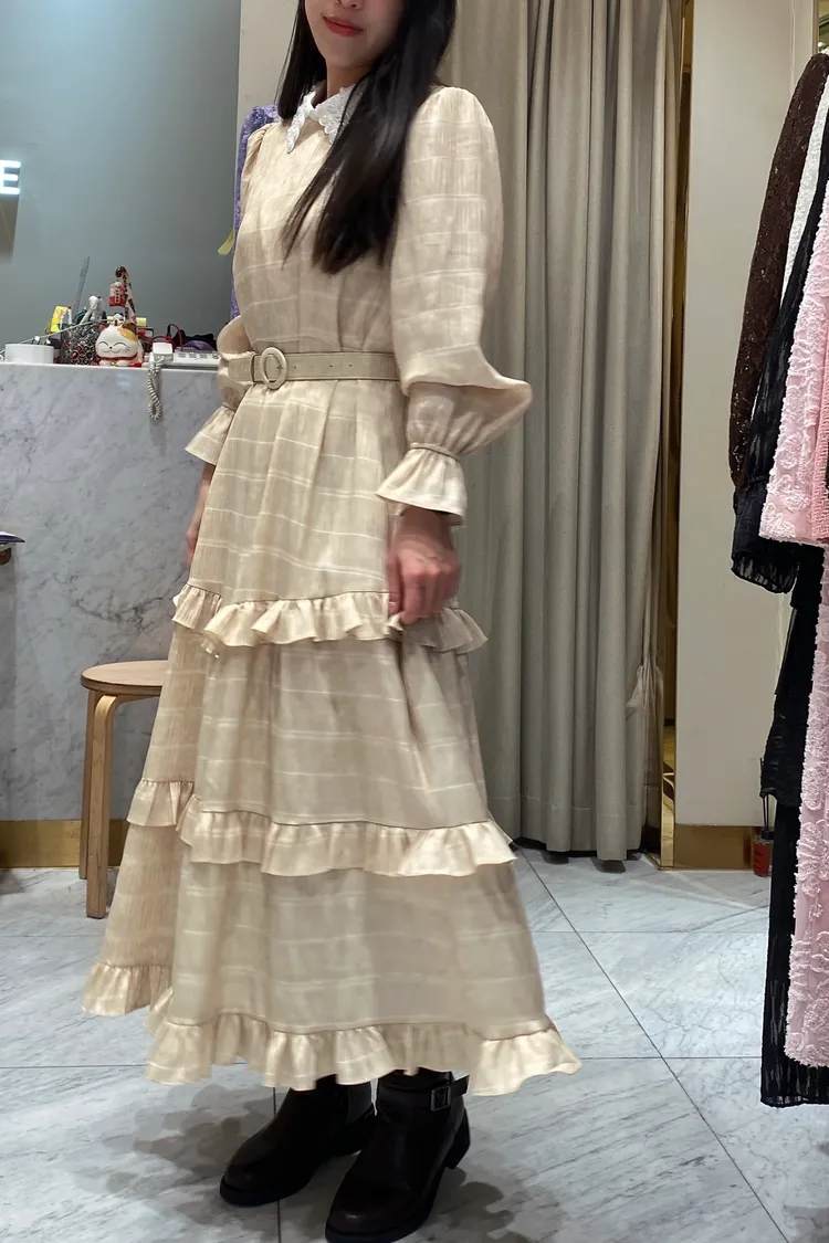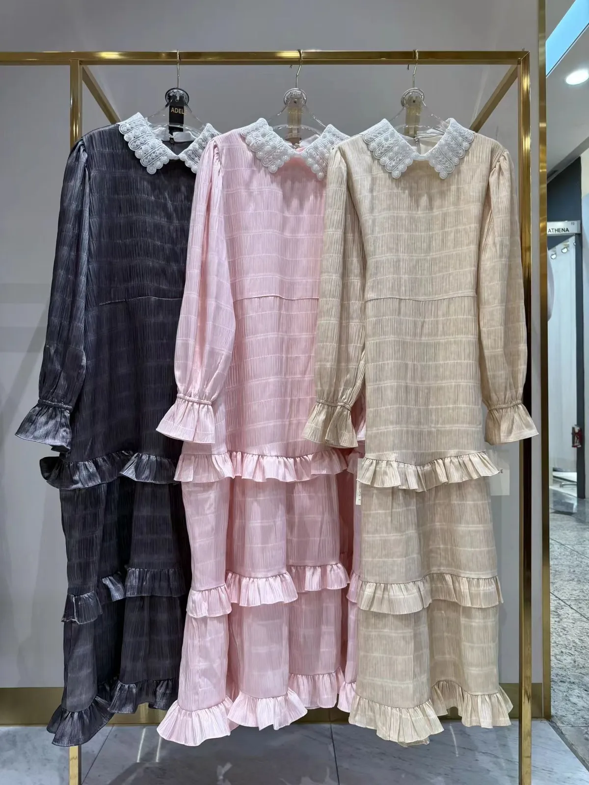 帶有細壓褶、珠光感的聚脂纖維壓折面料,走動時微微閃耀 裙擺抓皺折花邊增加浪漫層次感 小翻領上都是釘珠,細節很美,細節滿分,甜美又不浮誇 寬鬆版型,S-L妞、孕媽咪都可以穿 背面有拉鍊好穿脫、袖口彈性鬆緊、有內襯小幫手166公分穿到蓋小腿