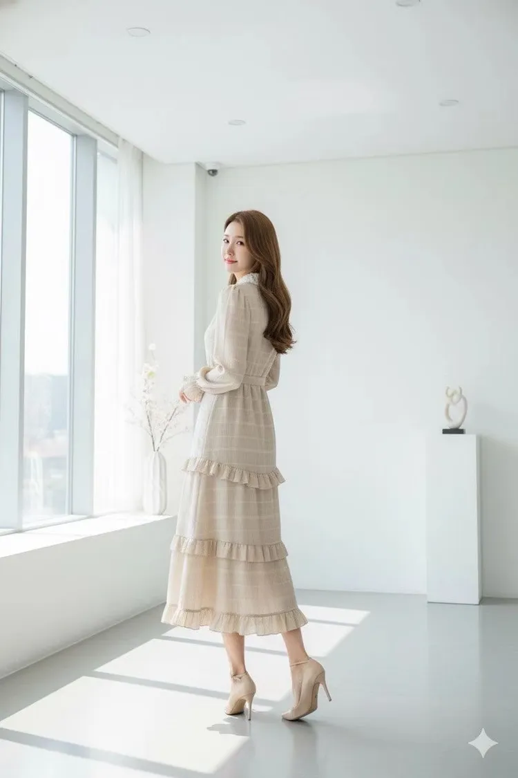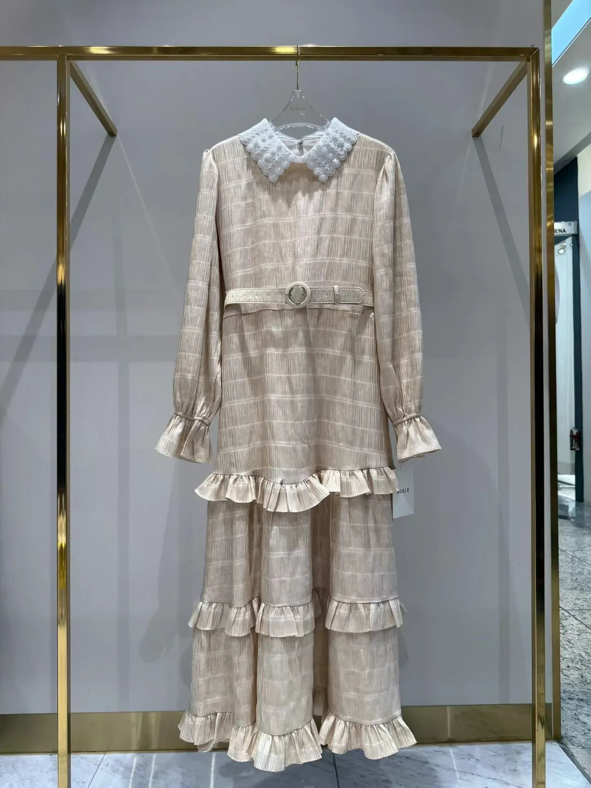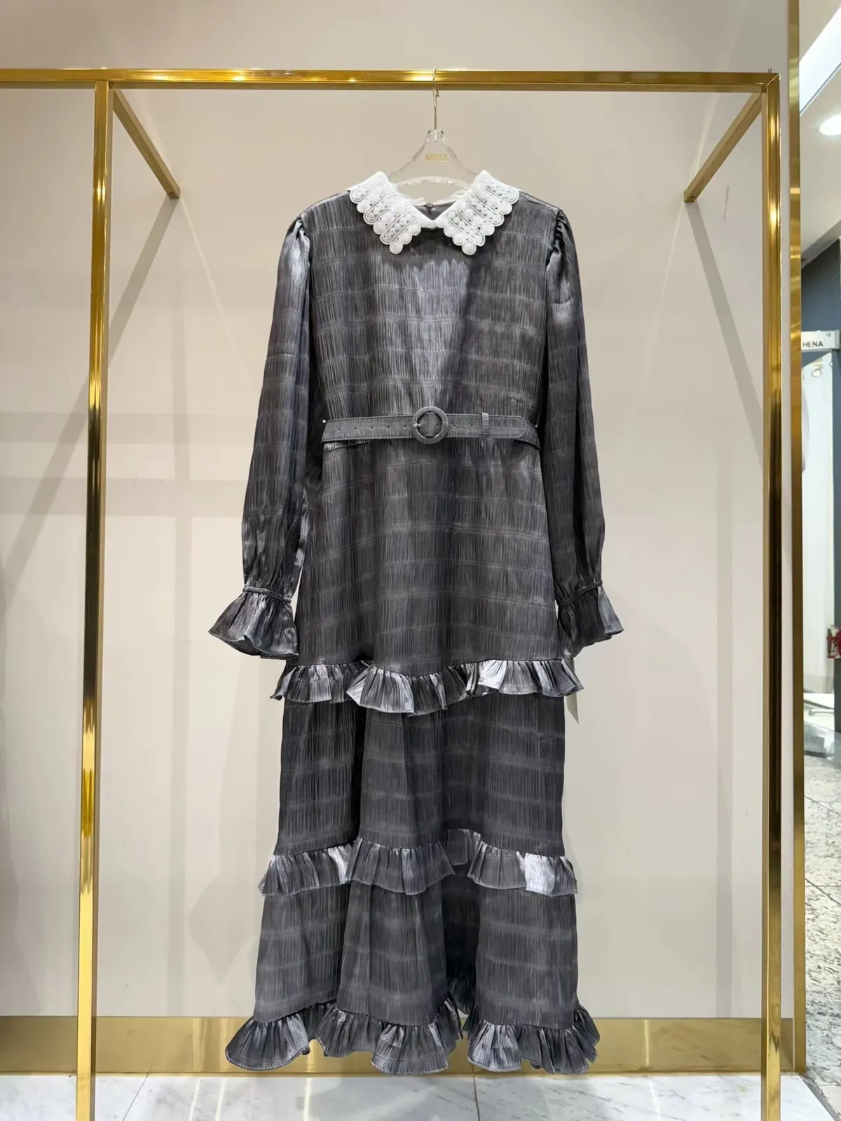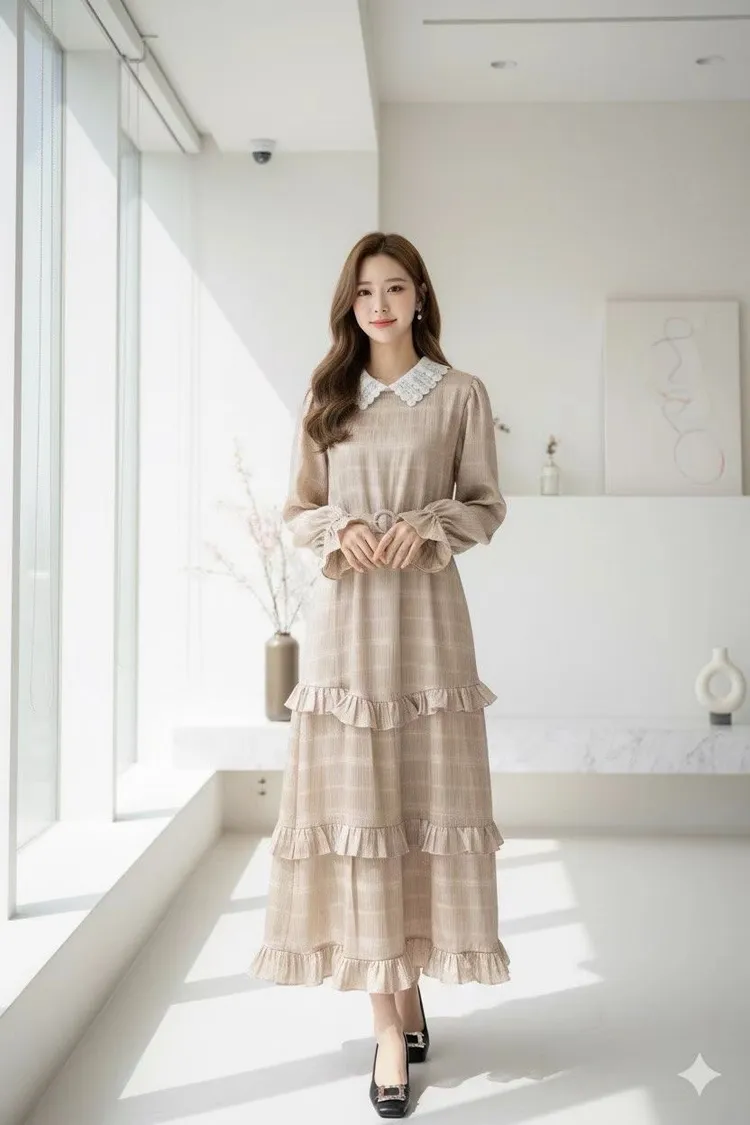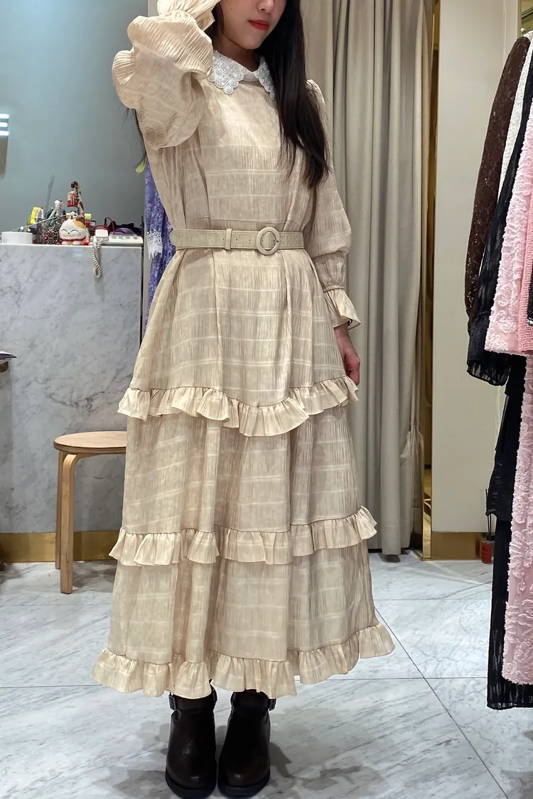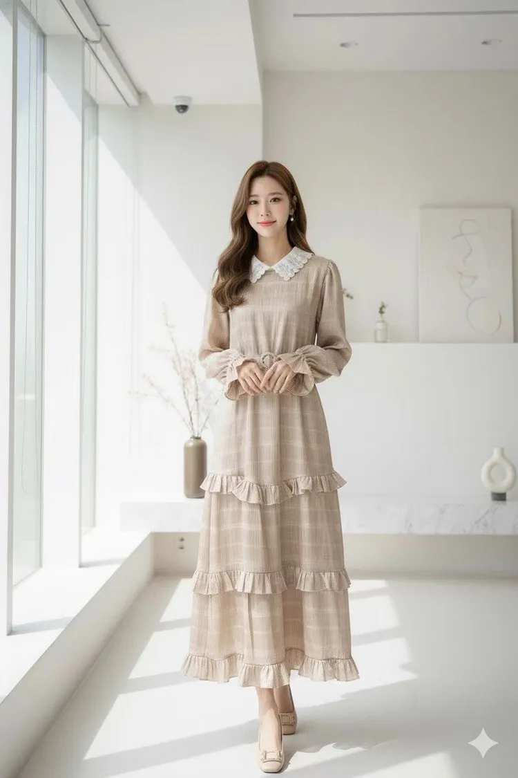 帶有細壓褶、珠光感的聚脂纖維壓折面料,走動時微微閃耀 裙擺抓皺折花邊增加浪漫層次感 小翻領上都是釘珠,細節很美,細節滿分,甜美又不浮誇 寬鬆版型,S-L妞、孕媽咪都可以穿 背面有拉鍊好穿脫、袖口彈性鬆緊、有內襯小幫手166公分穿到蓋小腿
