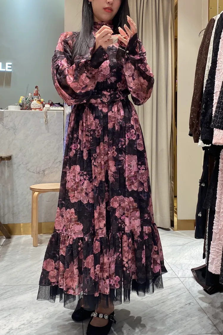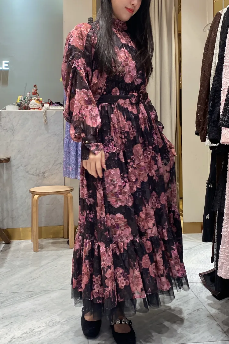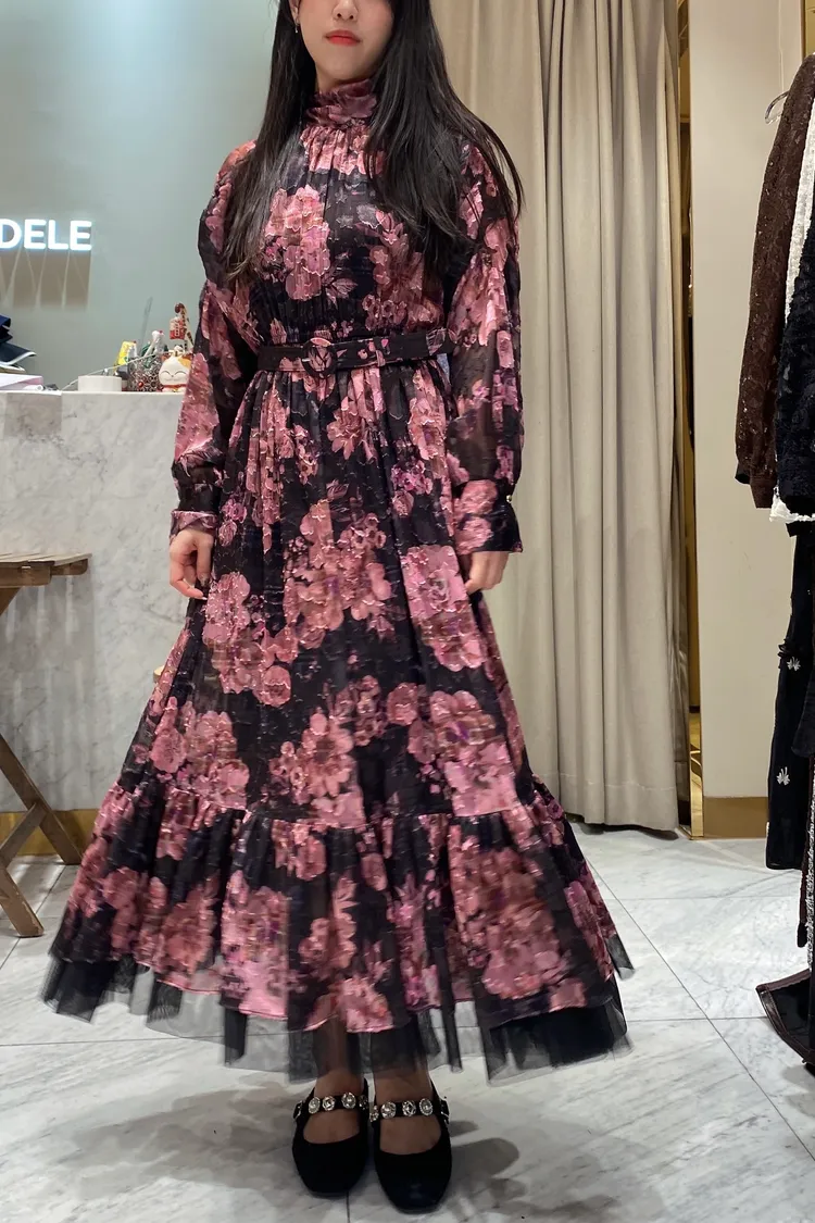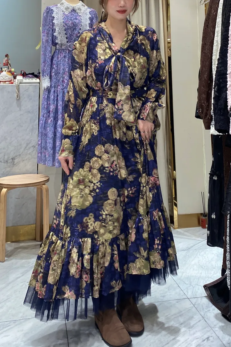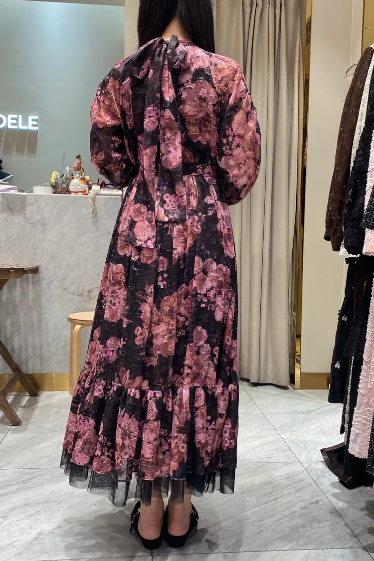 帶珠光感的重工緹花絲質面料高級又有質感 正反兩穿,蝴蝶結穿在正面OK、穿在背面也很優雅 胸下高腰設計、腰部整圈彈性鬆緊,S-L妞都可以穿手袖有珍珠釦 裙擺有網紗層次拼接增添浪漫飄逸感、有內襯艾蜜160公分穿到腳踝小幫手166公分穿到小腿