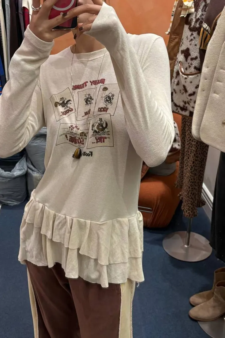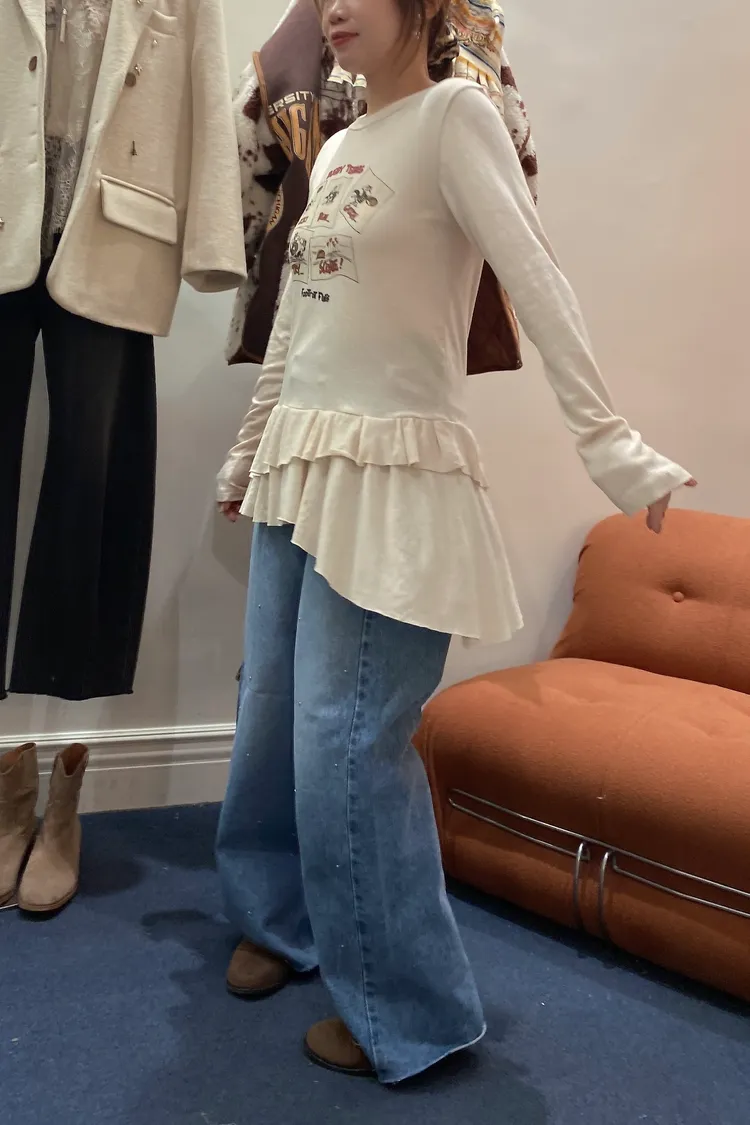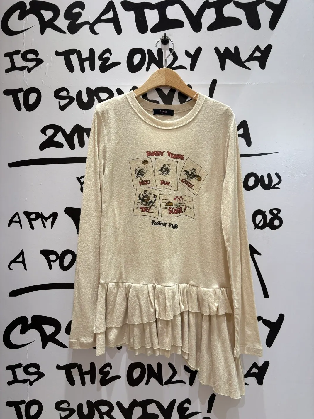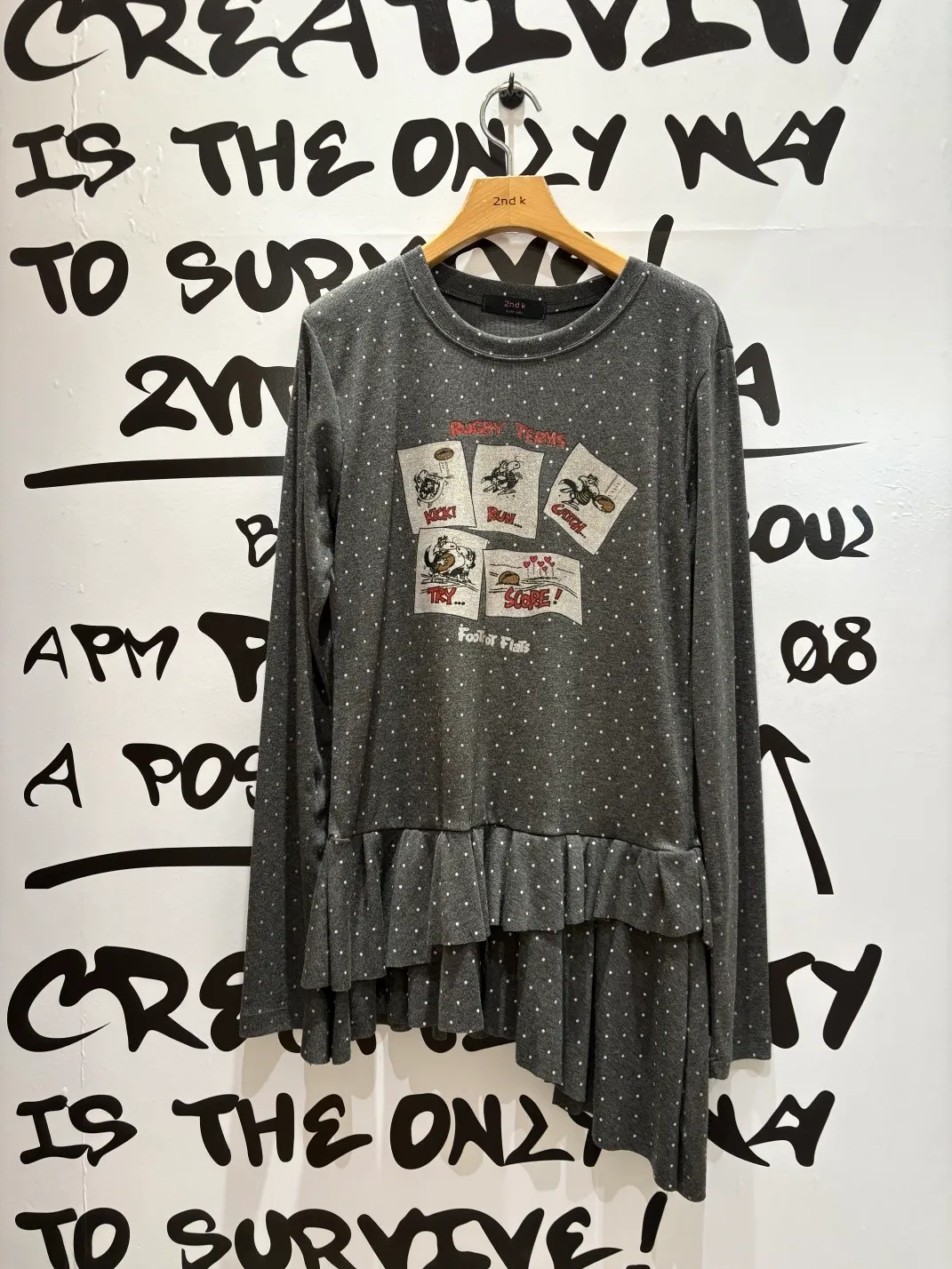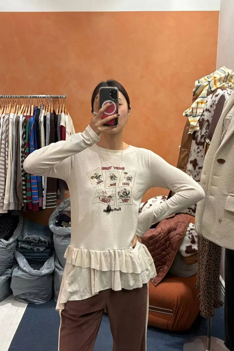 彈性棉料穿起來舒服又包容,S-L妞都可以穿純色款帶磨毛 復古仿舊的漫畫畫框印花超吸睛 穿上就像走進一格一格的分鏡裡,特別到回頭率直接飆高 下擺做成不規則斜邊,加上不對稱的抓折雙層小裙擺剛剛好的長度,可以修飾臀 走路時會悄悄飄動,整件上衣立刻變得俏皮又立體