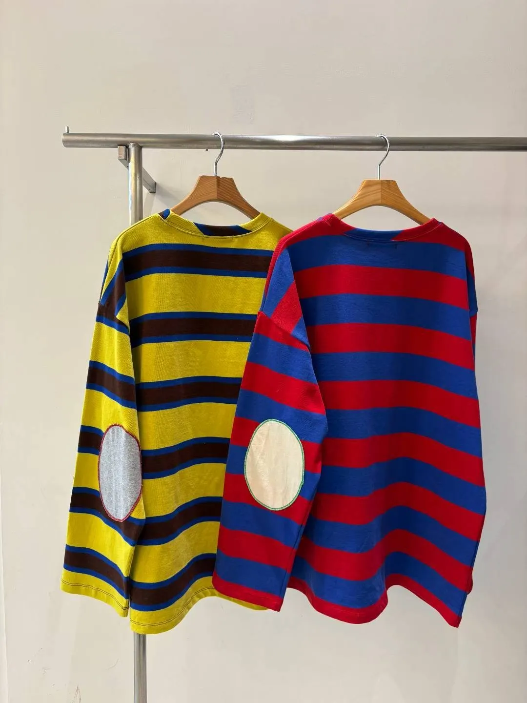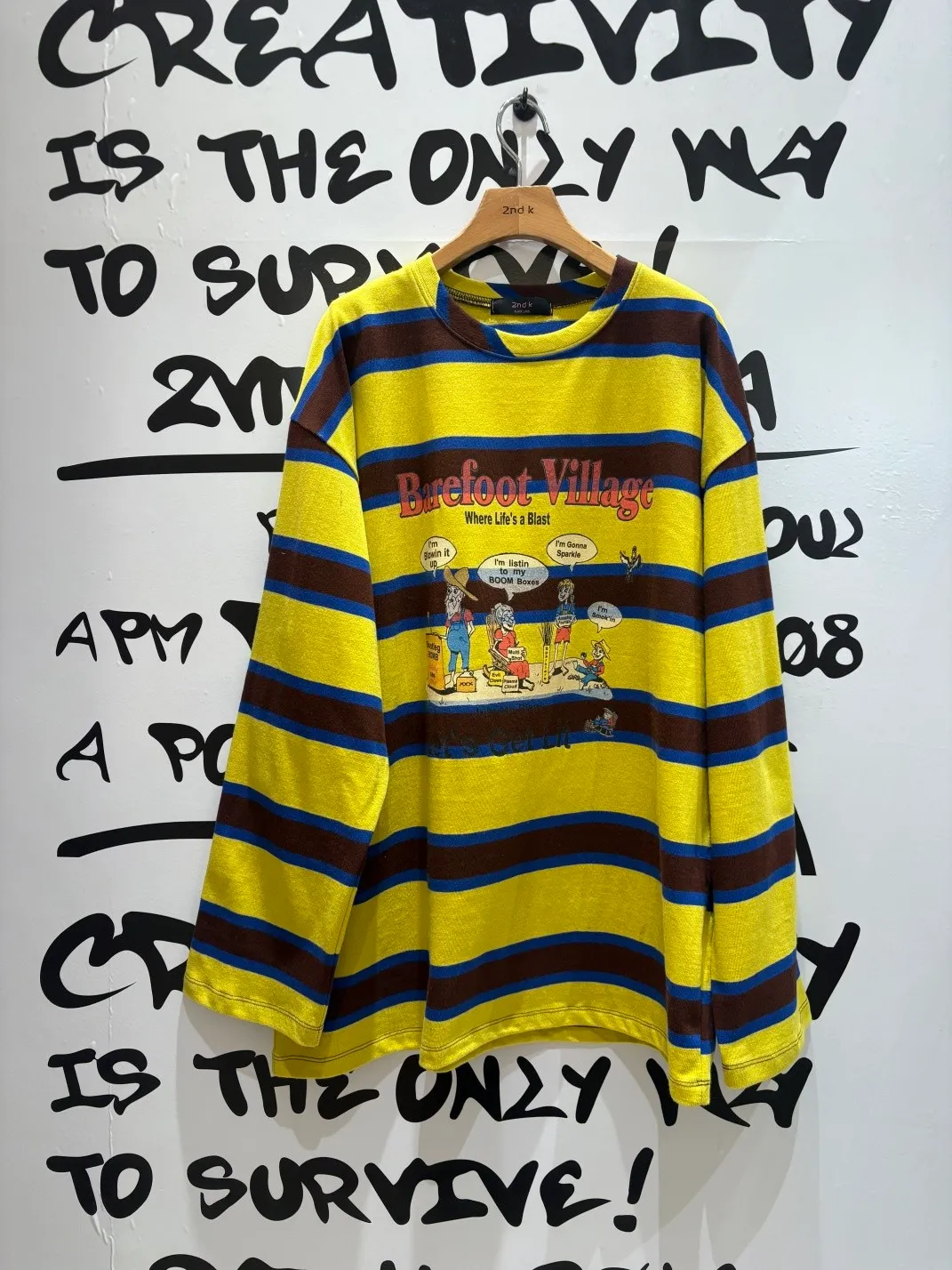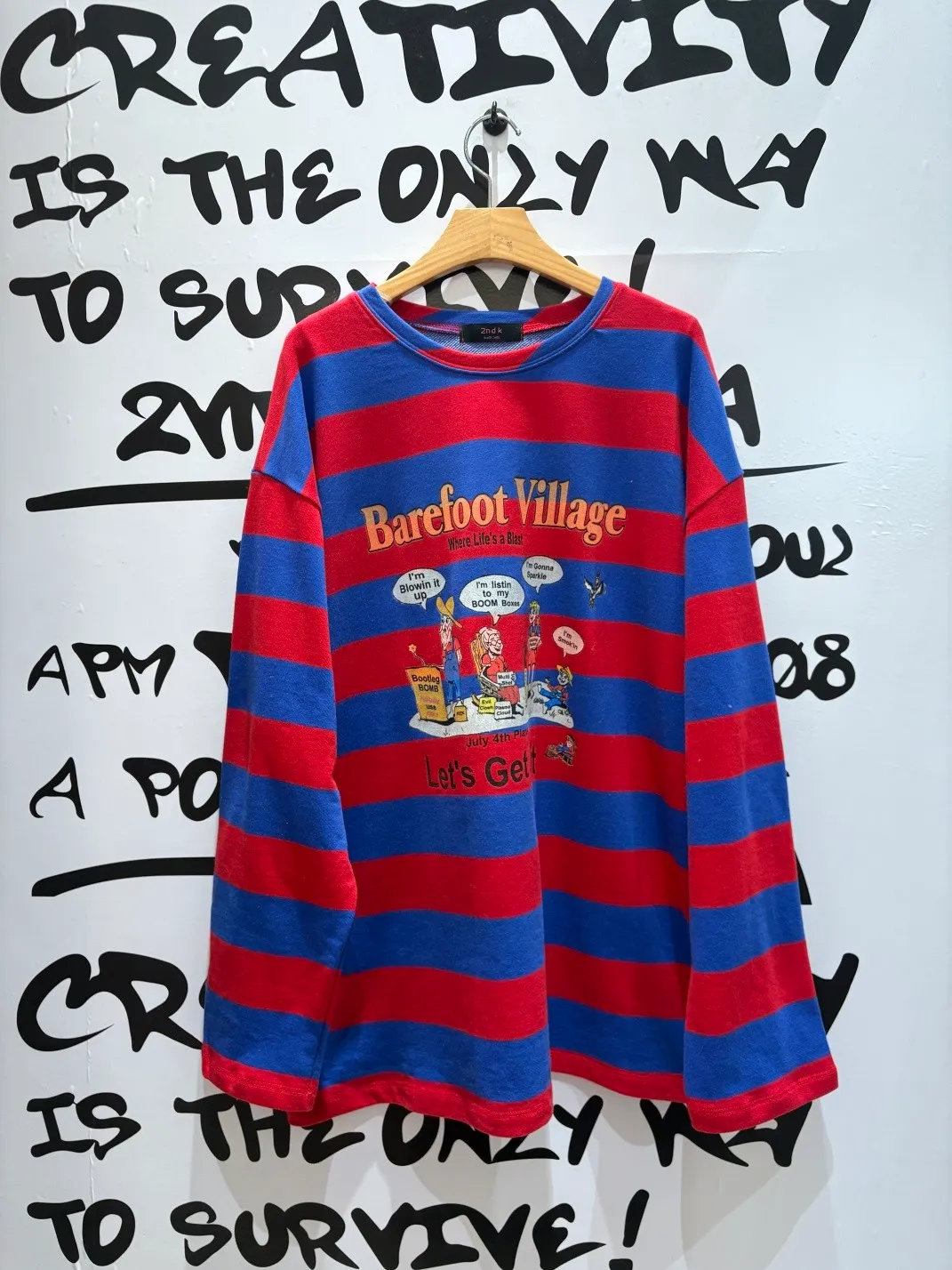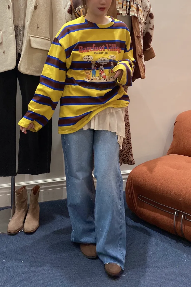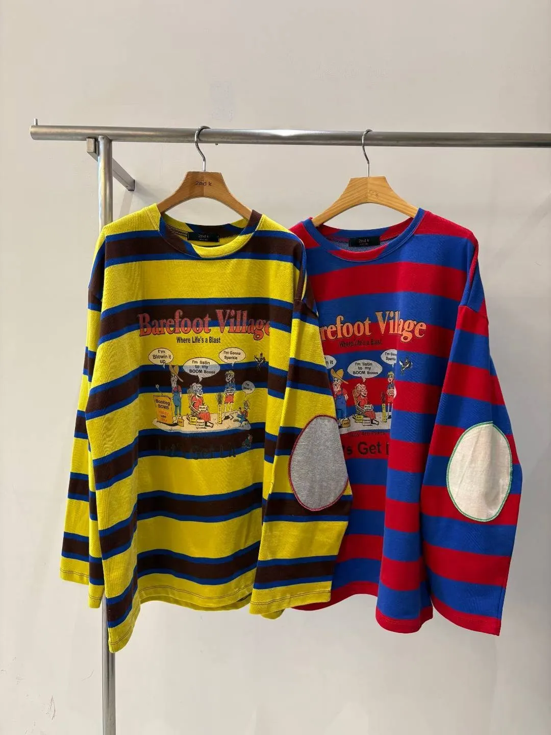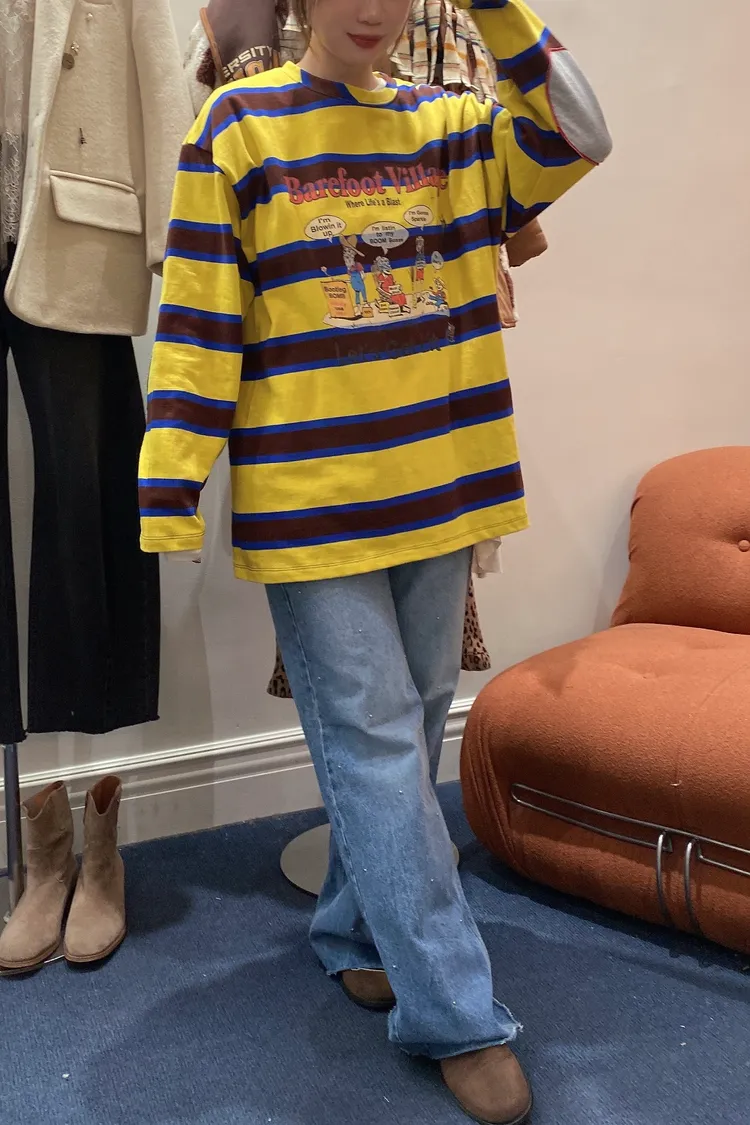 棉料穿起來超舒服,S-XL妞都可以穿 鮮豔撞色條紋一眼就抓住視線 再配上滿版復古美式人物對話漫畫圖案 完全像直接走進漫畫世界,存在感滿分又超級吸睛 兩側手袖還藏著可愛的撞色補丁小心機 舉手投足都是亮點,輕鬆一穿就很有風格