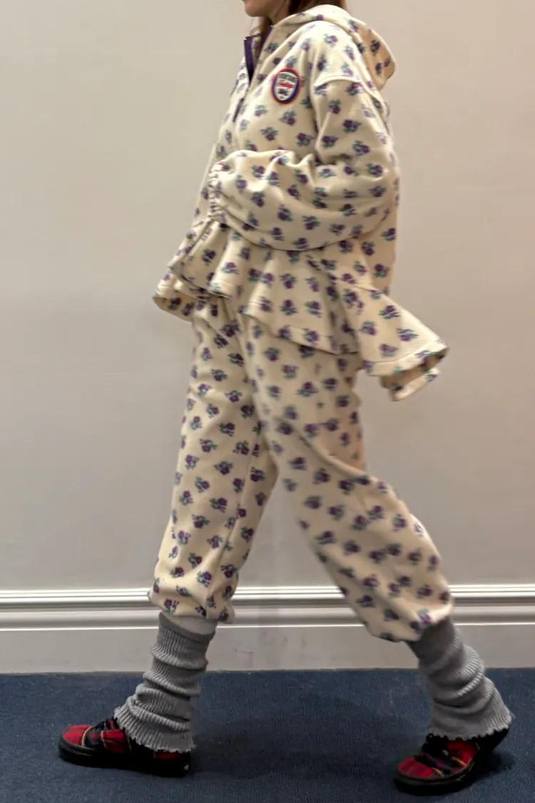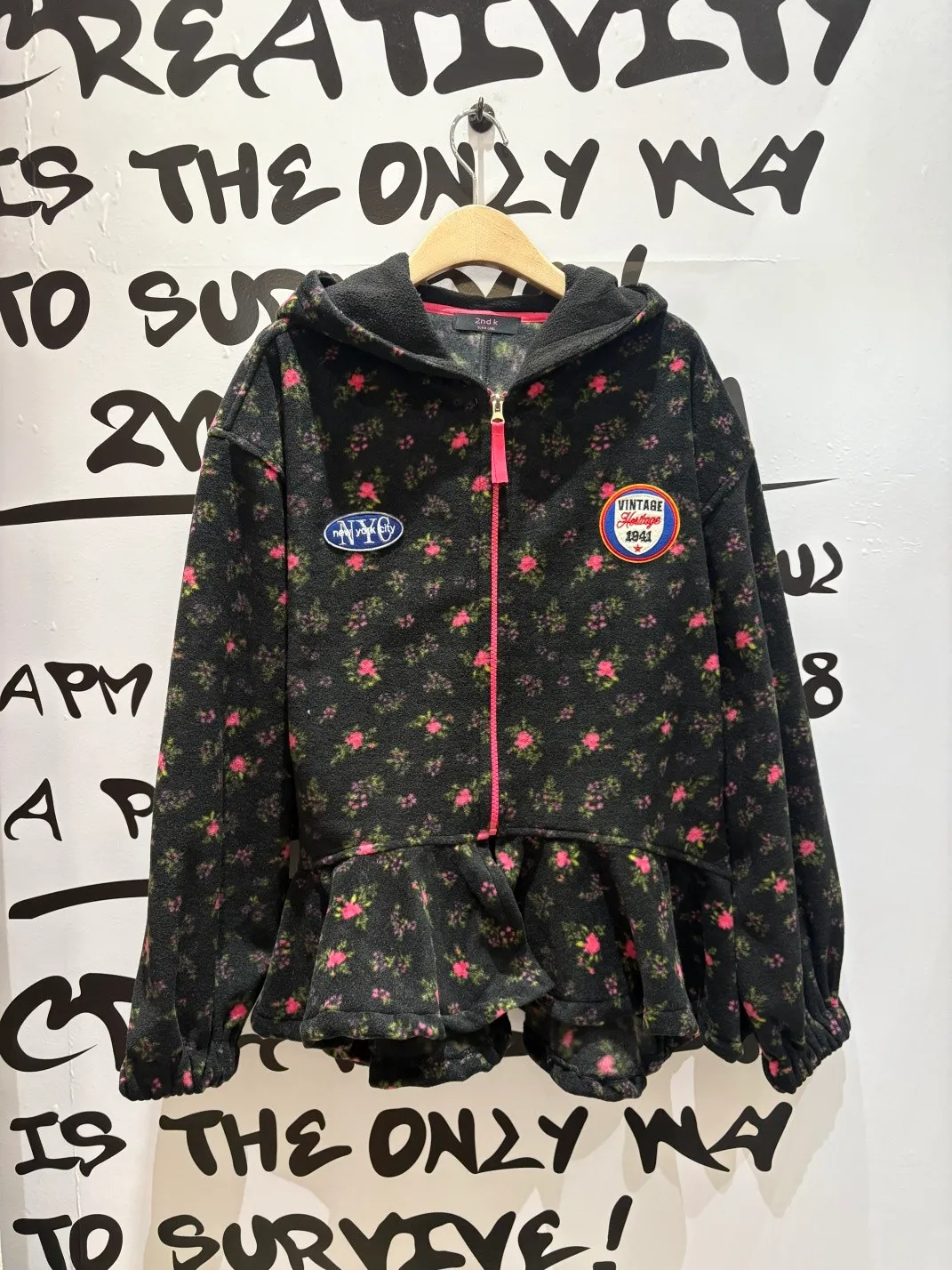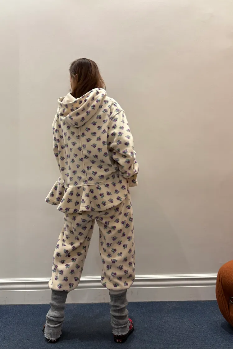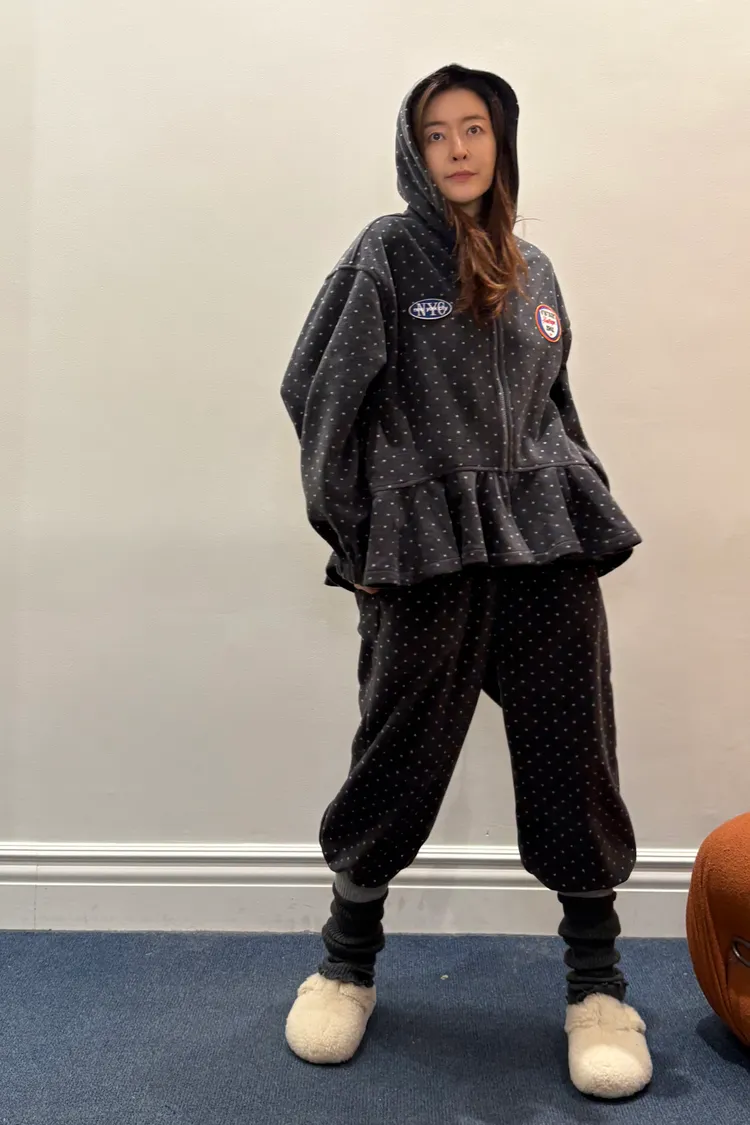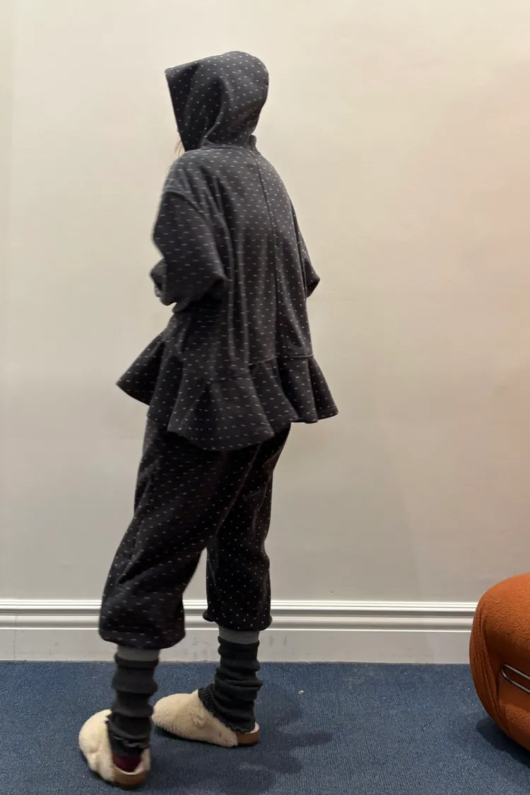 暖呼呼絨料材質,穿起來輕盈又超暖 寬鬆版型,S-L妞都可以穿 連帽外套下擺是立體荷葉小裙擺,前短後長會蓋臀 搭配碎花、點點的可愛印花,和刺繡布章,瞬間多一點少女感、有口袋 長褲腰部整圈彈性鬆緊、有口袋 褲腳特別做了彈性毛料拼接,像自帶襪套一樣 不用再額外搭襪子,直接幫妞配好 保暖和造型一次完成
