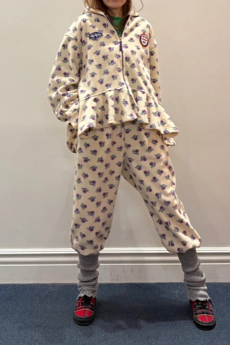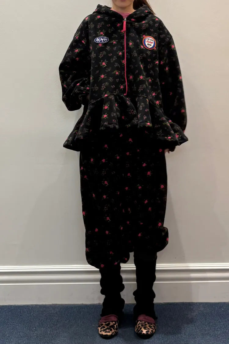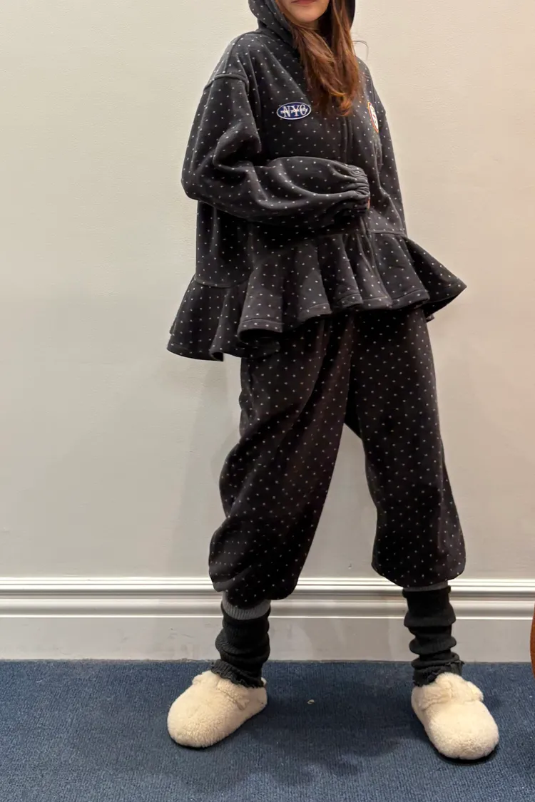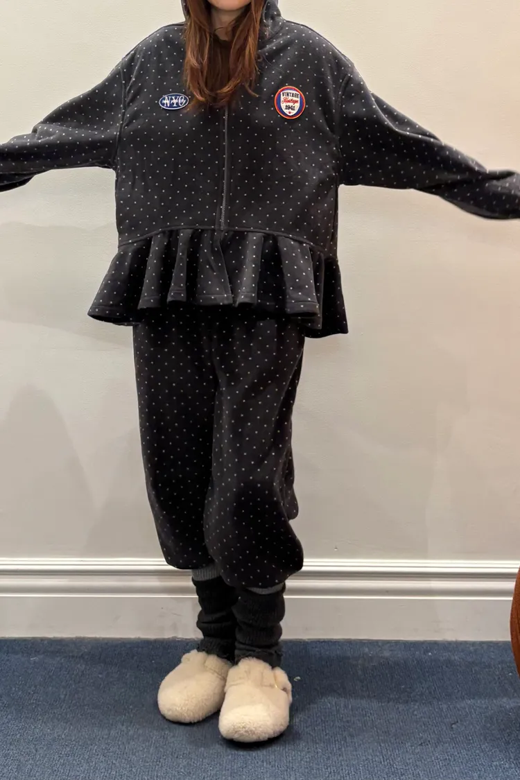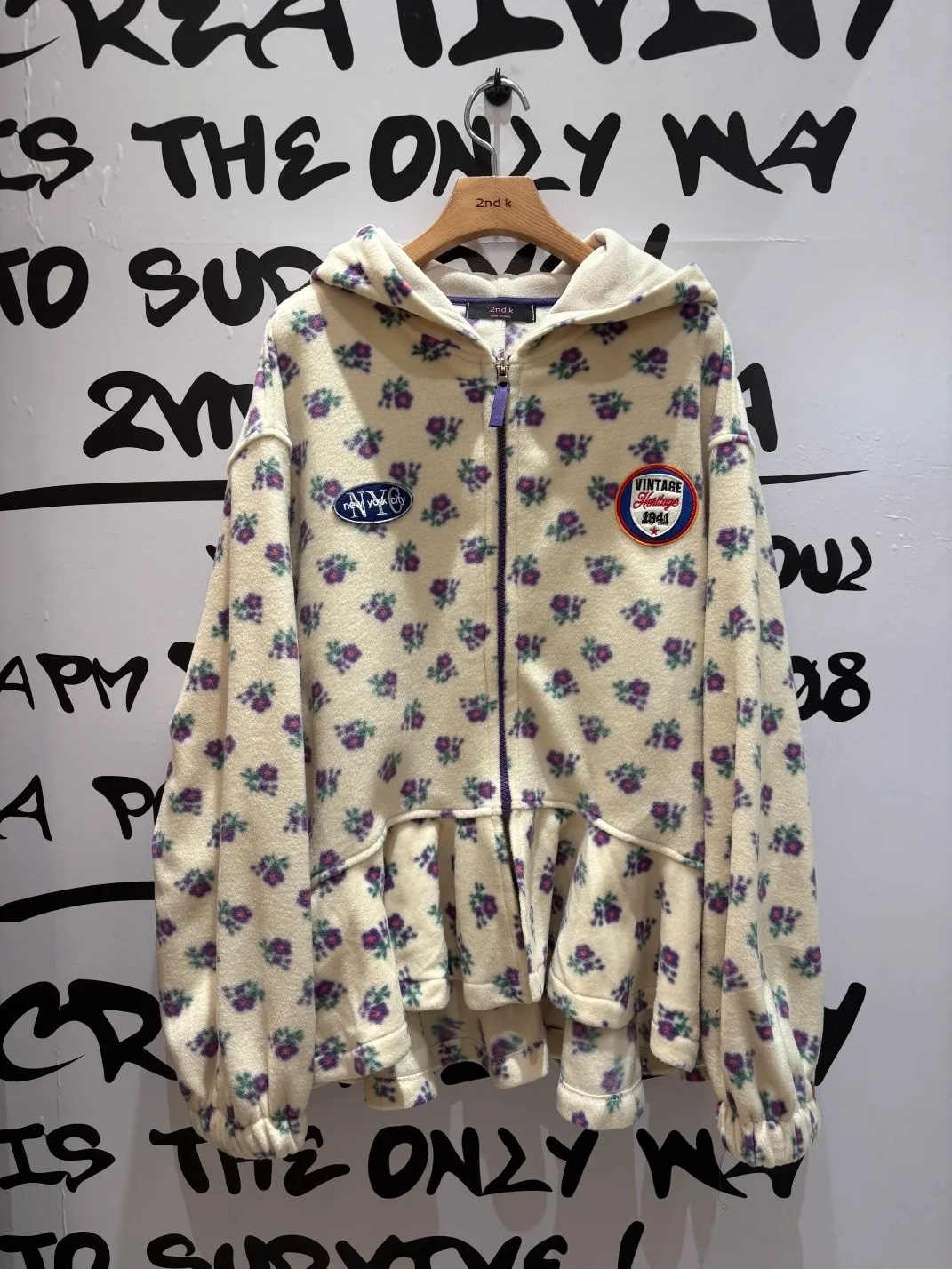暖呼呼絨料材質,穿起來輕盈又超暖 寬鬆版型,S-L妞都可以穿 連帽外套下擺是立體荷葉小裙擺,前短後長會蓋臀 搭配碎花、點點的可愛印花,和刺繡布章,瞬間多一點少女感、有口袋 長褲腰部整圈彈性鬆緊、有口袋 褲腳特別做了彈性毛料拼接,像自帶襪套一樣 不用再額外搭襪子,直接幫妞配好 保暖和造型一次完成