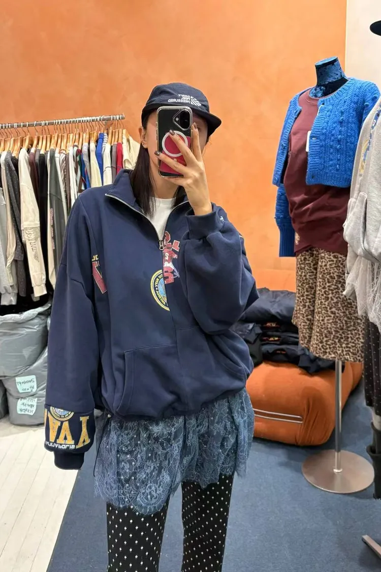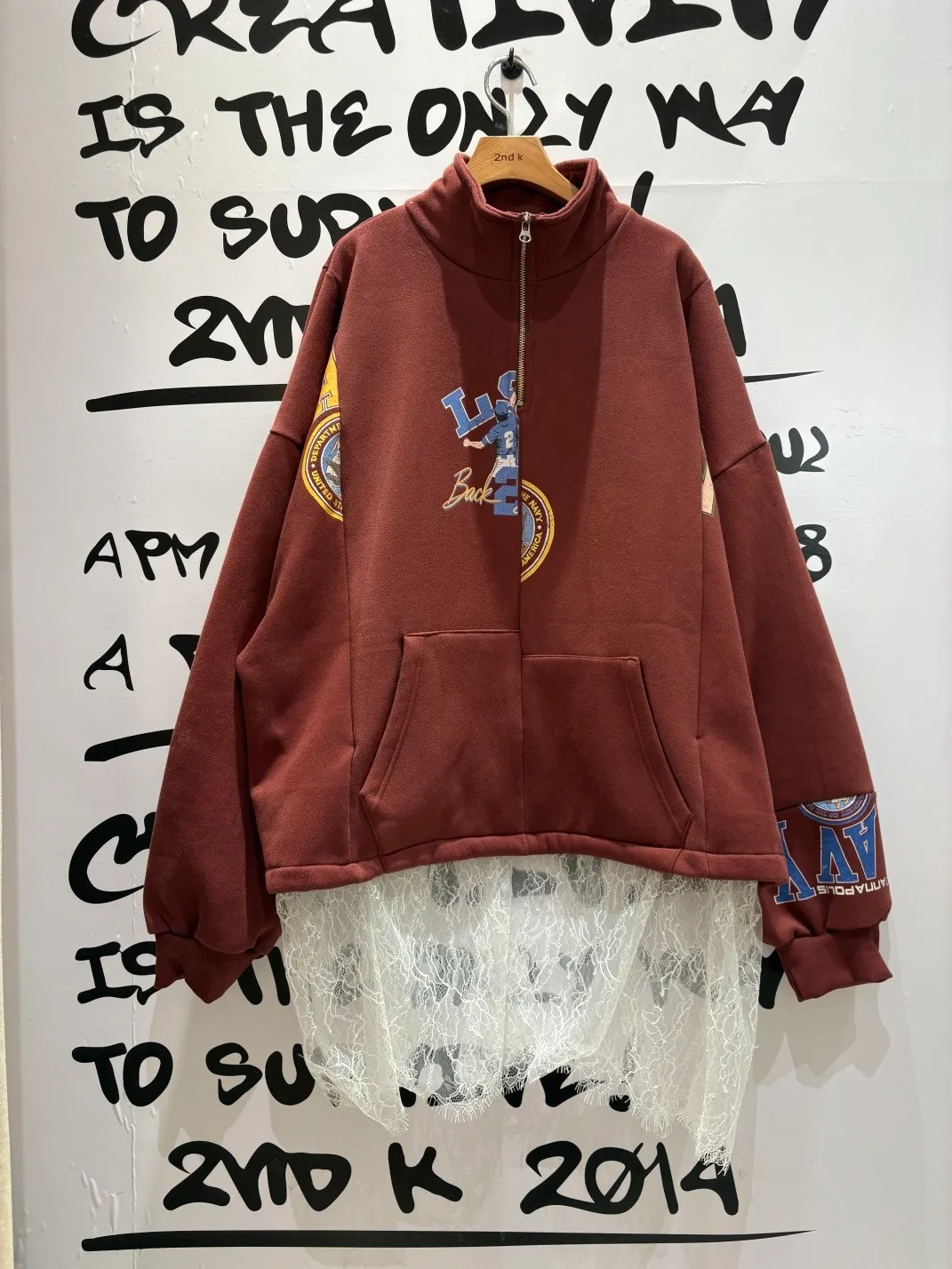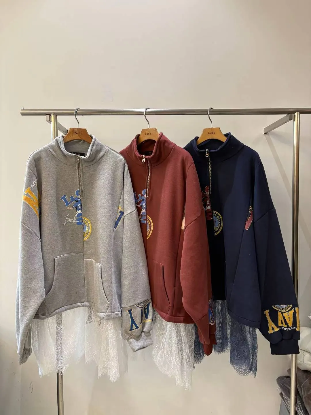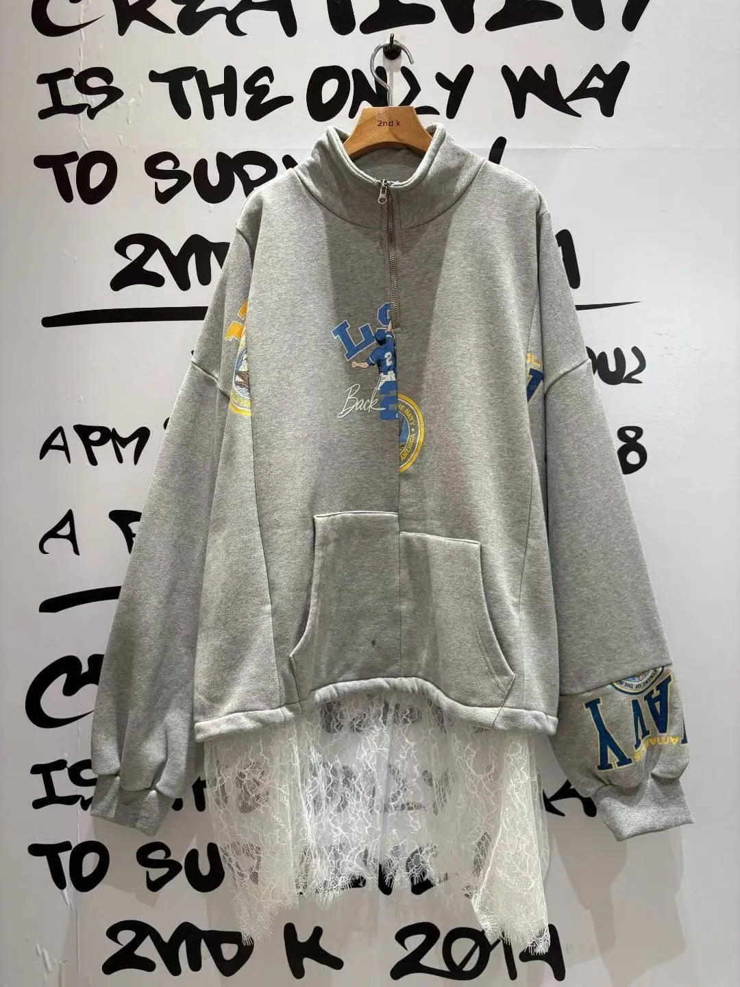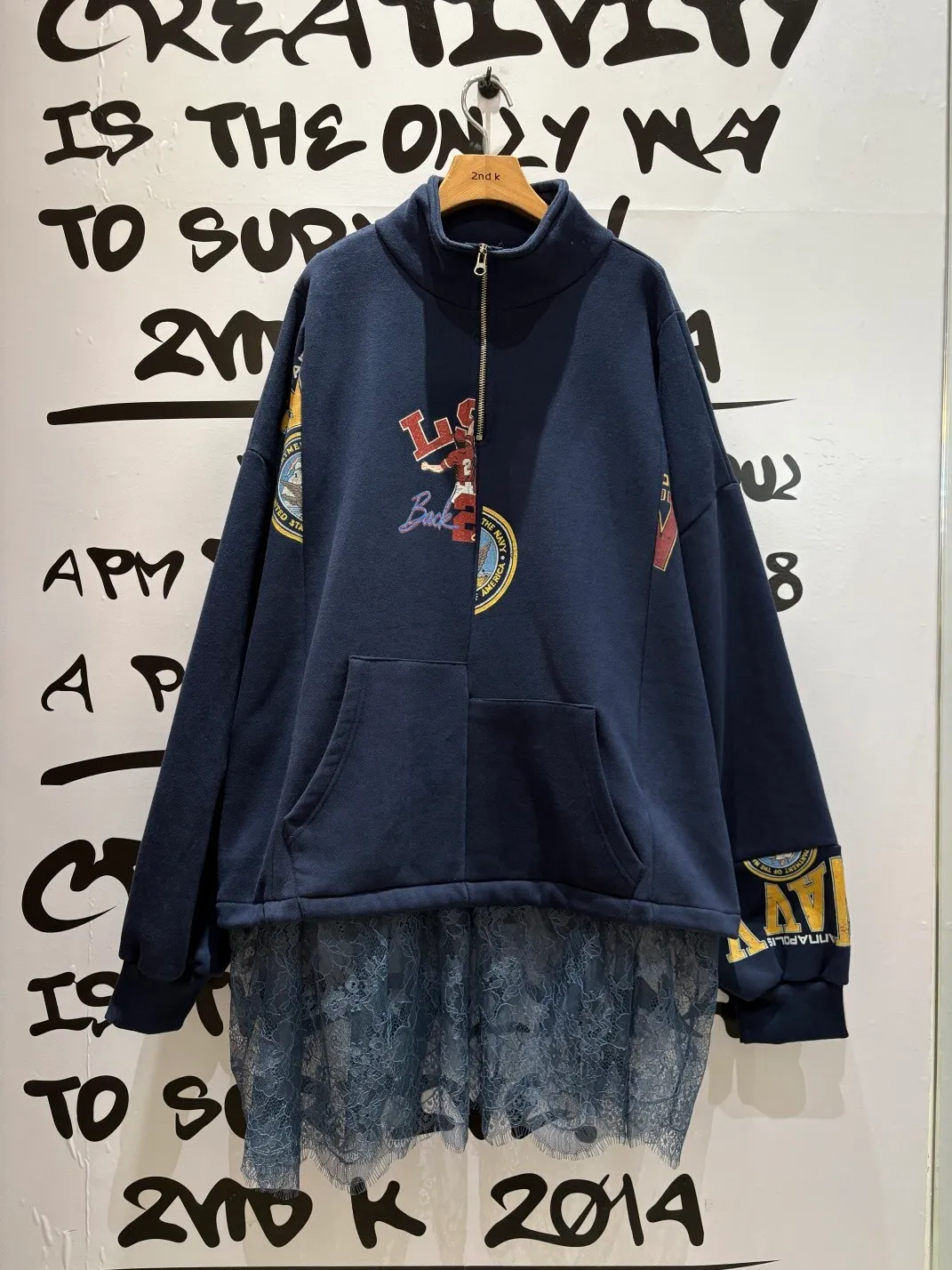 棉料材質穿起來超舒服、內裡有加絨落肩立領寬鬆蓋臀版型超顯瘦 S-XL妞都可以穿 不規則拼接搭上運動風標誌印花,整體帶點街頭個性感 睫毛蕾絲拼接下襬,蕾絲有鈕扣可拆卸 零難度切換「酷帥運動」或「甜甜小女人」兩種風格 下擺抽繩讓版型更好調整,想挺想鬆都 OK 有口袋