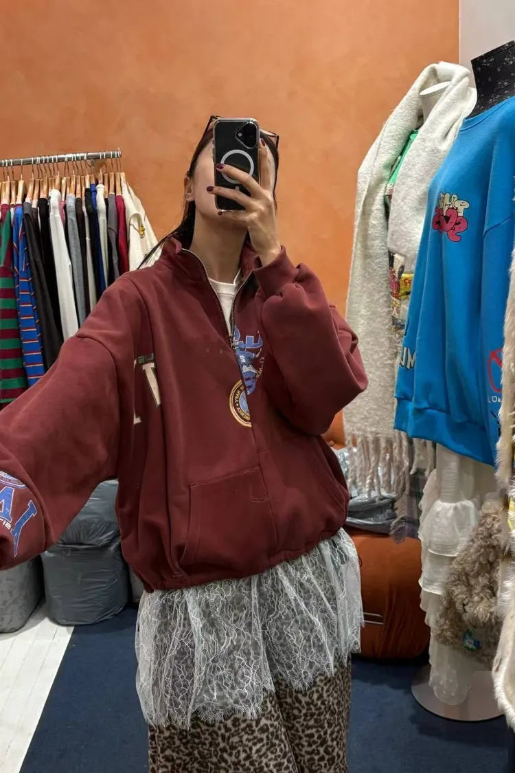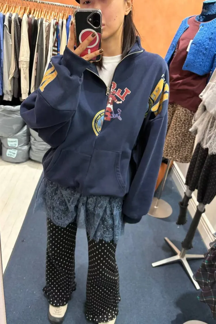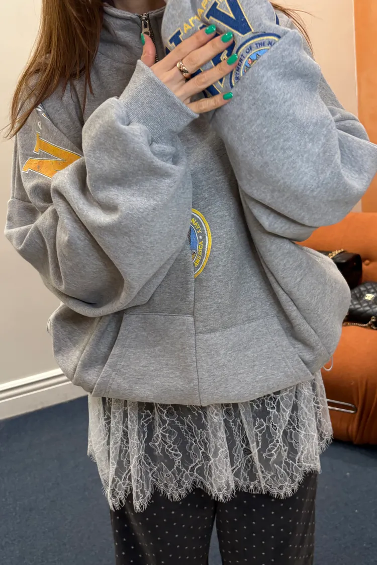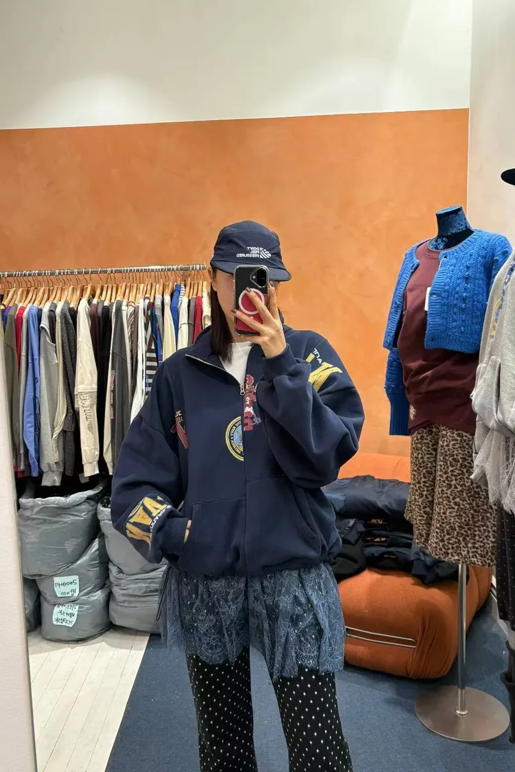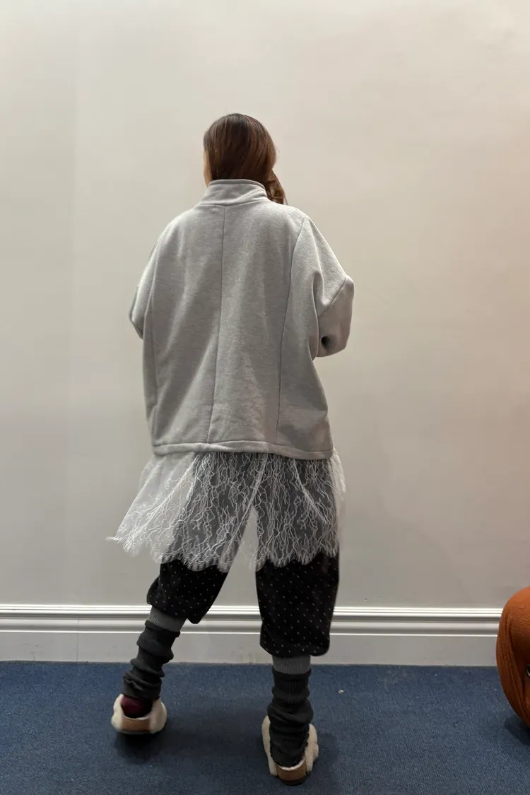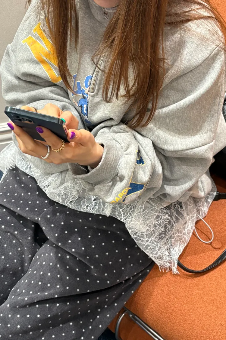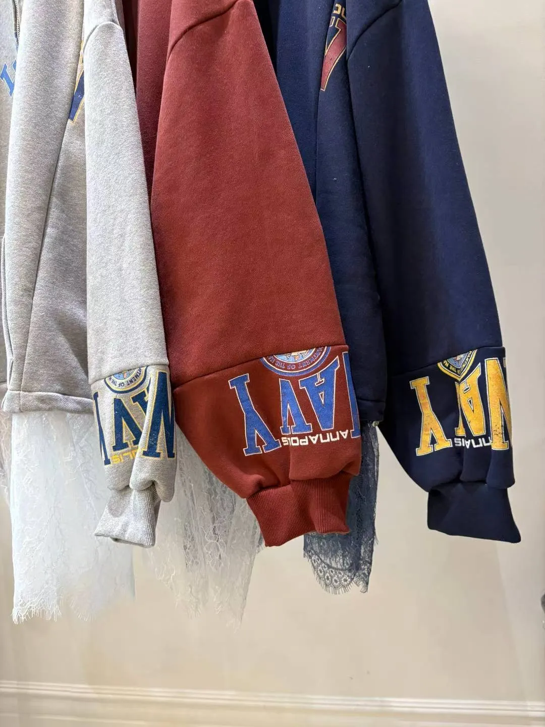 棉料材質穿起來超舒服、內裡有加絨落肩立領寬鬆蓋臀版型超顯瘦 S-XL妞都可以穿 不規則拼接搭上運動風標誌印花,整體帶點街頭個性感 睫毛蕾絲拼接下襬,蕾絲有鈕扣可拆卸 零難度切換「酷帥運動」或「甜甜小女人」兩種風格 下擺抽繩讓版型更好調整,想挺想鬆都 OK 有口袋