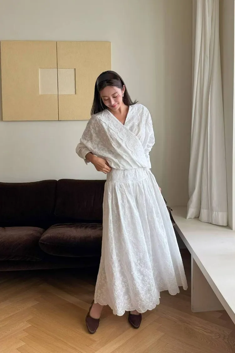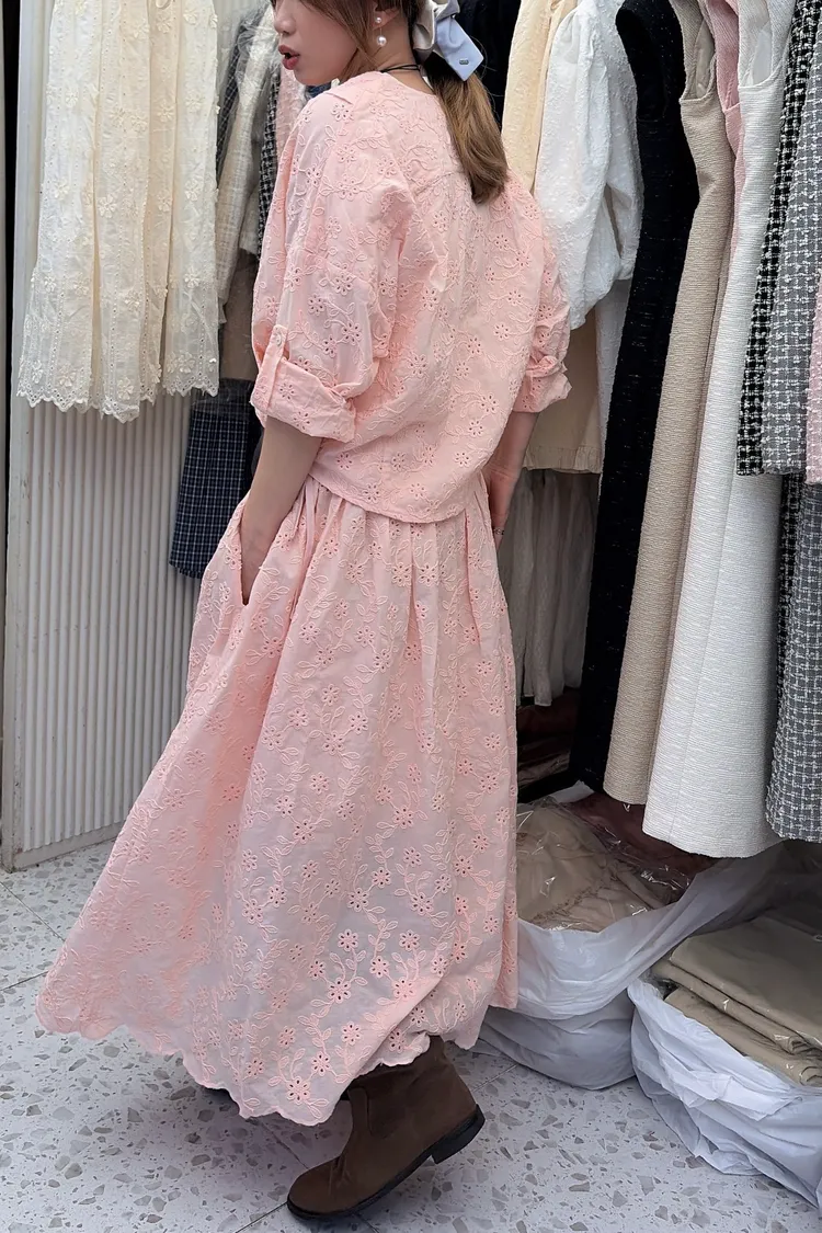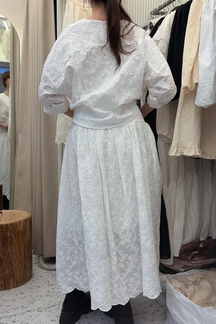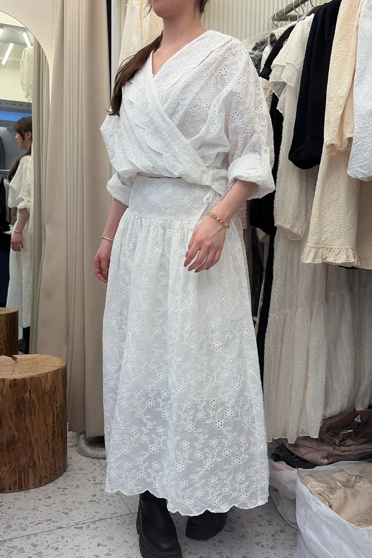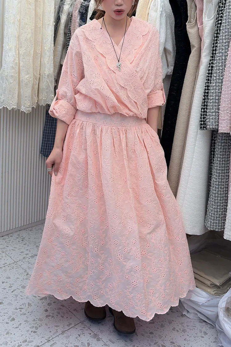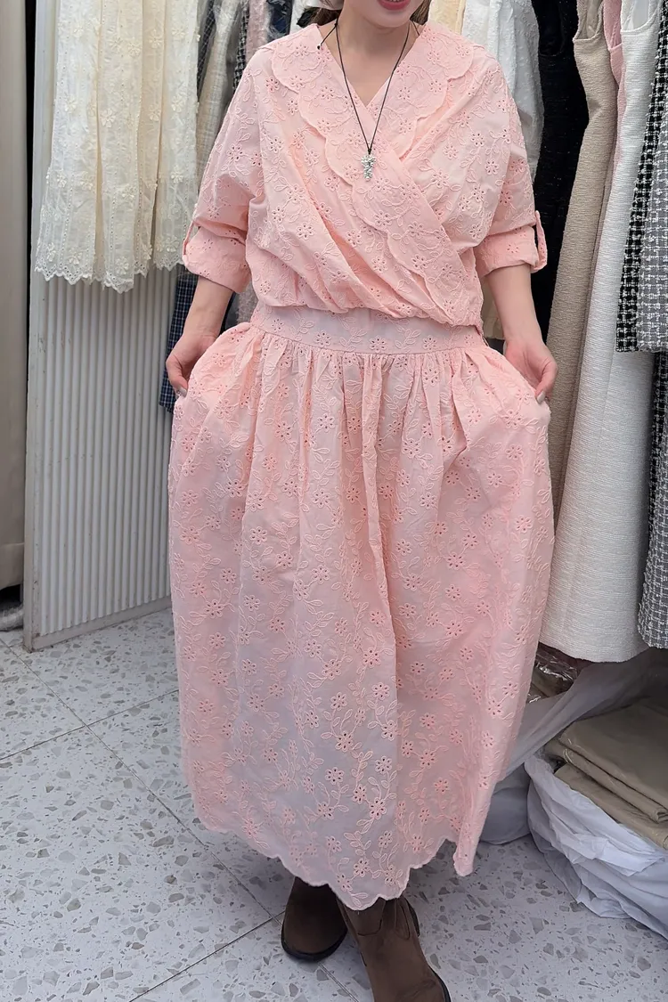 刺繡布蕾絲,搭配交叉V領拼接花瓣花邊,細節精緻又有仙氣上衣正面彈性鬆緊花苞造型設計,背面傘狀,前短後長增添俏皮甜美感手袖有作扣子,可以反折扣上長裙腰部抽繩調節、搭配鈕扣,S-L妞都可以穿穿上就能展現仙氣浪漫又甜美的日常氛圍有口袋,有內襯