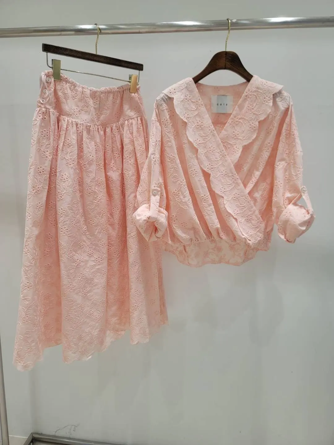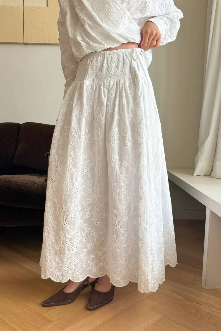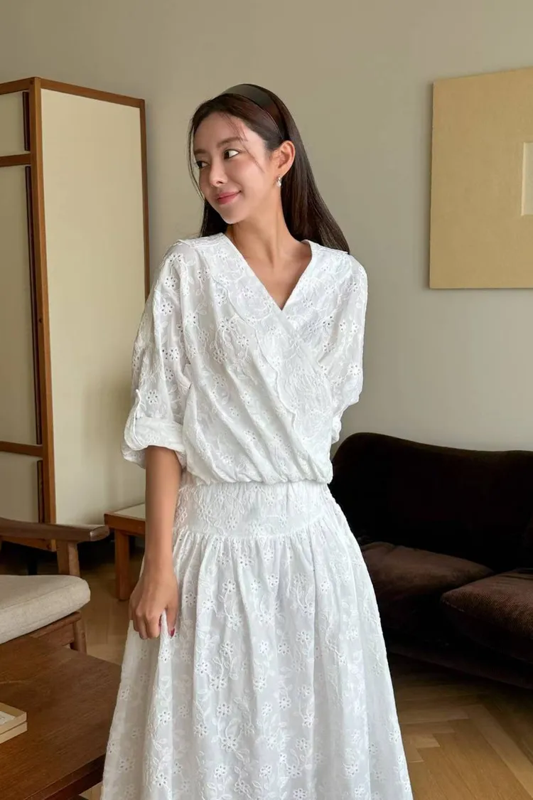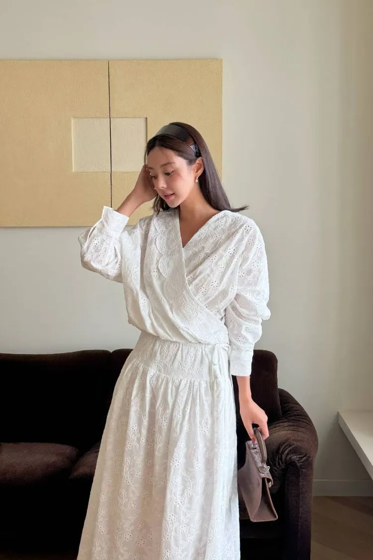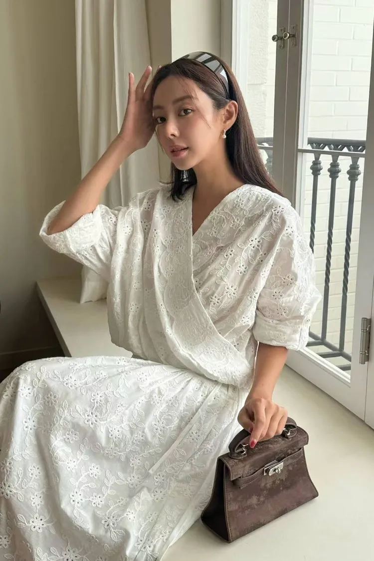 刺繡布蕾絲,搭配交叉V領拼接花瓣花邊,細節精緻又有仙氣上衣正面彈性鬆緊花苞造型設計,背面傘狀,前短後長增添俏皮甜美感手袖有作扣子,可以反折扣上長裙腰部抽繩調節、搭配鈕扣,S-L妞都可以穿穿上就能展現仙氣浪漫又甜美的日常氛圍有口袋,有內襯