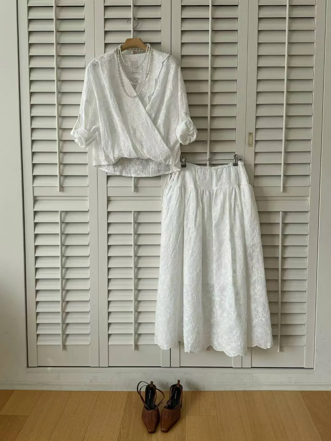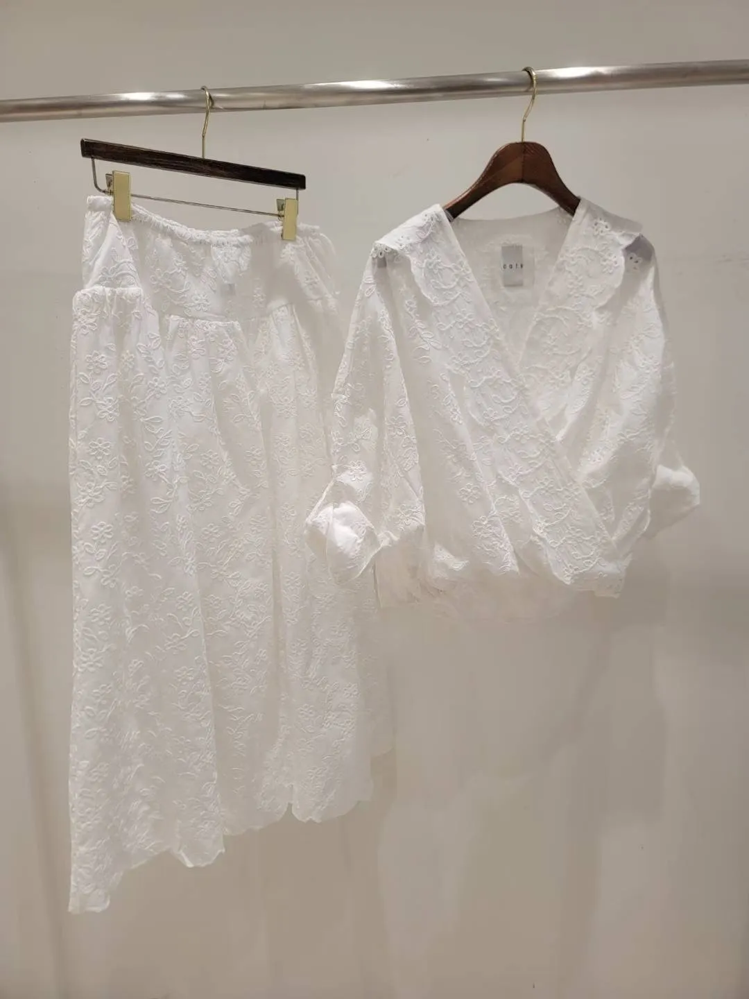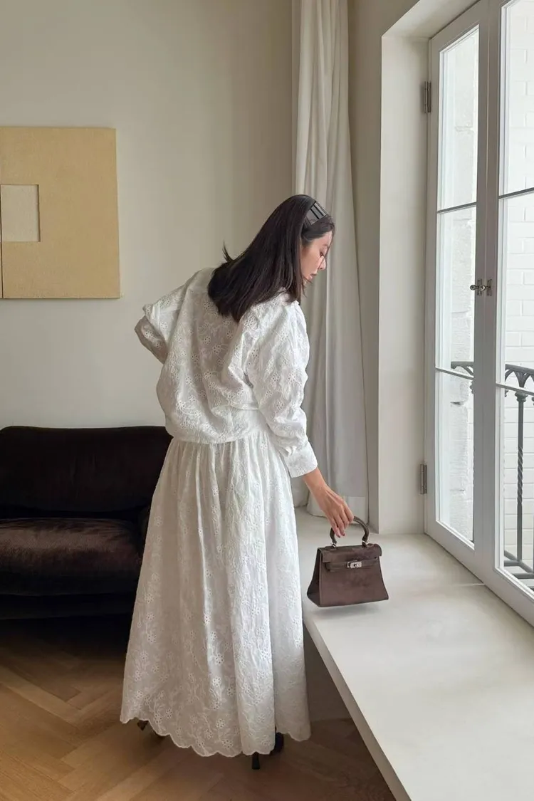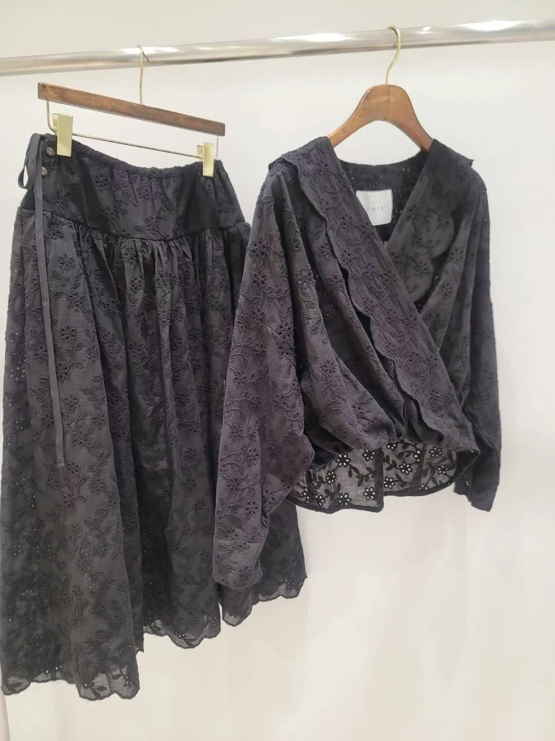 刺繡布蕾絲,搭配交叉V領拼接花瓣花邊,細節精緻又有仙氣上衣正面彈性鬆緊花苞造型設計,背面傘狀,前短後長增添俏皮甜美感手袖有作扣子,可以反折扣上長裙腰部抽繩調節、搭配鈕扣,S-L妞都可以穿穿上就能展現仙氣浪漫又甜美的日常氛圍有口袋,有內襯