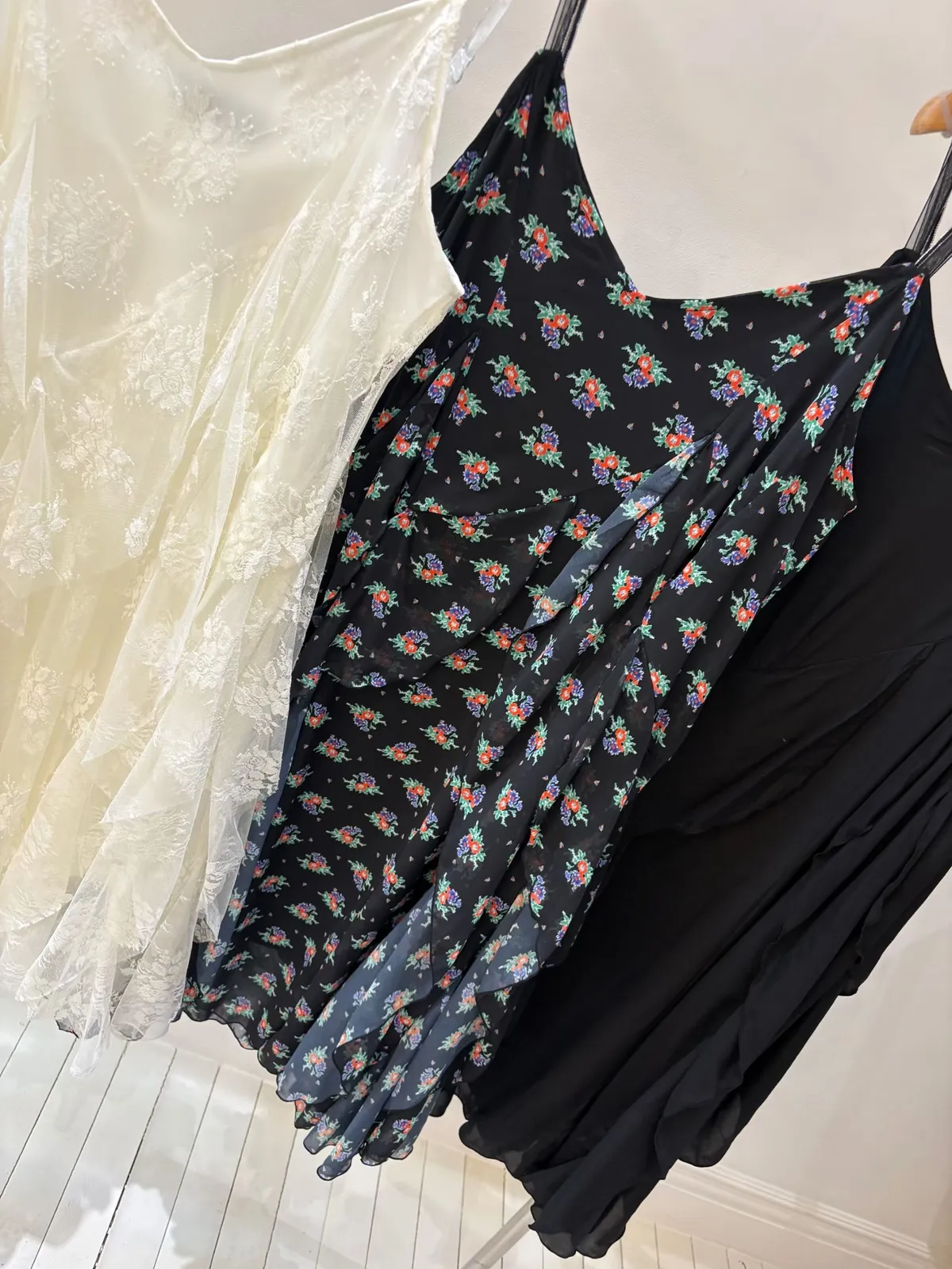 輕鬆穿出韓系感的飄逸氣質 相同版型,三色都是不同面料 白蕾絲非常柔軟輕飄飄~巨仙 黑印花是輕薄雪紡面料,飄逸又清爽 純黑款是帶有光澤感的絲光面料,整體更有質感與氣場 不規則斜裁層次裙擺,整體線條非常有設計感 寬鬆版型,S-XL妞都可以穿 有內襯、肩帶是網紗材質可以調 韓國熱銷色是黑印花