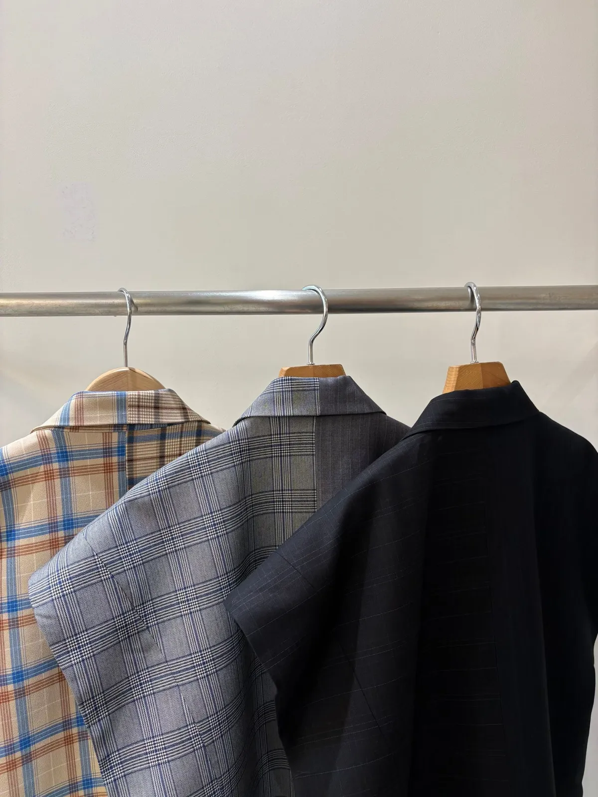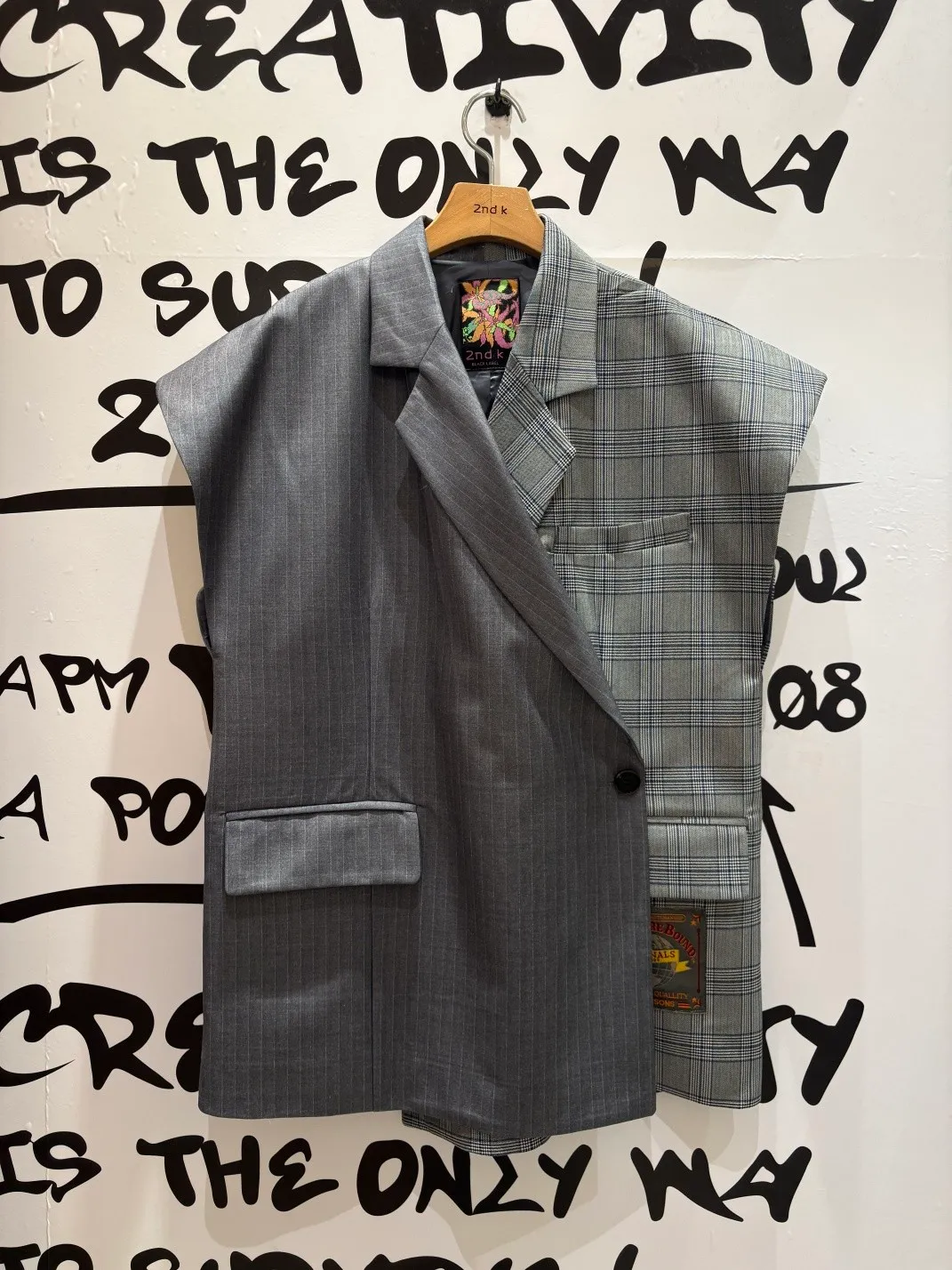 不對稱拼接聚脂纖維格紋西裝面料,質感挺括又有型
