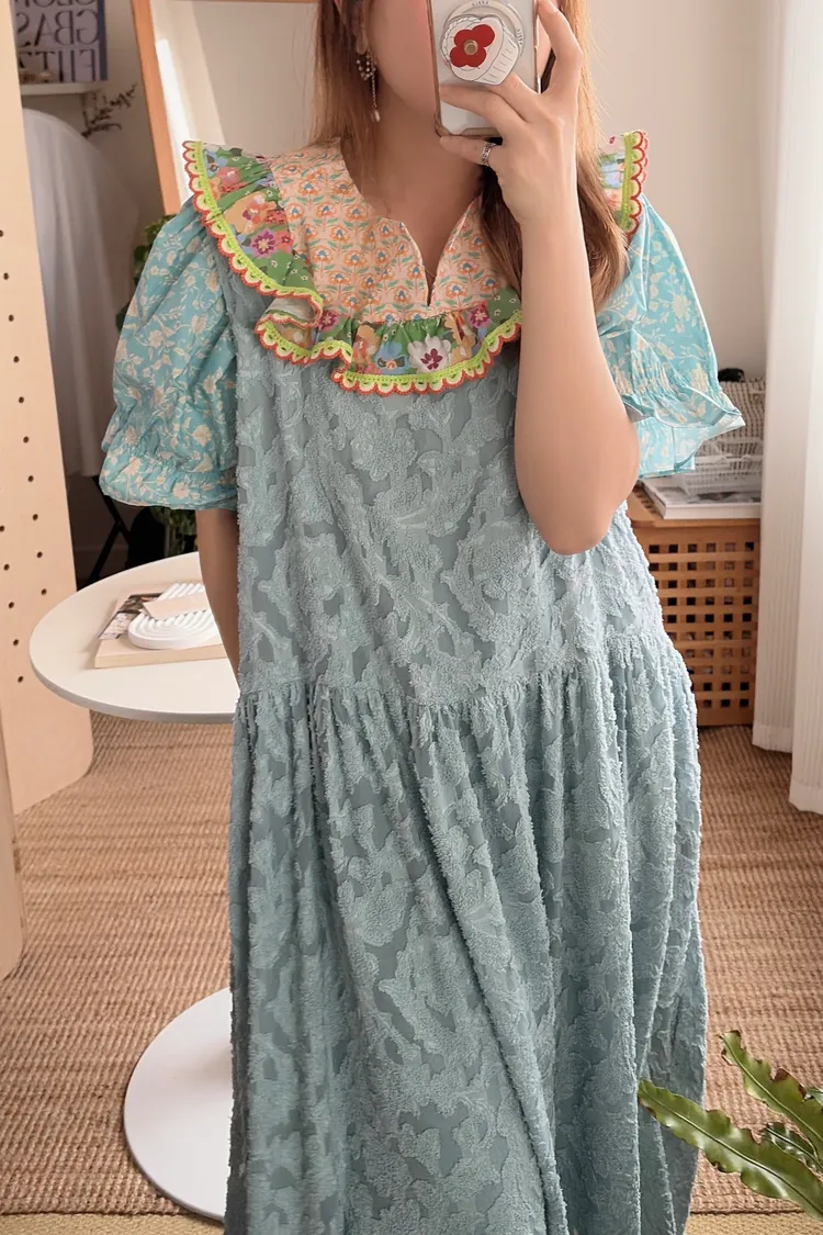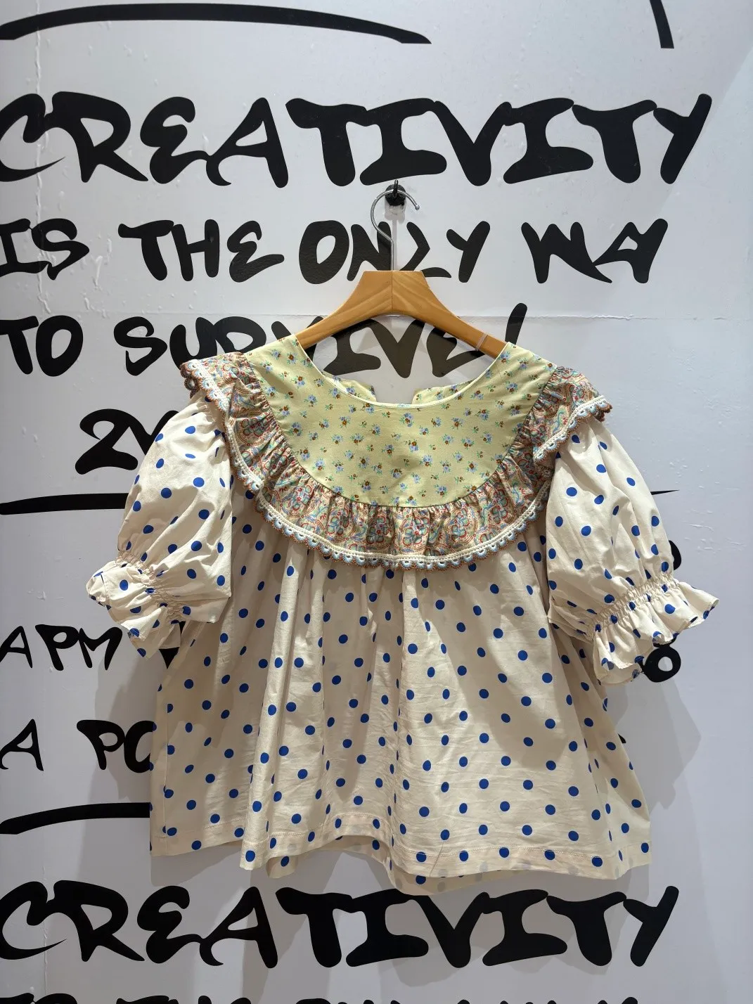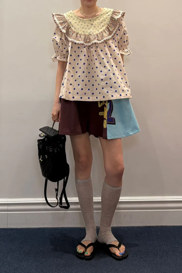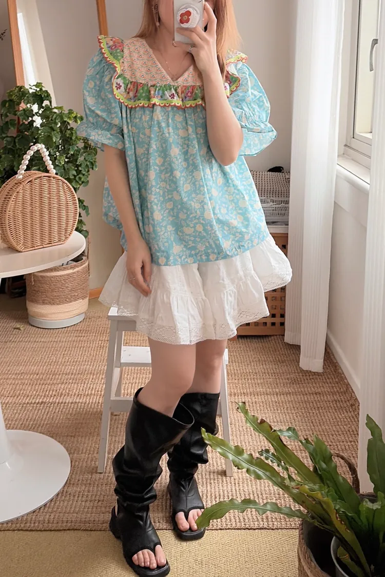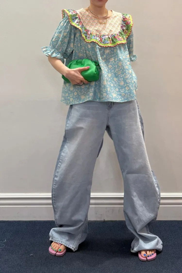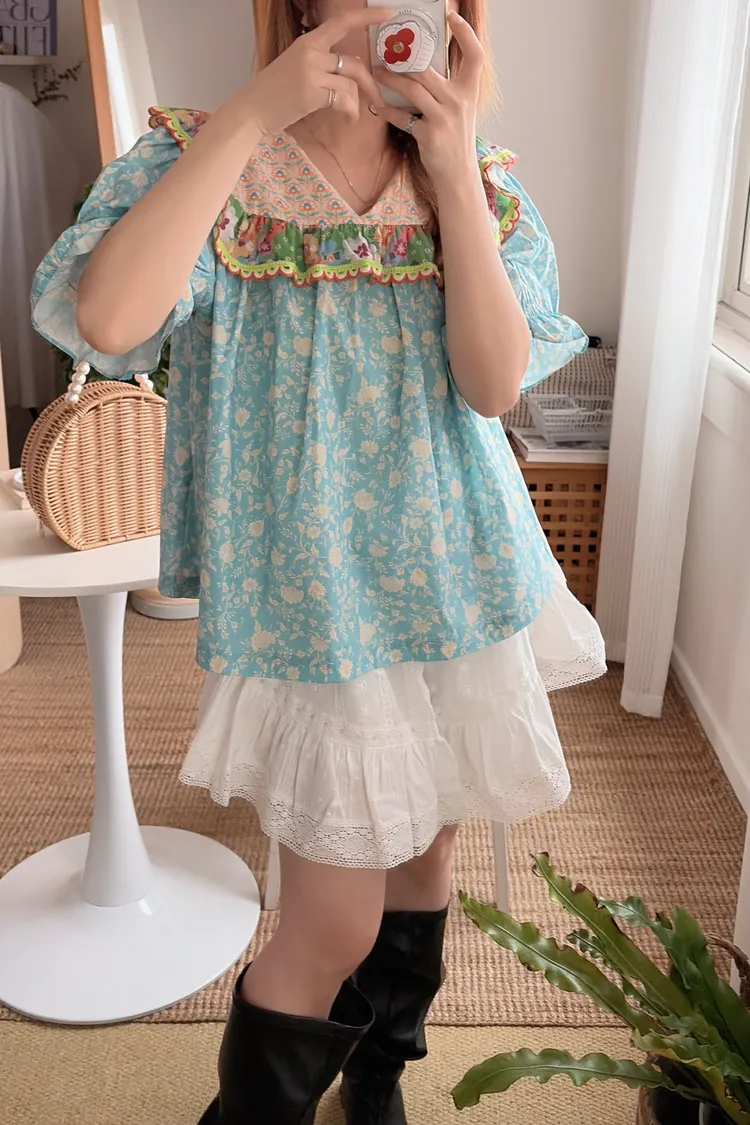 歐膩最拿手的印花拼接設計來囉! 一件直接給你三種印花的層次感 小碎花、點點到復古圖樣拼接 每一面都像精心搭好的穿搭,完全不無聊,越看越有味 棉料材質,寬鬆傘狀版型,S-L妞都可以穿 正反兩穿,一面是圓領、一面是小V領 圓領還特別做了刺繡撞色織帶滾邊,讓整體更有設計感 再搭配蓬蓬袖,復古中帶點俏皮