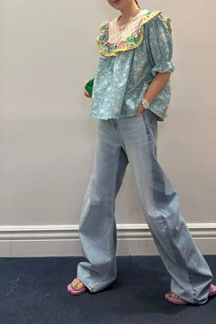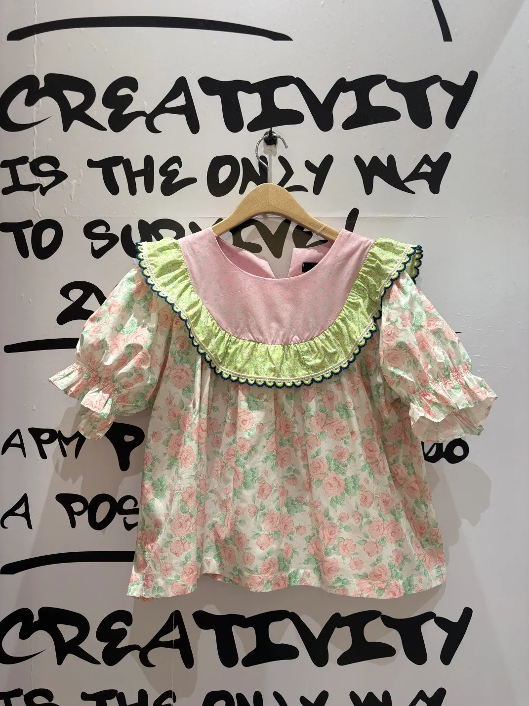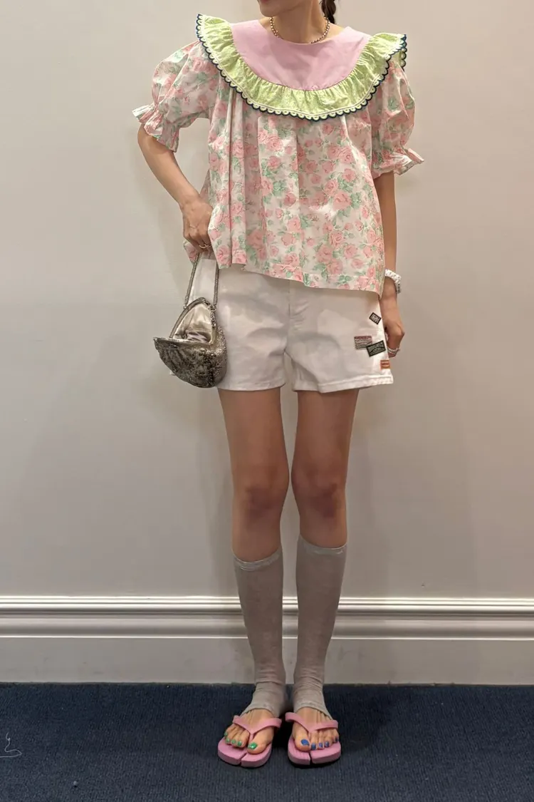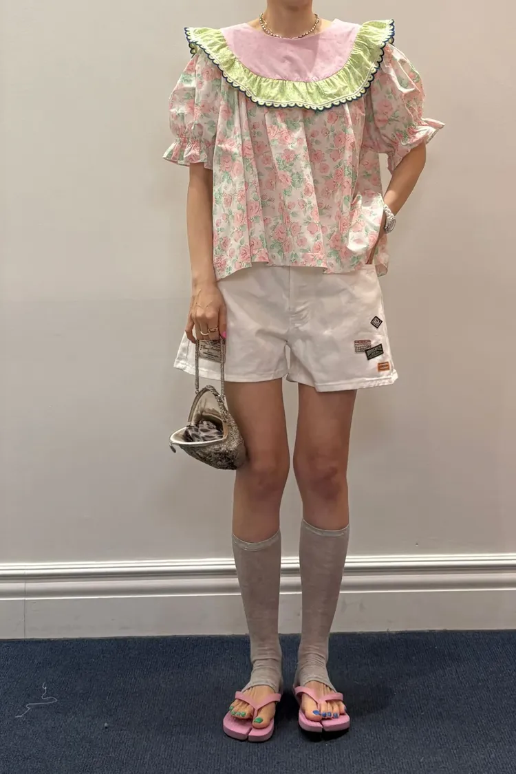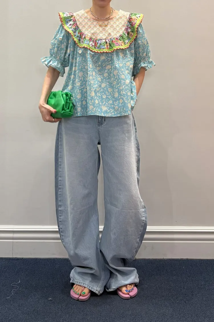 歐膩最拿手的印花拼接設計來囉! 一件直接給你三種印花的層次感 小碎花、點點到復古圖樣拼接 每一面都像精心搭好的穿搭,完全不無聊,越看越有味 棉料材質,寬鬆傘狀版型,S-L妞都可以穿 正反兩穿,一面是圓領、一面是小V領 圓領還特別做了刺繡撞色織帶滾邊,讓整體更有設計感 再搭配蓬蓬袖,復古中帶點俏皮